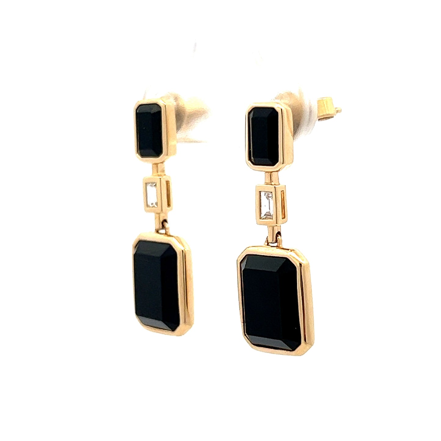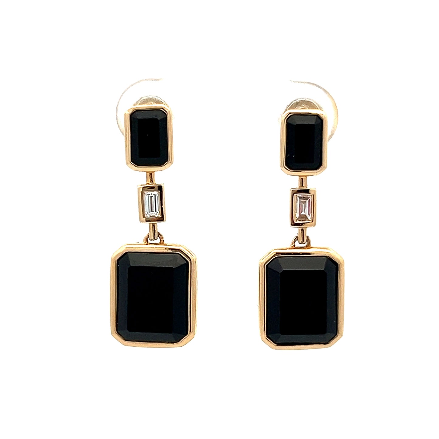 These striking earrings feature emerald cut black onyx and diamonds. The two larger onyx pieces measures 8.00 x 10.00 mm and are bezel-set in 14 karat yellow gold, creating a dramatic and elegant look. Accentuating the onyx are baguette cut diamonds, weighing .11 carats, with VS2 clarity and an H color grade, adding sparkle that complements the rich black of the onyx. The polished yellow gold enhances the overall appeal, making these earrings perfect for both day and night wear.