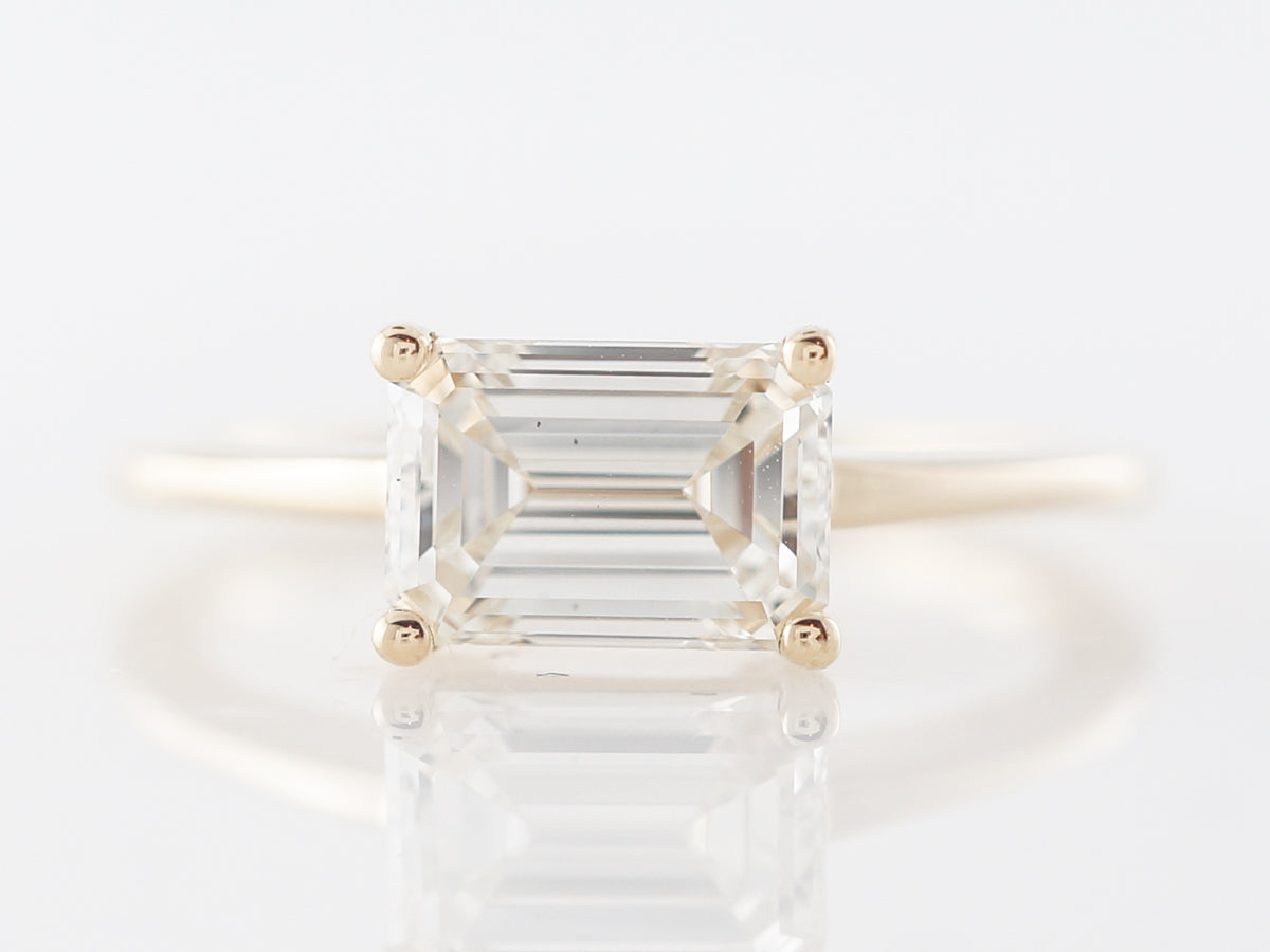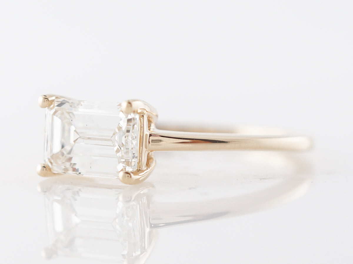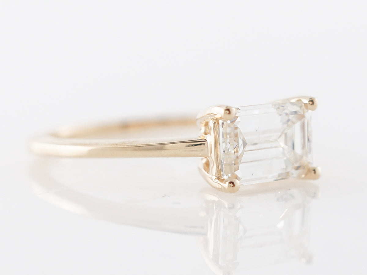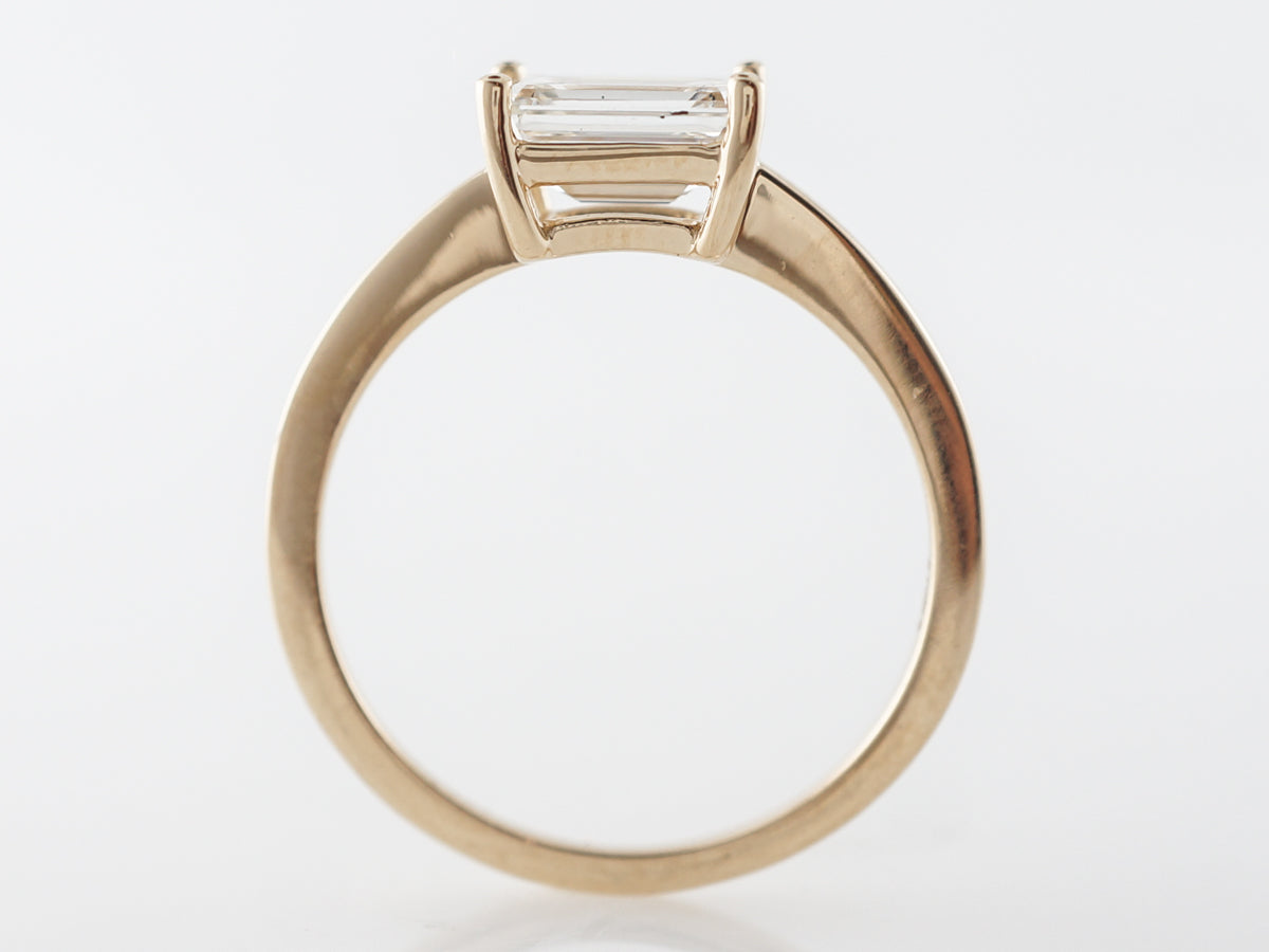 Emerald Cut Diamond Solitaire Engagement Ring in Yellow Gold. This dazzling emerald cut 1.30 carat diamond is prong set in 14 karat yellow gold. The emerald cut diamond evokes the class of Grace Kelly in a timeless solitaire design. The four prong setting features a simple and refined design. The slightly raised center stone allows an wedding band to sit flush against this high polish 14 karat yellow gold setting.