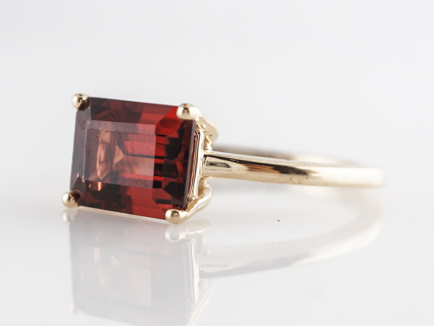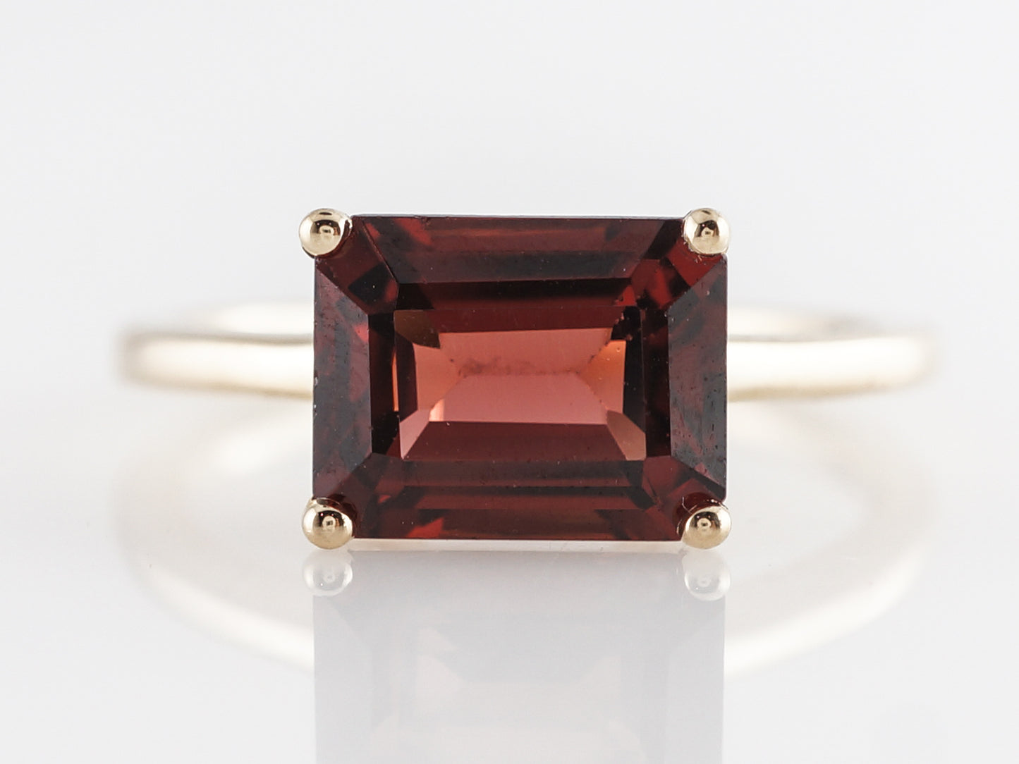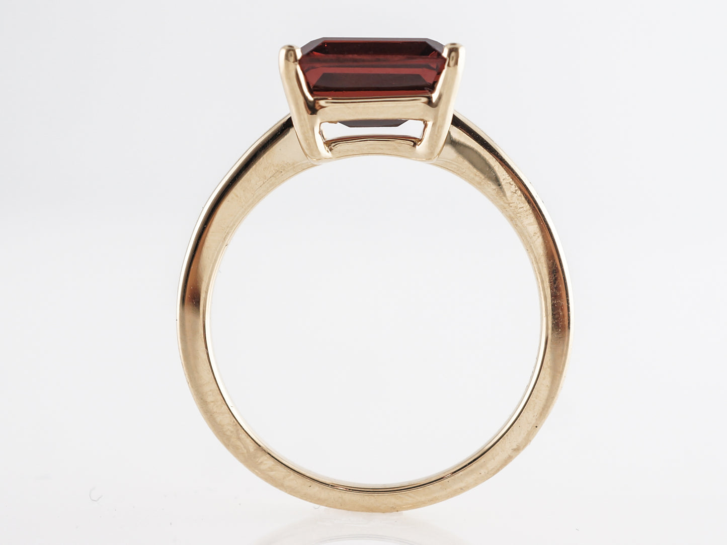 Emerald Cut Garnet Cocktail Ring in 14k Yellow Gold. This beautiful modern cocktail ring features a 3.03 carat emerald cut garnet set in 14 karat yellow gold. The rich red color of the garnet is the focus of this simple design, and it delivers a lovely range of colors from the long facets of the emerald cut. The bright yellow gold offers a perfect contrast with the amazing garnet color, making this a very special ring.