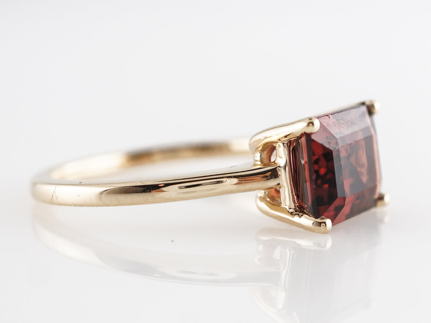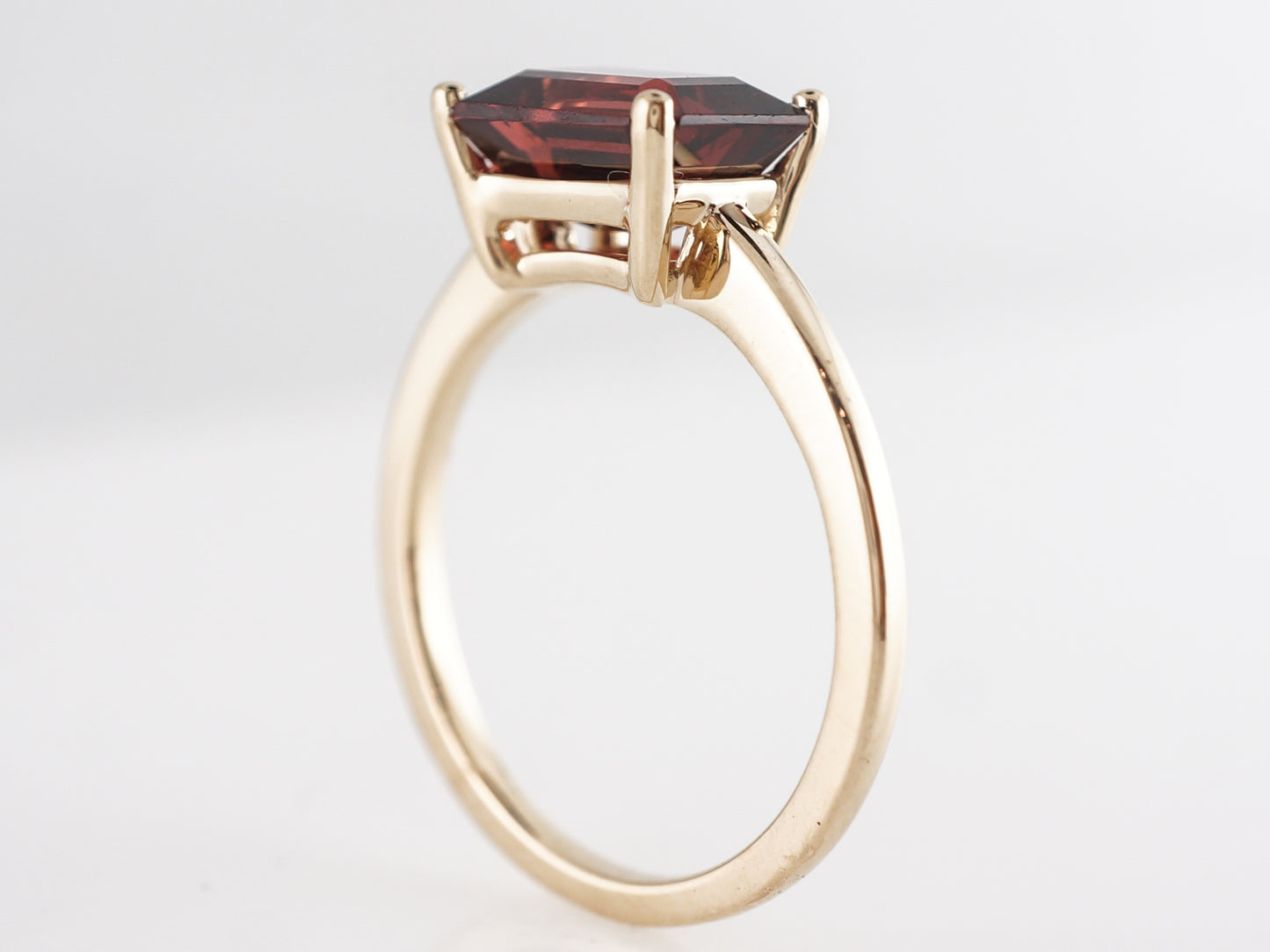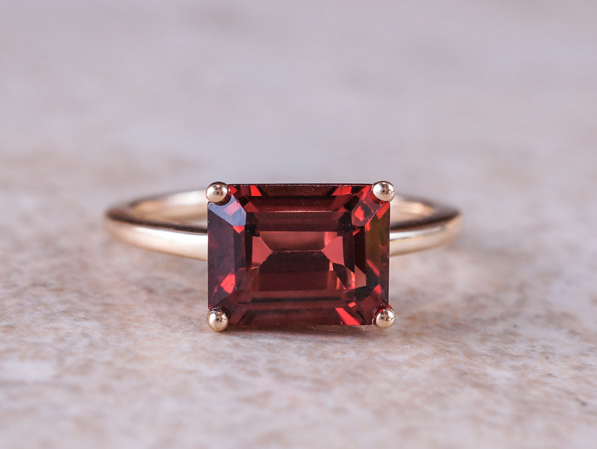 Emerald Cut Garnet Cocktail Ring in 14k Yellow Gold. This beautiful modern cocktail ring features a 3.03 carat emerald cut garnet set in 14 karat yellow gold. The rich red color of the garnet is the focus of this simple design, and it delivers a lovely range of colors from the long facets of the emerald cut. The bright yellow gold offers a perfect contrast with the amazing garnet color, making this a very special ring.