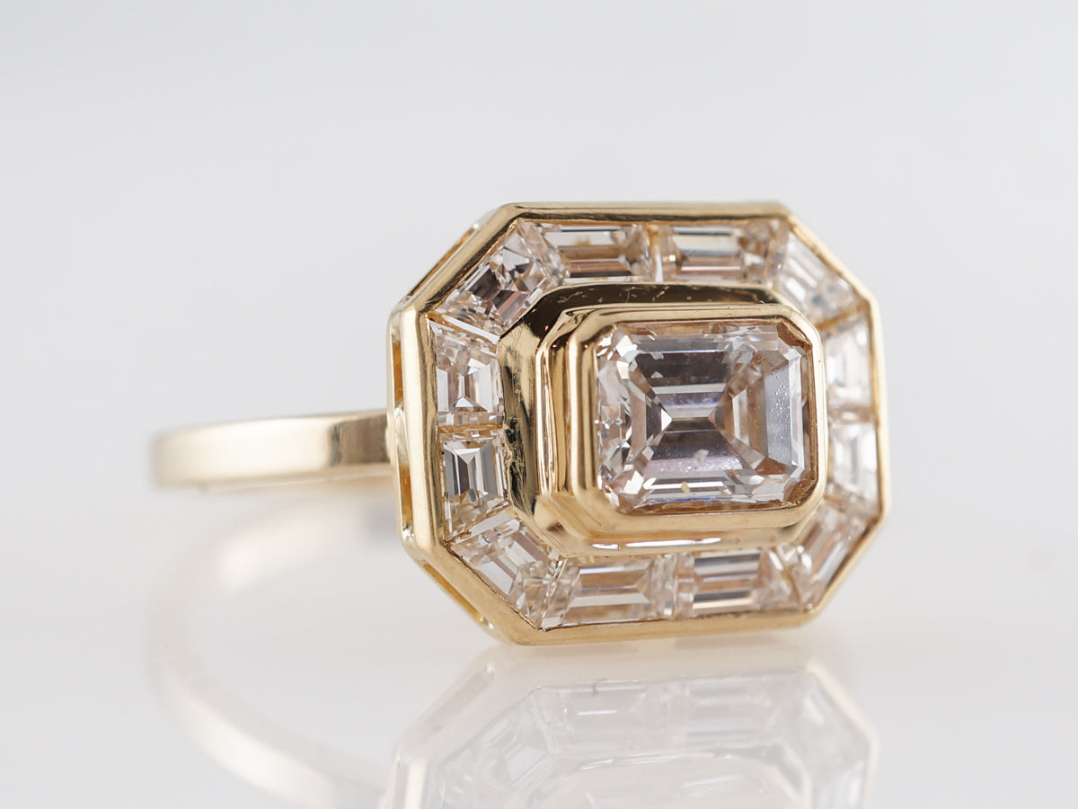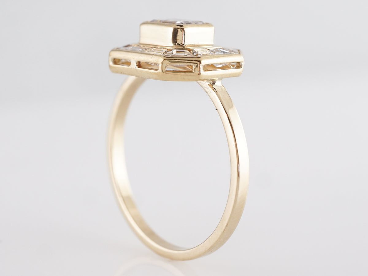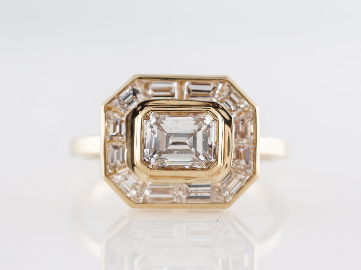 Emerald Cut Halo Diamond Engagement Ring in Yellow Gold. This dazzling modern engagement ring features a .53 carat emerald cut diamond set in 14 karat yellow gold. The center stone is set east-west and is wrapped with a halo of baguette cut diamonds. A huge diamond look for the price, and a beautiful geometric design with these rectangular cut diamonds.