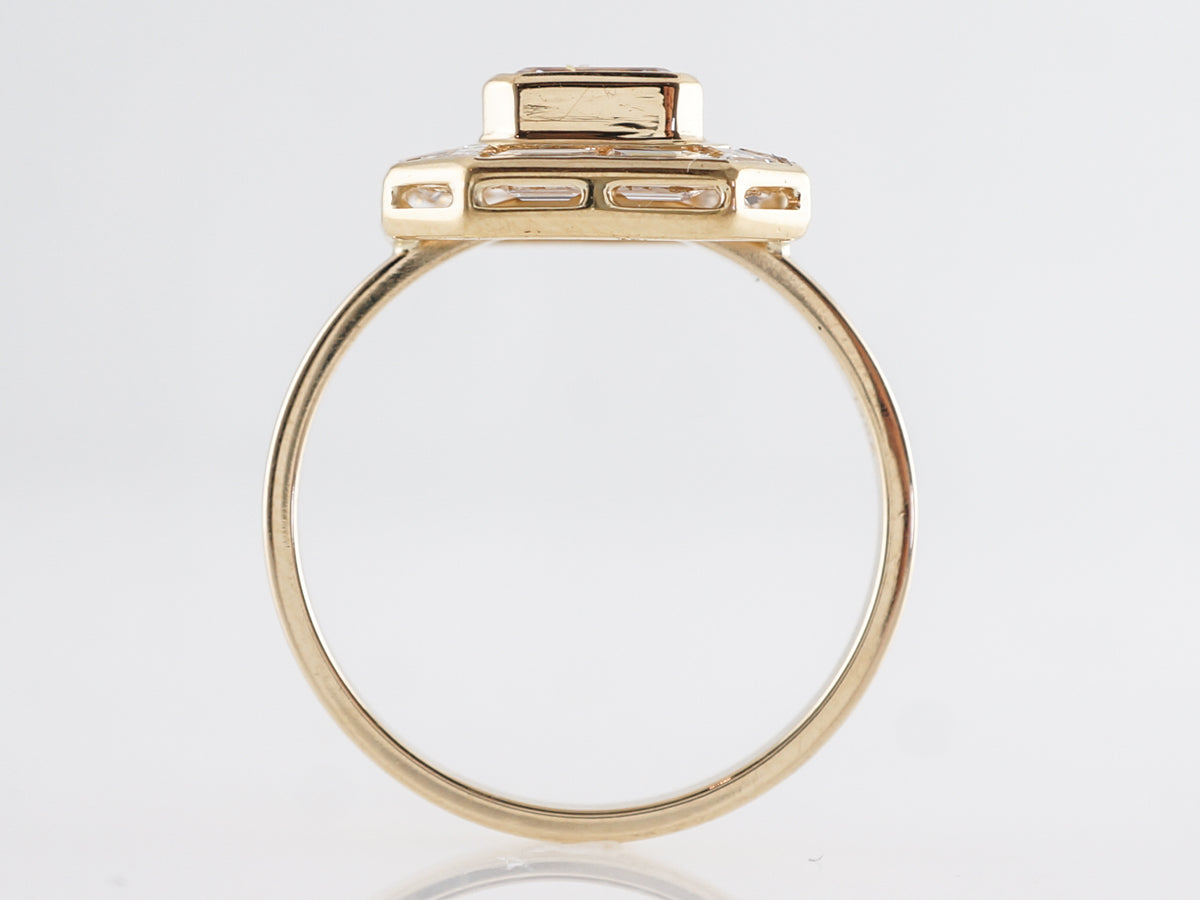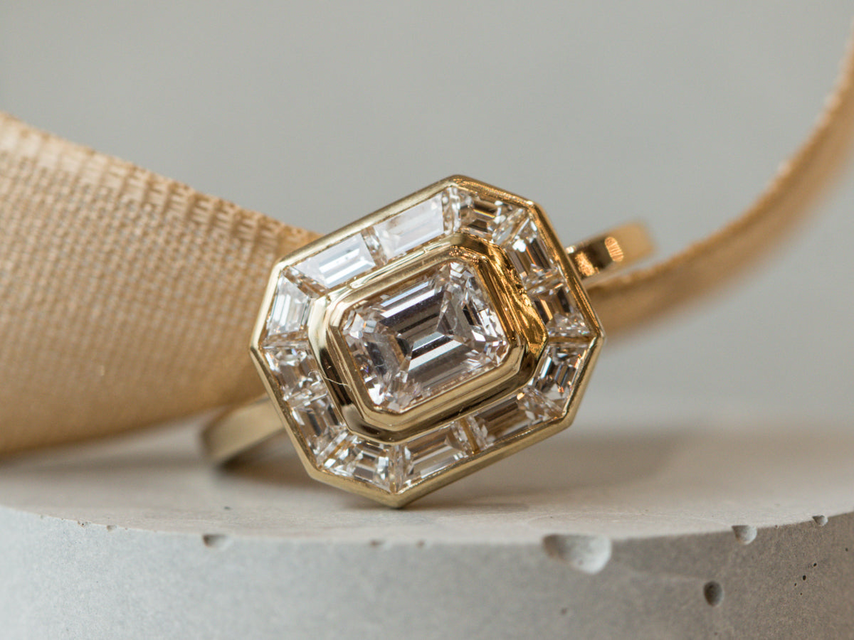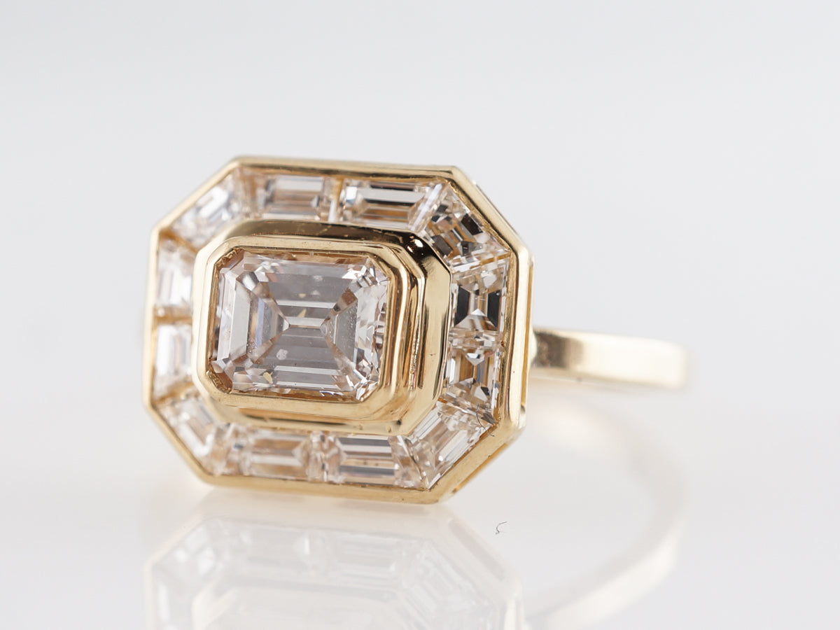 Emerald Cut Halo Diamond Engagement Ring in Yellow Gold. This dazzling modern engagement ring features a .53 carat emerald cut diamond set in 14 karat yellow gold. The center stone is set east-west and is wrapped with a halo of baguette cut diamonds. A huge diamond look for the price, and a beautiful geometric design with these rectangular cut diamonds.