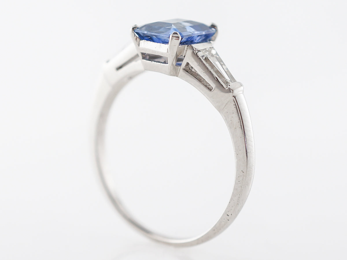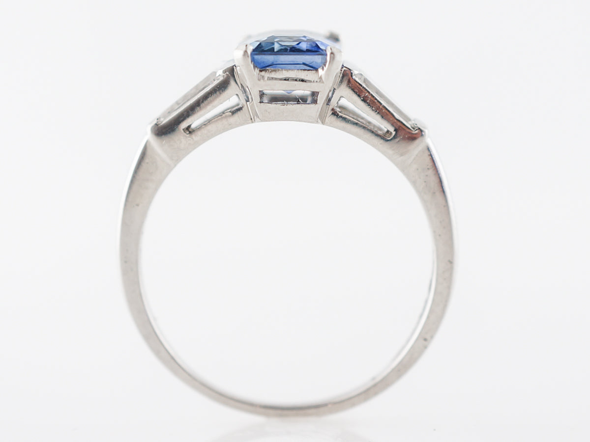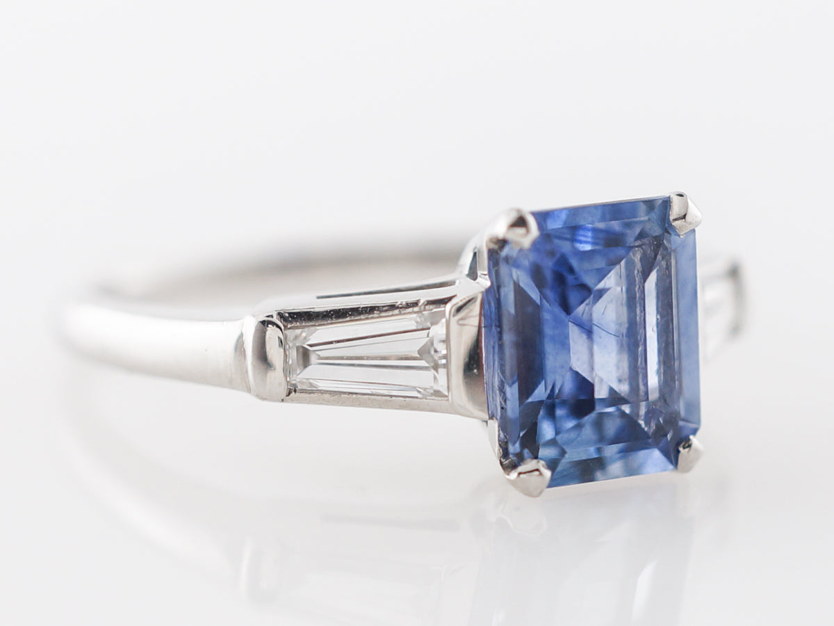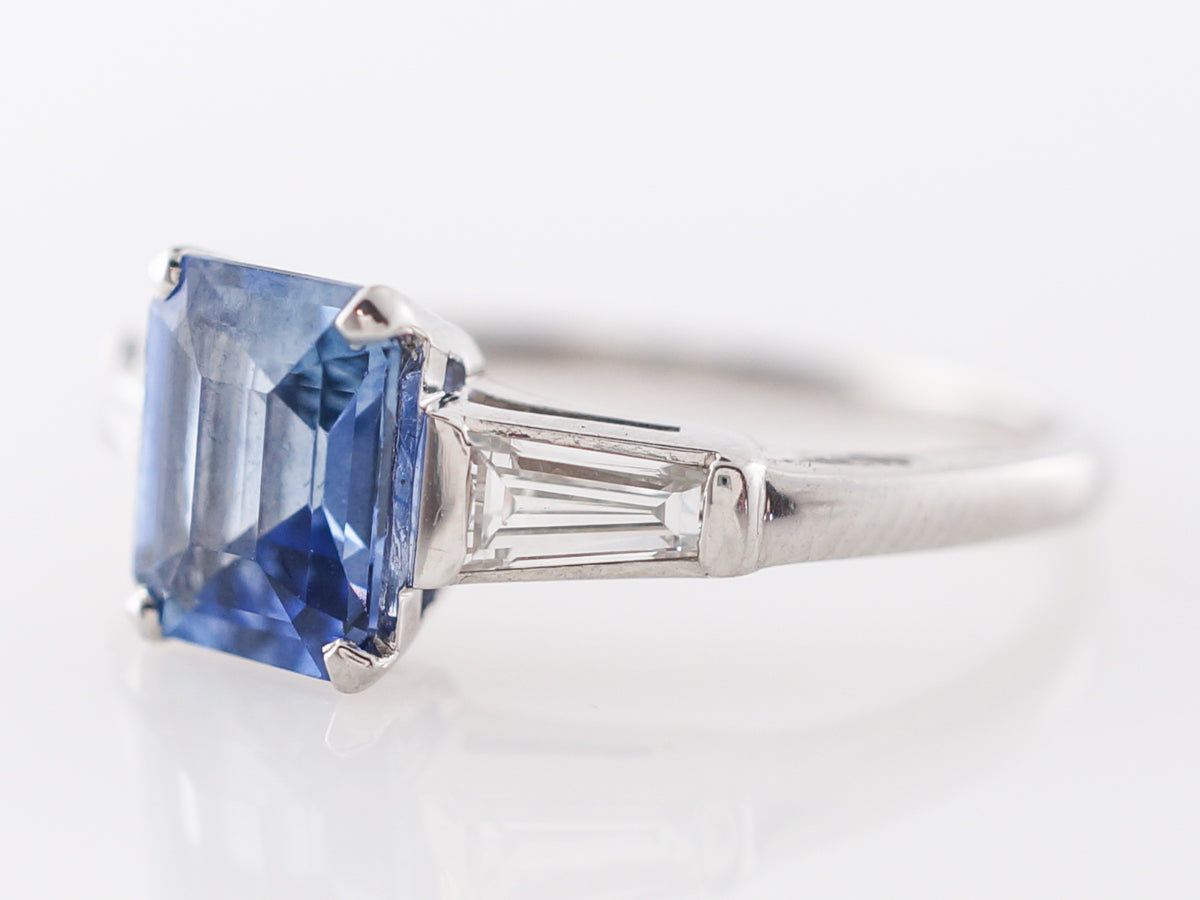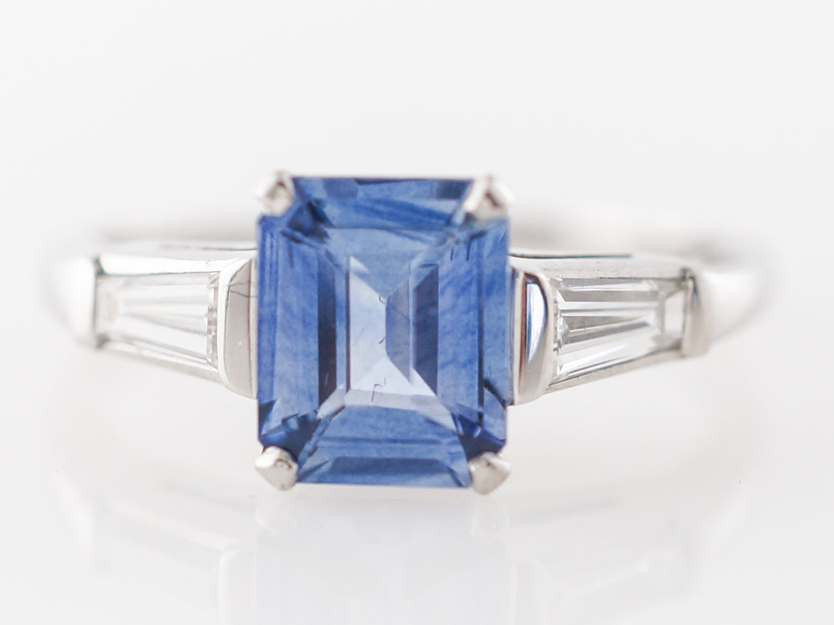 Emerald Cut Sapphire Engagement Ring in Platinum. This 1.43 carat emerald cut cornflower blue sapphire engagement ring is completed in platinum. The center sapphire is flanked by tapered baguette cut diamonds set in platinum bars with a total diamond weight of .20 carats.
