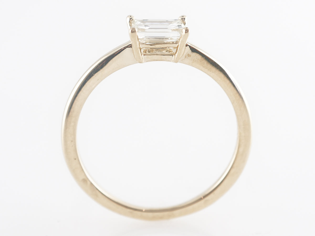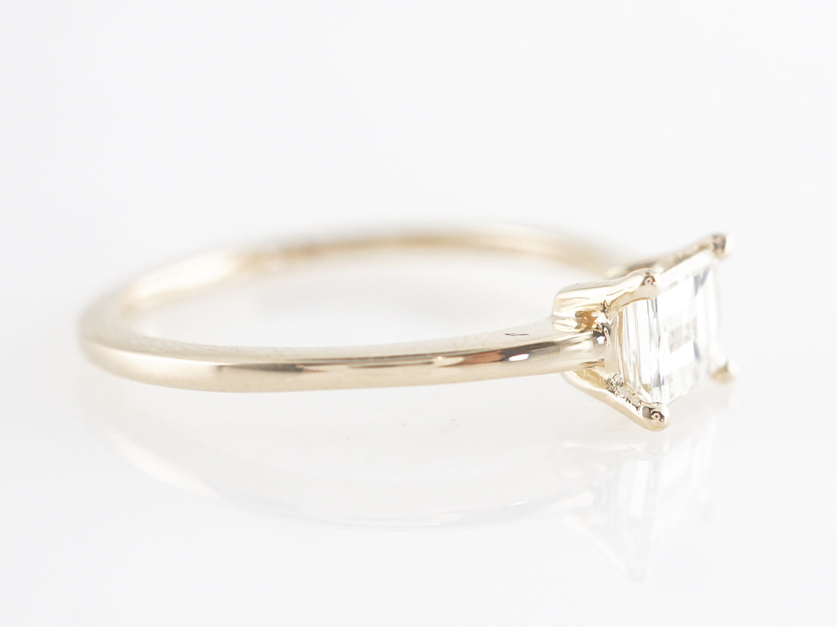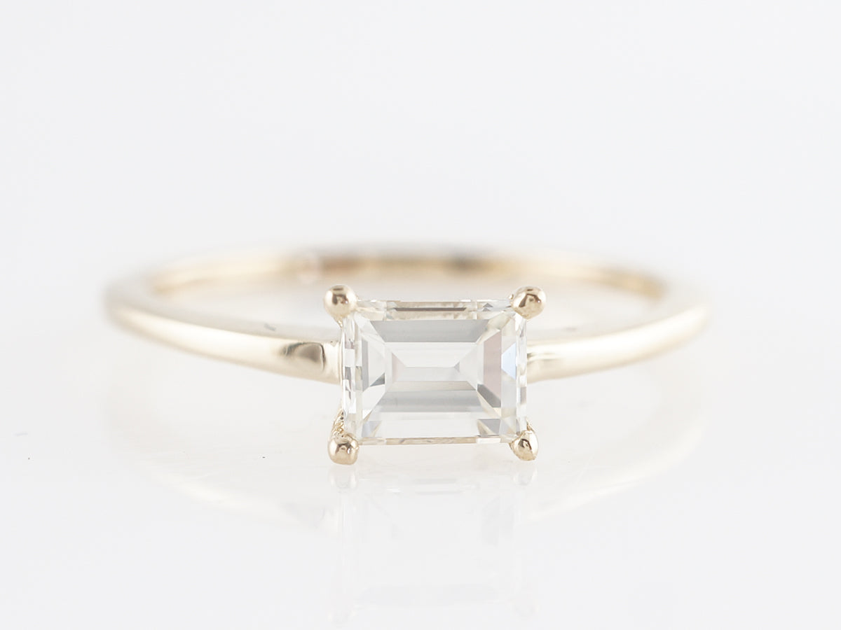 Emerald Cut Solitaire Diamond Engagement Ring in Yellow Gold. This .57 carat emerald cut diamond solitaire engagement ring is so clean and elegant. The four prong setting features a simple and refined design. The stone sits rather low to the finger and has tremendous VVS2 clarity. You can pair this ring with just about any wedding band.
