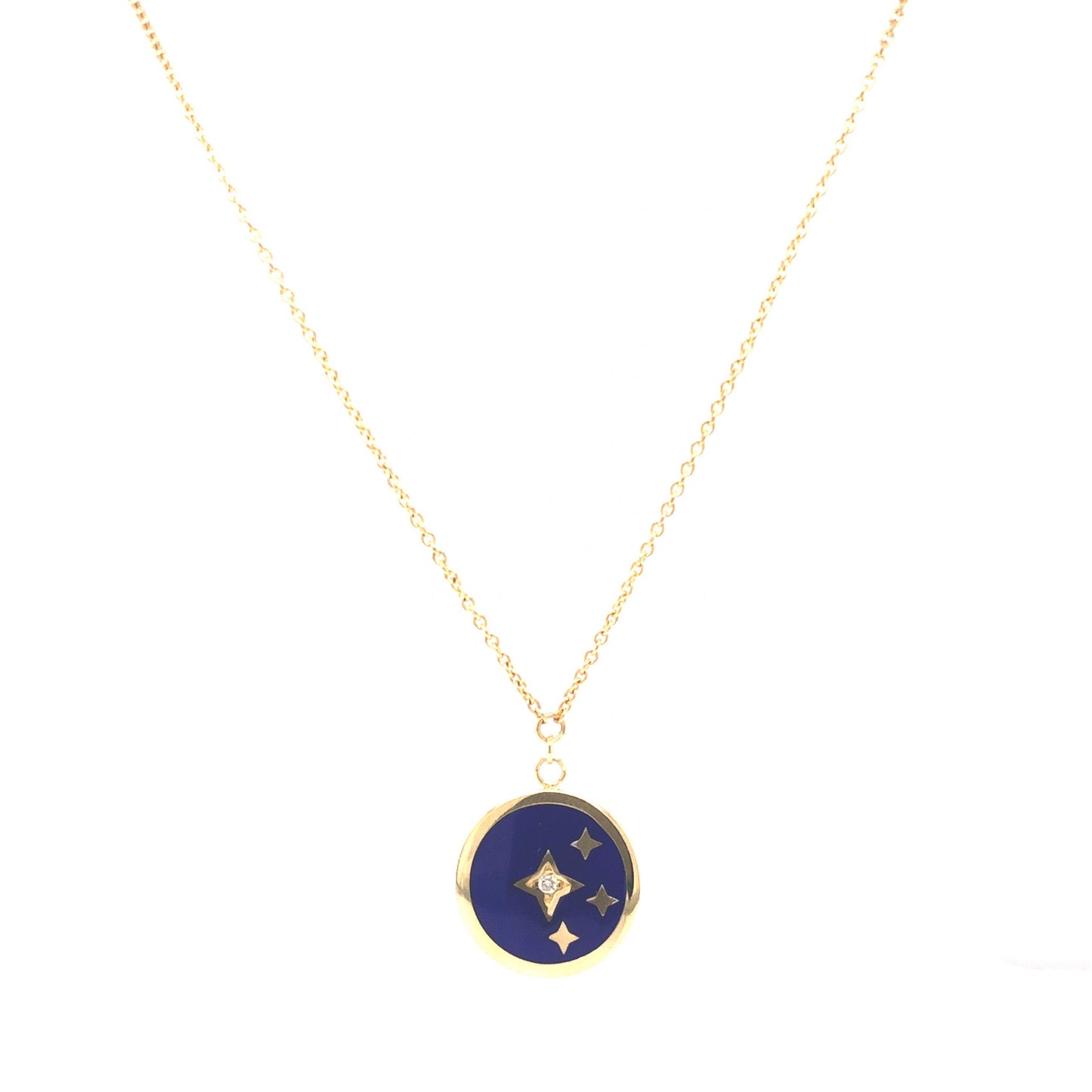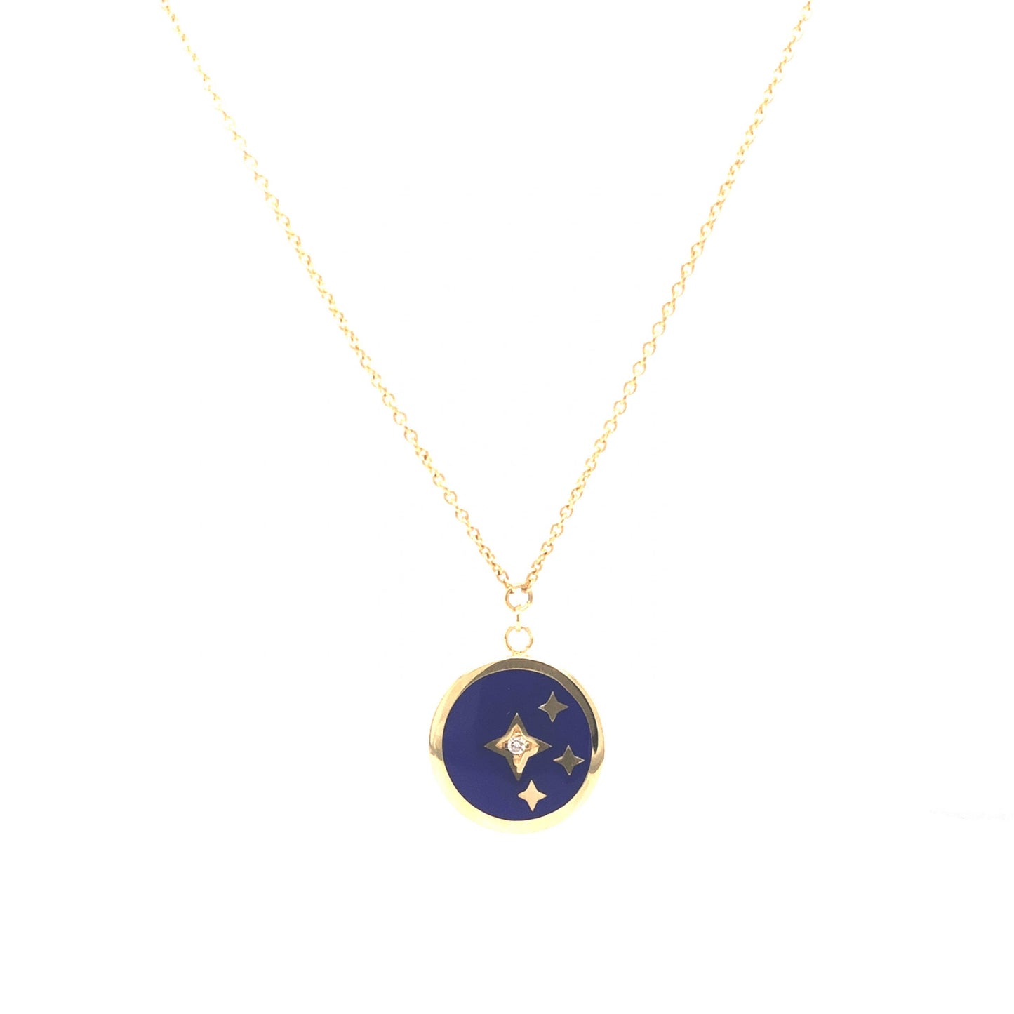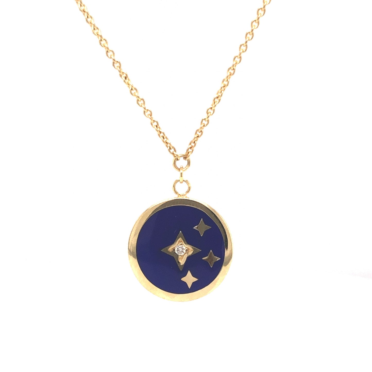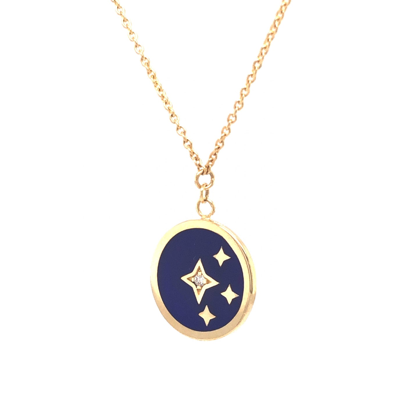 Enamel Diamond Pendant Necklace in 14K Yellow Gold. This lovely, ready-to-layer pendant necklace features a star and diamond design finished in blue enamel and 14 karat yellow gold. A petite .01 carat diamond is set in the center of a golden star motif. The blue enamel creates a cosmic backdrop to the rounded pendant. Finished on a 20” yellow gold chain, this necklace would be a stunning gift for any special occasion!
