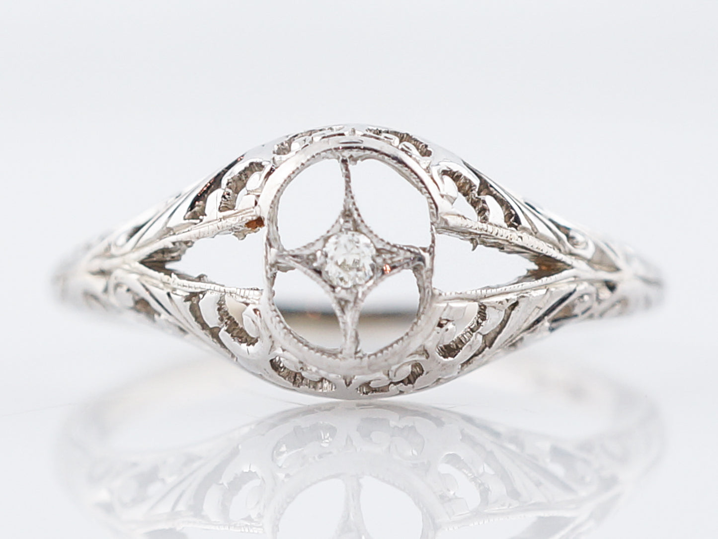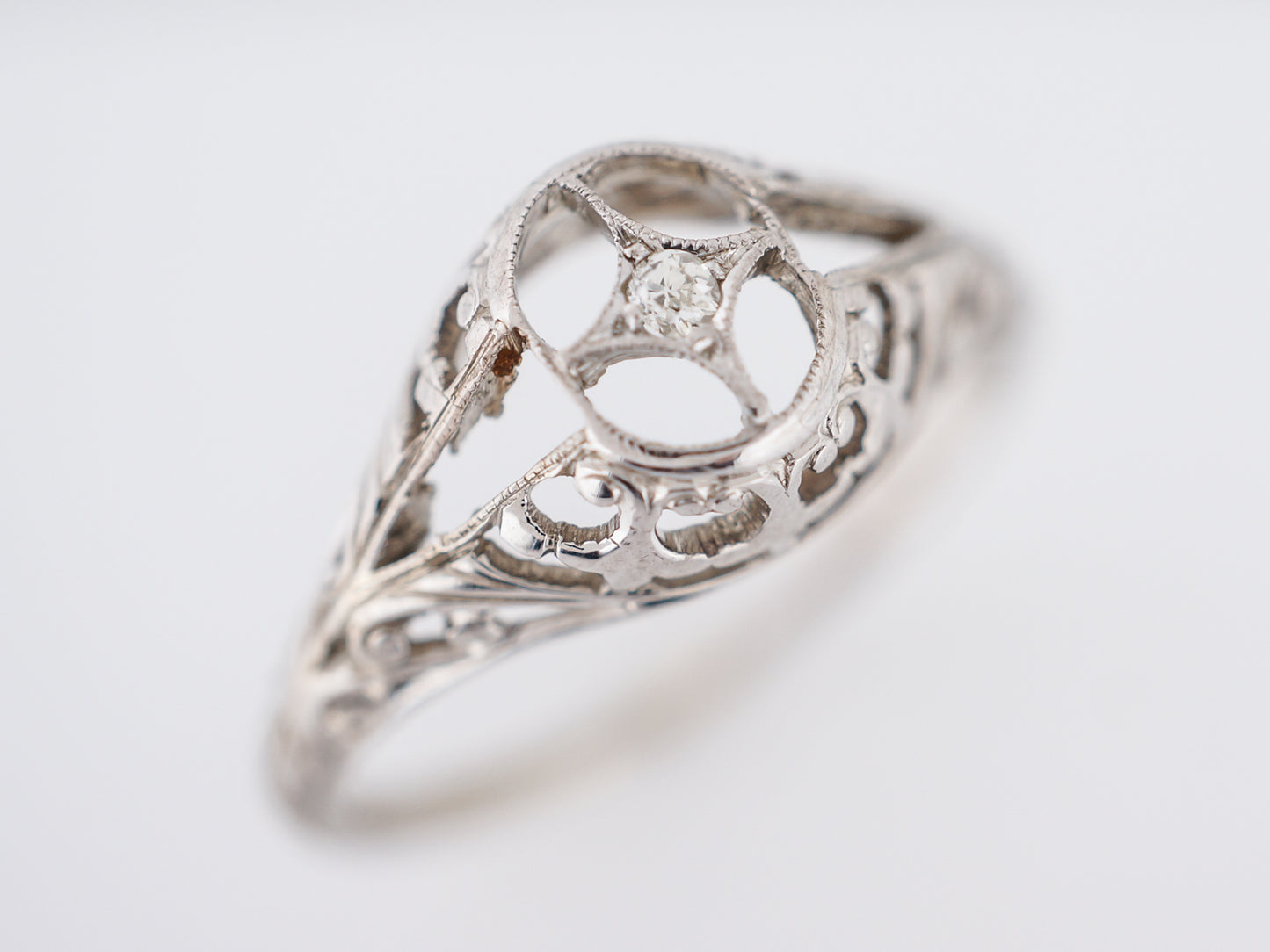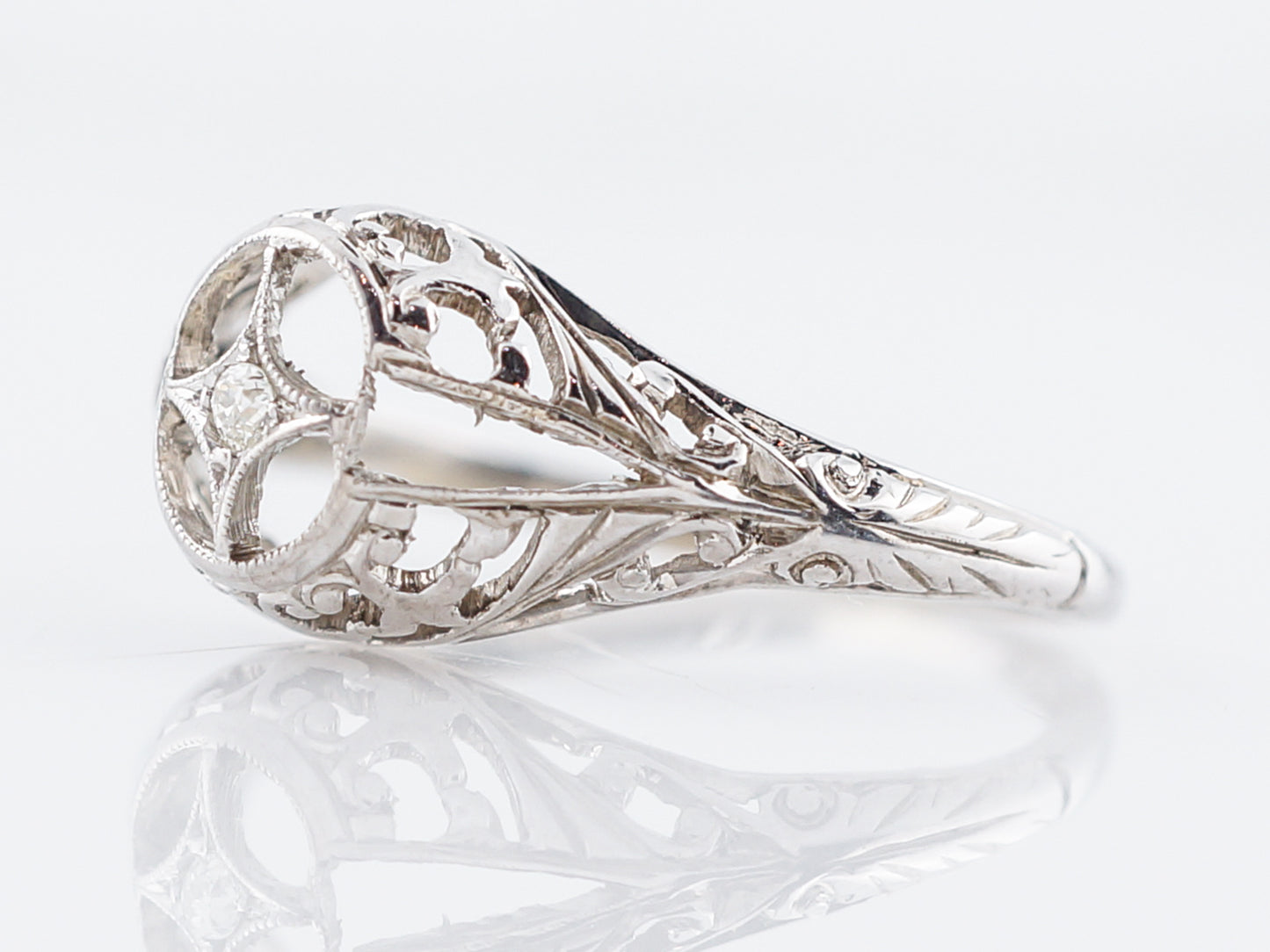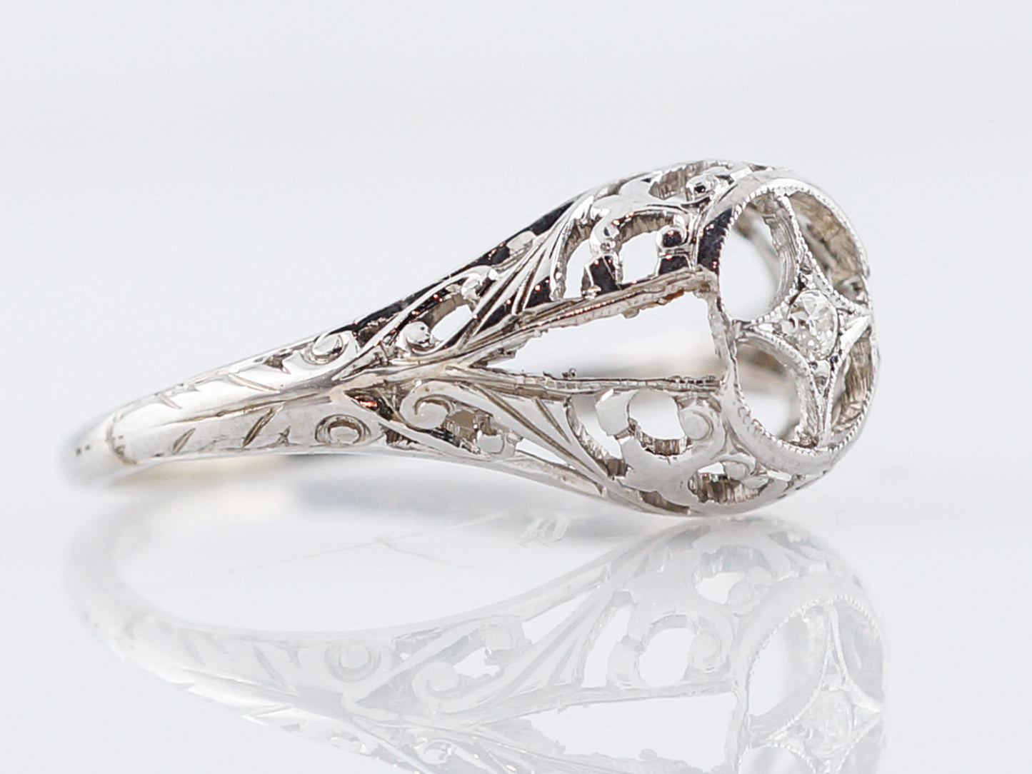 This vintage Art Deco Era engagement ring is a shining example of all the amazing trends that were popular in this Era. Cast in 18 karat white gold, this ring has a slight dome to it and is full of floral filigree and negative space, creating a really beautifully unique look. This ring features just one sparkling Old European Cut diamond weighing .01 carats, set in a star setting.