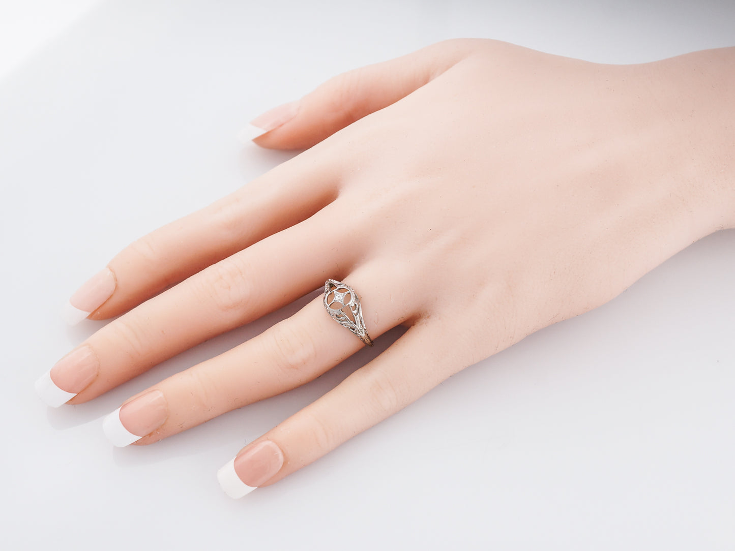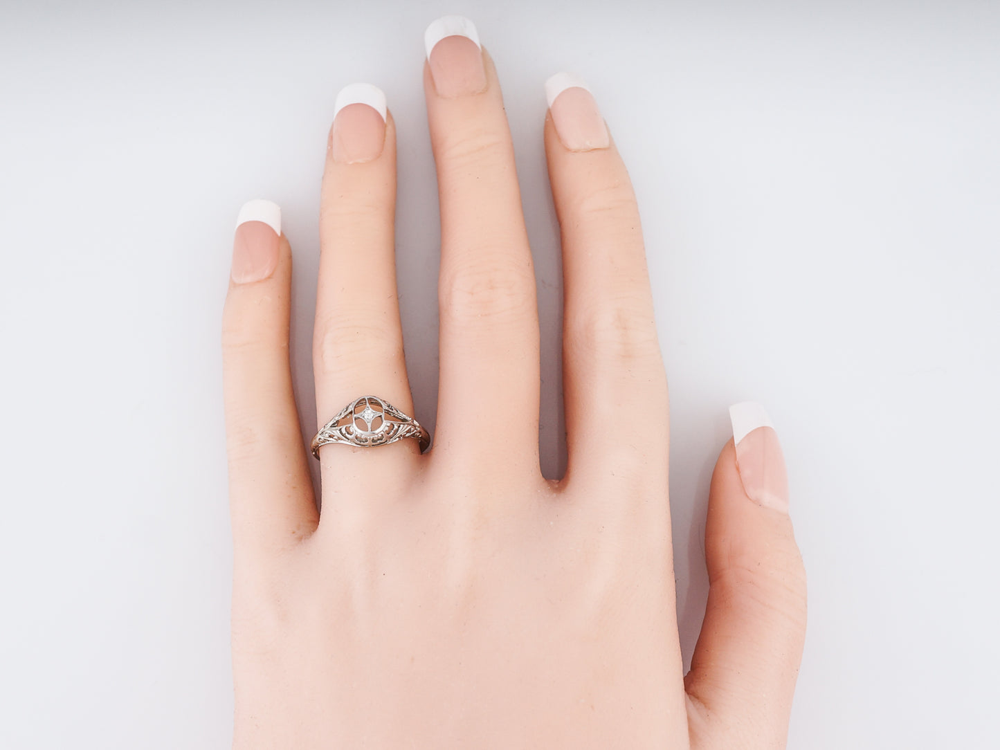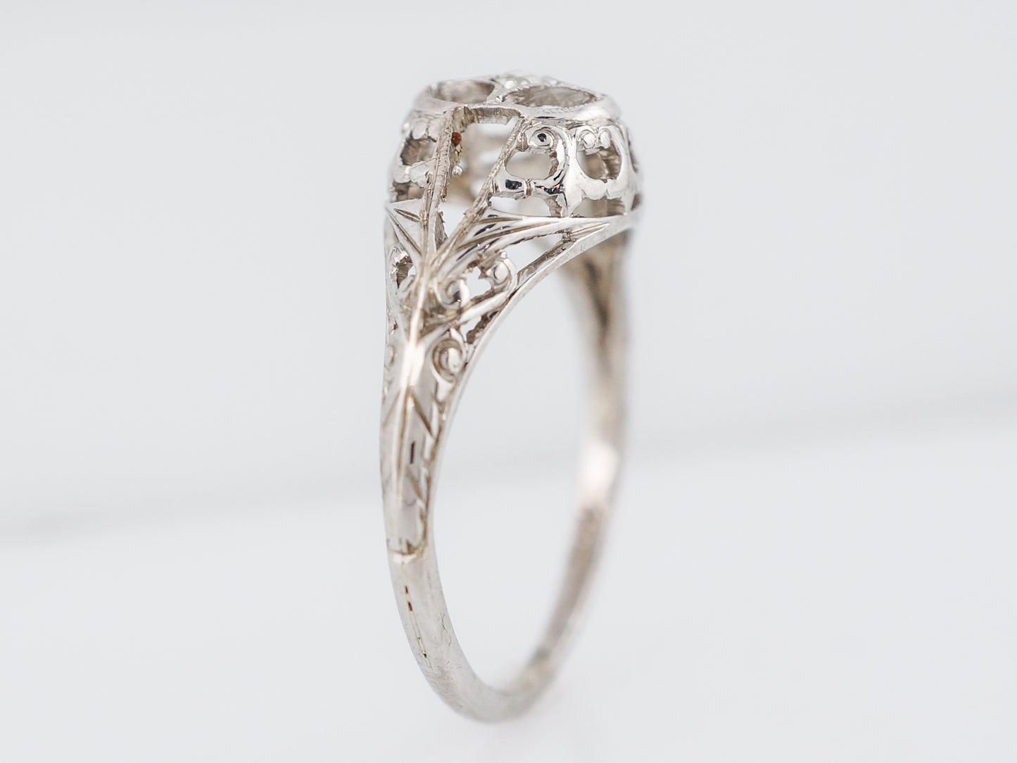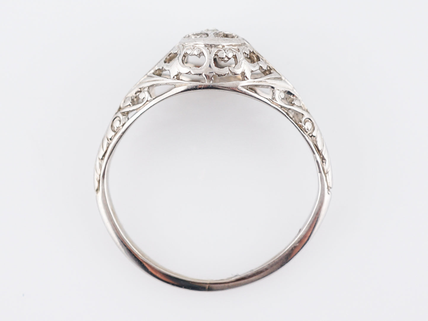 This vintage Art Deco Era engagement ring is a shining example of all the amazing trends that were popular in this Era. Cast in 18 karat white gold, this ring has a slight dome to it and is full of floral filigree and negative space, creating a really beautifully unique look. This ring features just one sparkling Old European Cut diamond weighing .01 carats, set in a star setting.
