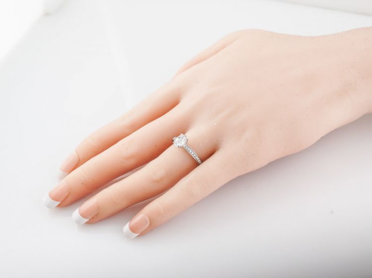 A custom designed diamond and 14K white gold engagement ring. The ring consists of an oval brilliant cut diamond weighing 1.01 carats and is set with four (4) prongs. The shank of the ring consists of twenty-four (24) shared prong set round brilliant cut diamonds in a single row, adding a modern touch of sparkle.