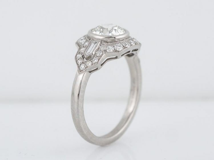 This engagement ring is a lovely combination of Modern and antique attributes. The setting is Modern with an antique 1.03 carat Old European cut diamond at its center. The center diamond is bezel set and flanked by two unique bullet cut diamonds. There are also thirty (30) smaller diamonds surrounding the three center diamonds. All of the diamonds are framed by crisp milgrain detail. The band on this platinum ring has a high polish finish.