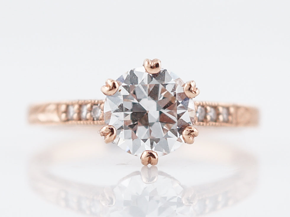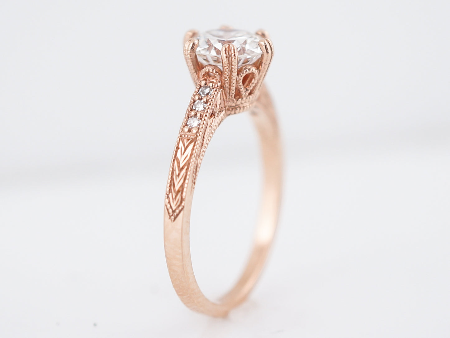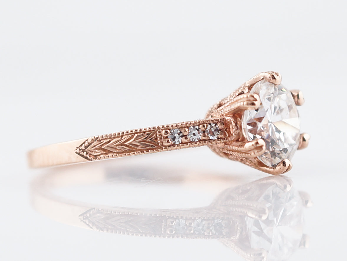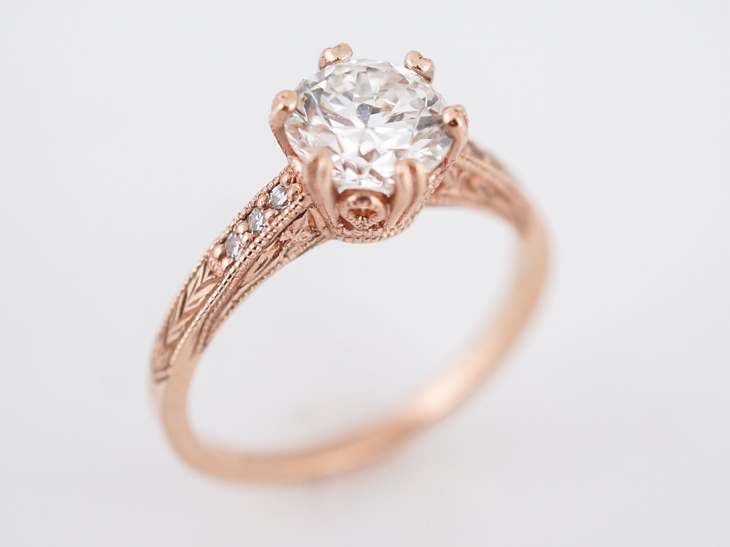 This stunning Modern engagement ring is finished in a warm, coppery 14k rose gold. A shimmering 1.05 carat transitional cut diamond is set into the center with dimpled split-prong style prongs. This provides a wonderful vintage look that pairs well with the milgrain accented single cut diamonds (6) set into the shoulders of the ring. Rounding out this stunning ring is a crisp chevron pattern the runs down the shank, transitioning into a smooth lower shank.