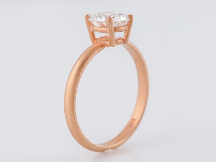 This Modern engagement ring is beautifully crafted in 14k rose gold. The four prong setting holds the 1.09 carat round brilliant diamond in place while covering very little of its glittering surface. The metal has a matte satin finish.