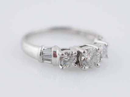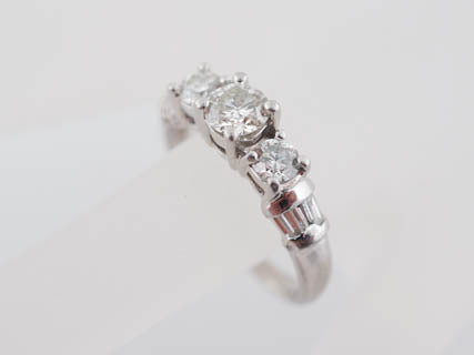 This classic and tailored three stone diamond engagement ring features a .40 carat round brilliant center flanked by two (2) round brilliant .20 carat diamonds. The round diamonds are accented by three (3) rolling tapered baguette diamonds set into the shank of the ring. The total weight of the ring is 1.15 carats. Perfect for an anniversary ring or as an engagement ring.