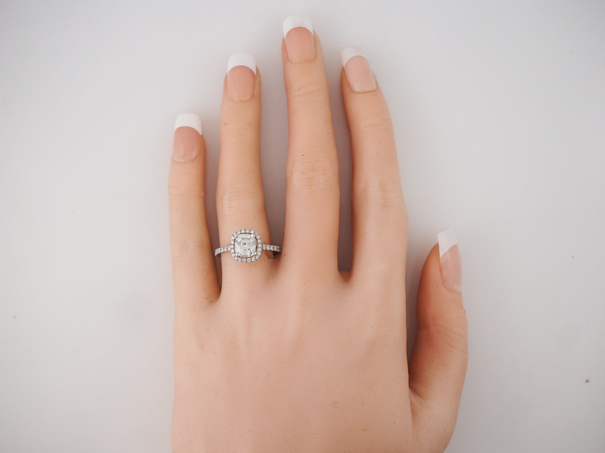 This Modern engagement ring features a beautiful 1.20 carat cushion cut diamond at its center. The center diamond is accented by a halo of diamonds with just a touch of negative space between the center stone and the outer frame. This design choice adds a dynamic element, emphasizing the shape and size of the center stone while maximizing the brilliance. Unlike many modern halo designs, this ring sits fairly low to to finger and makes it easy to wear everyday.