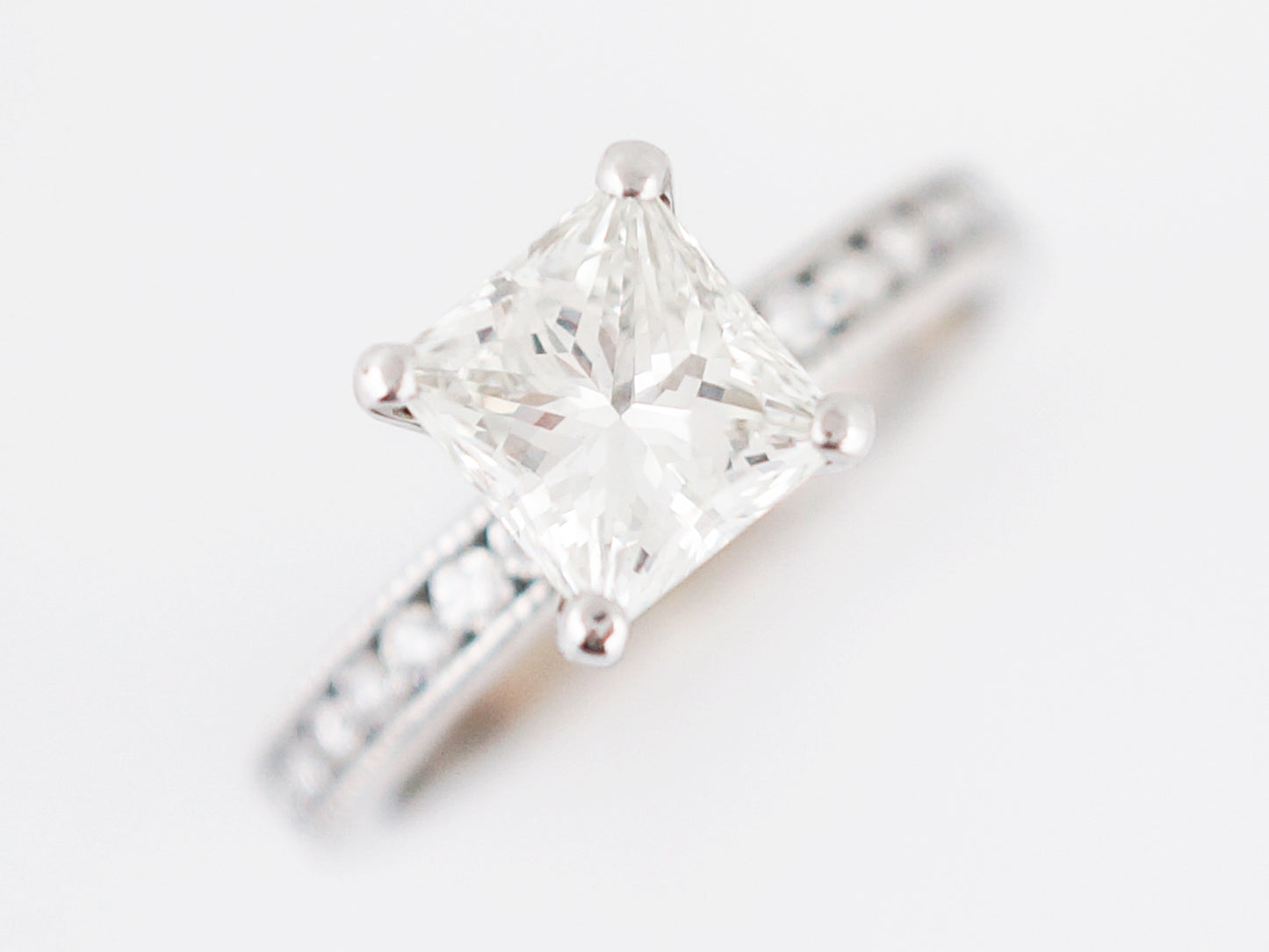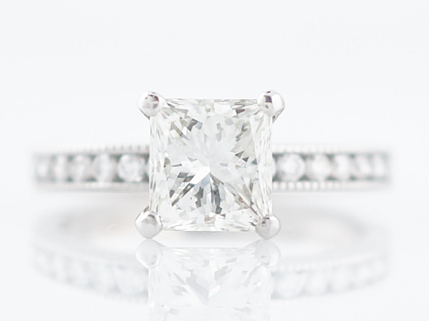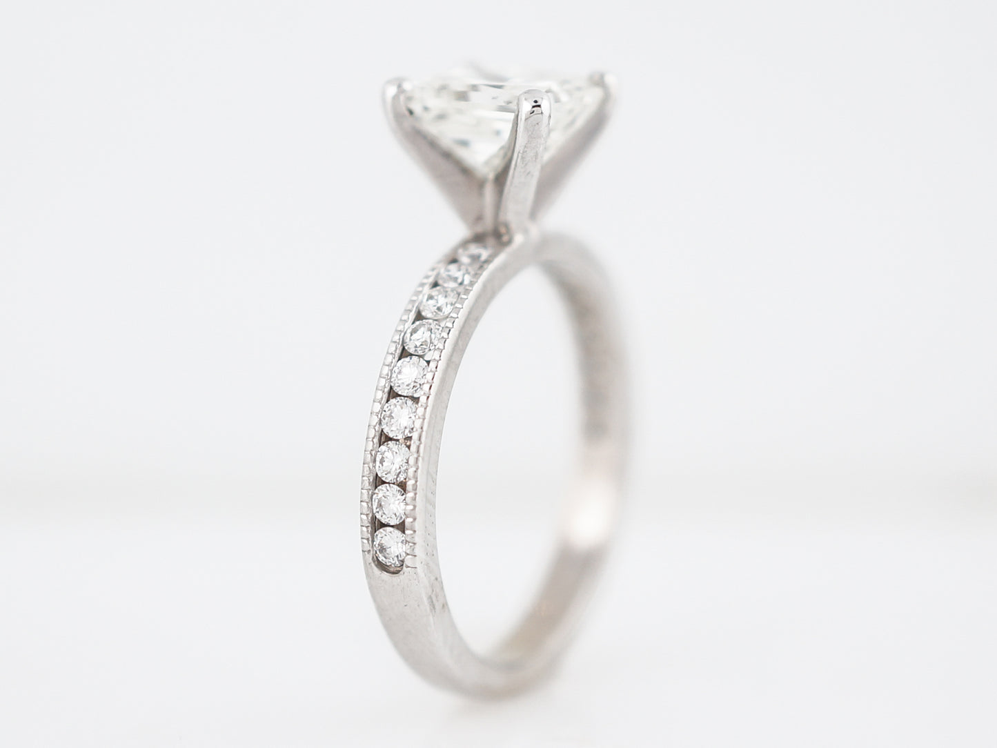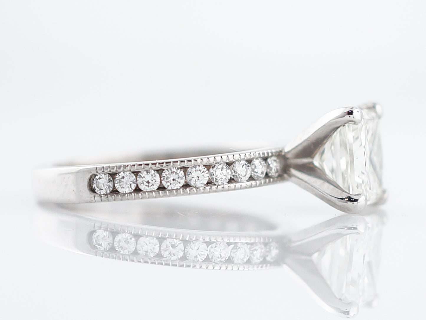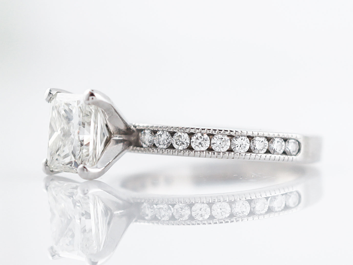 This Modern Era engagement ring has a classic, crisp and clean look with just a touch of vintage inspiration. Set in a four prong crown is a 1.21 carat, square brilliant cut diamond, having SI1 clarity and I color. On each side of the center stone are nine (9) round brilliant cut diamonds which are channel set. The channels of the ring have delicate milgrain detailing which gives a little vintage touch.
