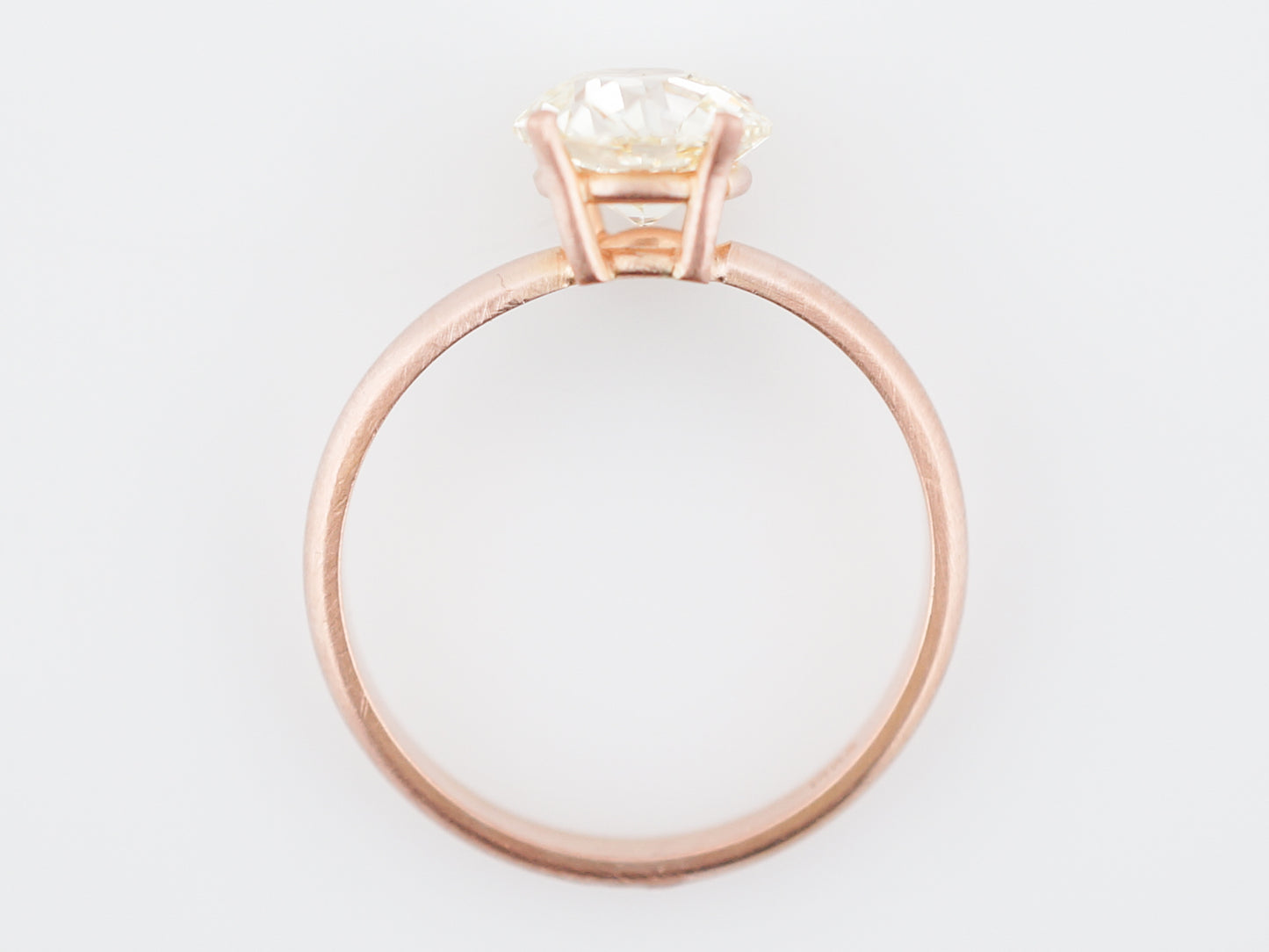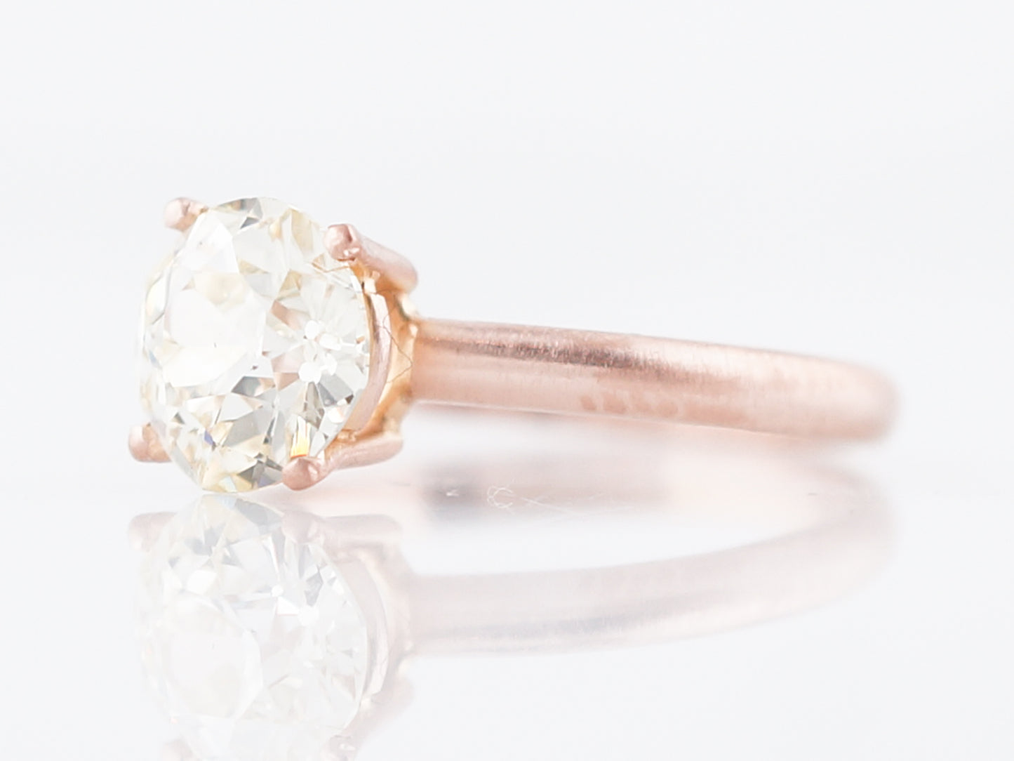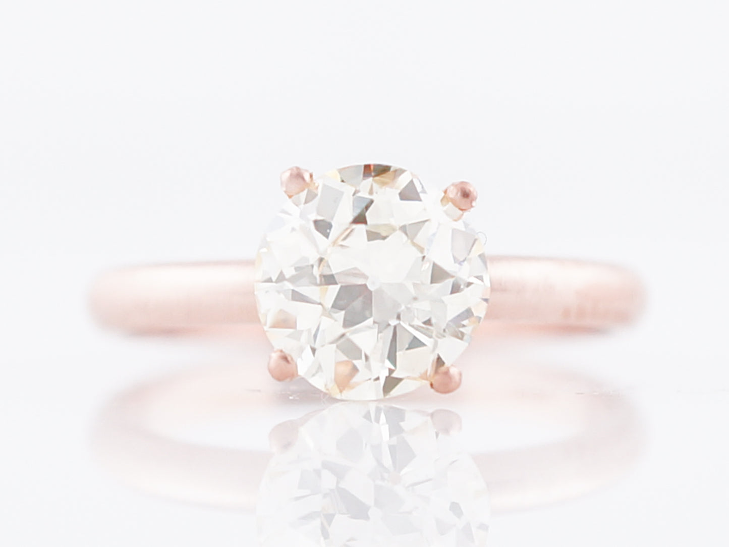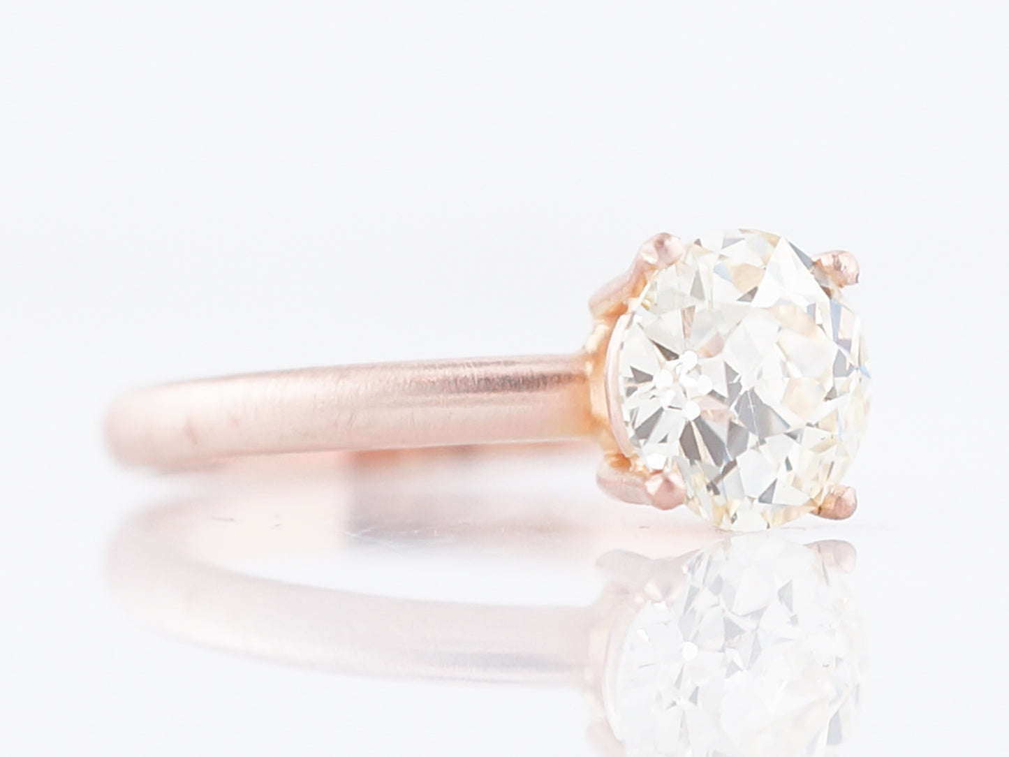 This solitaire style engagement ring is the perfect marriage of modern and vintage. It features a 1.44 carat Old European Cut diamond in a modern 14 karat, 2mm wide rose gold setting. The diamond, has M color and VS2 clarity and is set in a four prong basket style crown. The mounting has a ultra modern look as it has been made with a matte, brush finish.