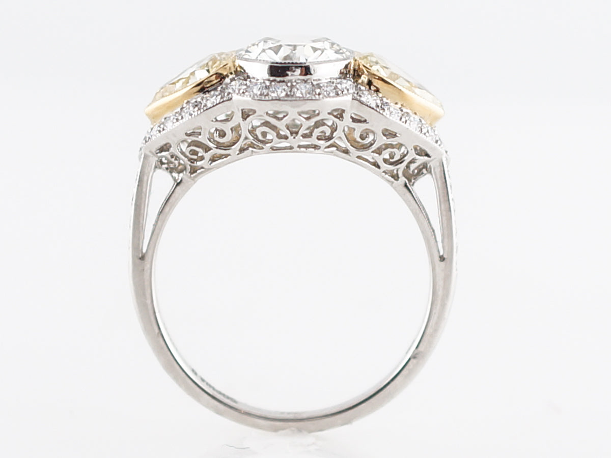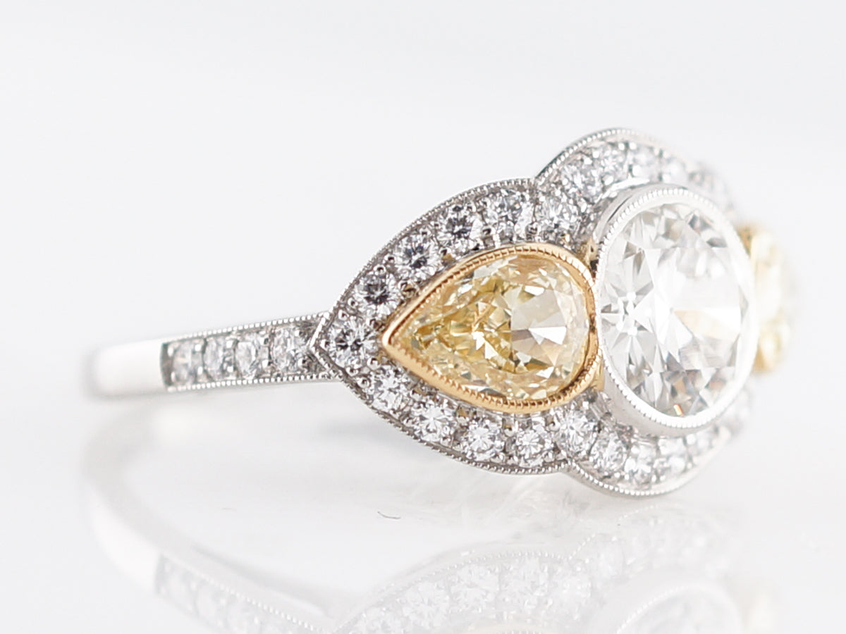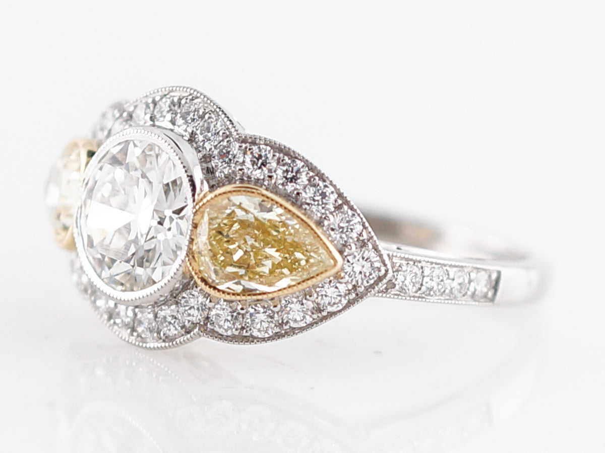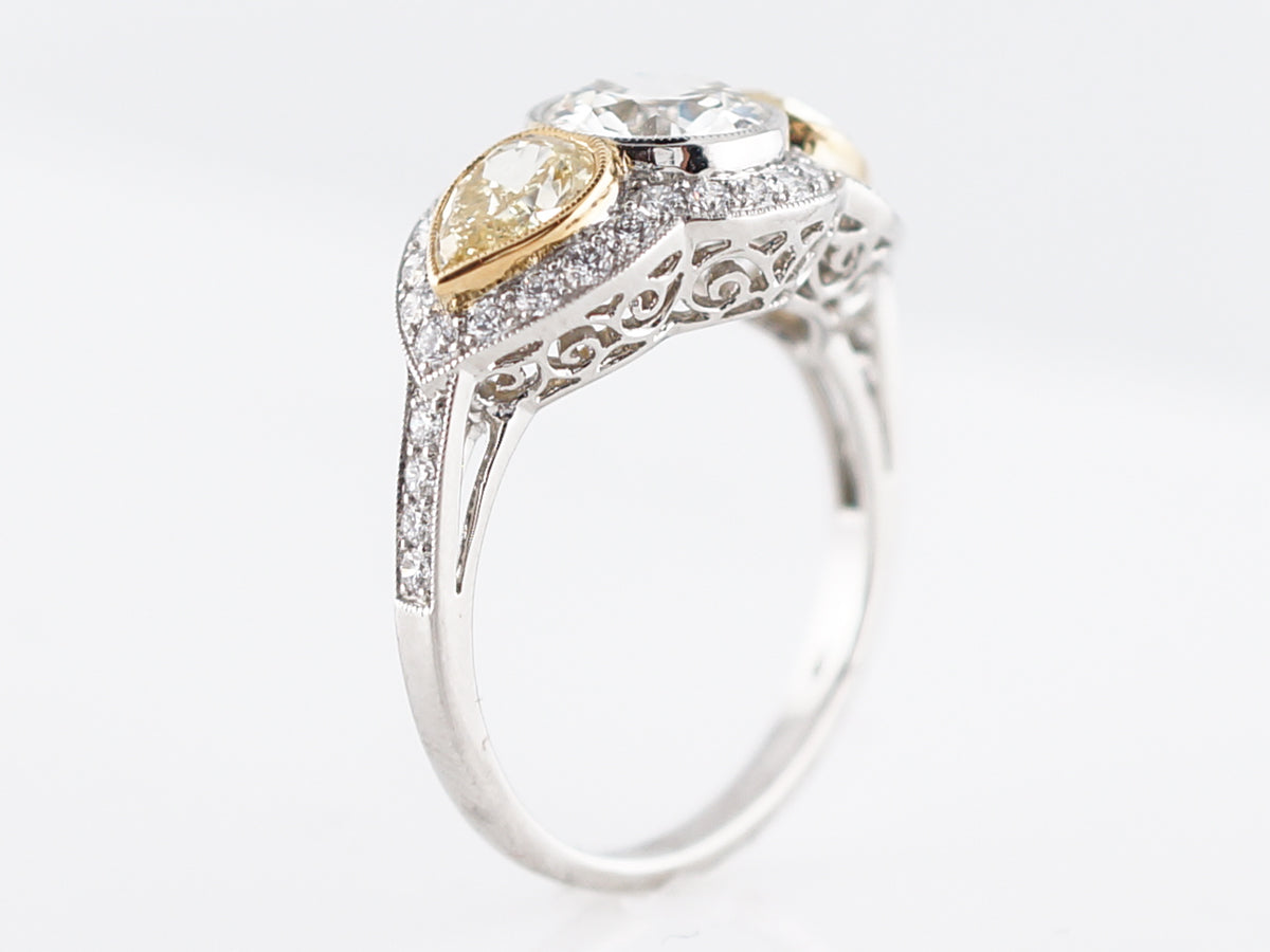 This modern custom design engagement ring is both striking and unique with a bold take on the traditional three stone design. The center diamond is a bezel set 1.03 carat old European cut diamond that sits low to the finger. The center stone is flanked on each side by .50 carat fancy intense yellow pear shaped diamonds. The yellow stones provide a unique and bold contrast of color for somebody looking for something a bit different. Thirty (30) single cut diamonds border the ring and are framed with stunning milgrain detail while hand pierced open filigree work on the undercarriage provides a last bit of art deco style. Modern brilliance with antique materials in its finest form!