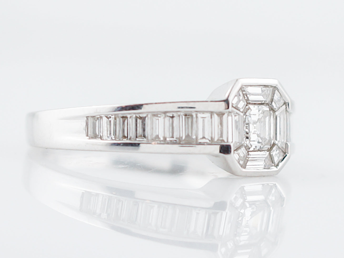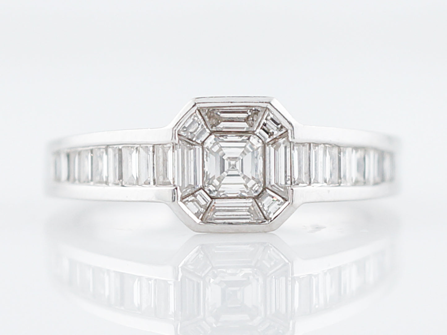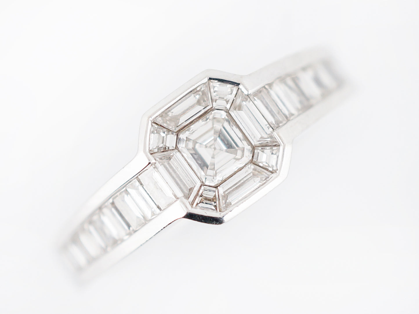 This engagement ring is chalk full of stunning step cut diamonds Step cut diamonds have straight line faceting giving them a unique sparkle that is different from a round brilliant cut diamond. The star of this ring is the 0.20 carat Asscher cut diamond in the center that is surrounded by custom cut baguette cut diamonds. The sides have straight cut baguette cut diamonds that are channel set down the shank. Cast in 18 karat white gold, this ring has a very modern and geometric look.