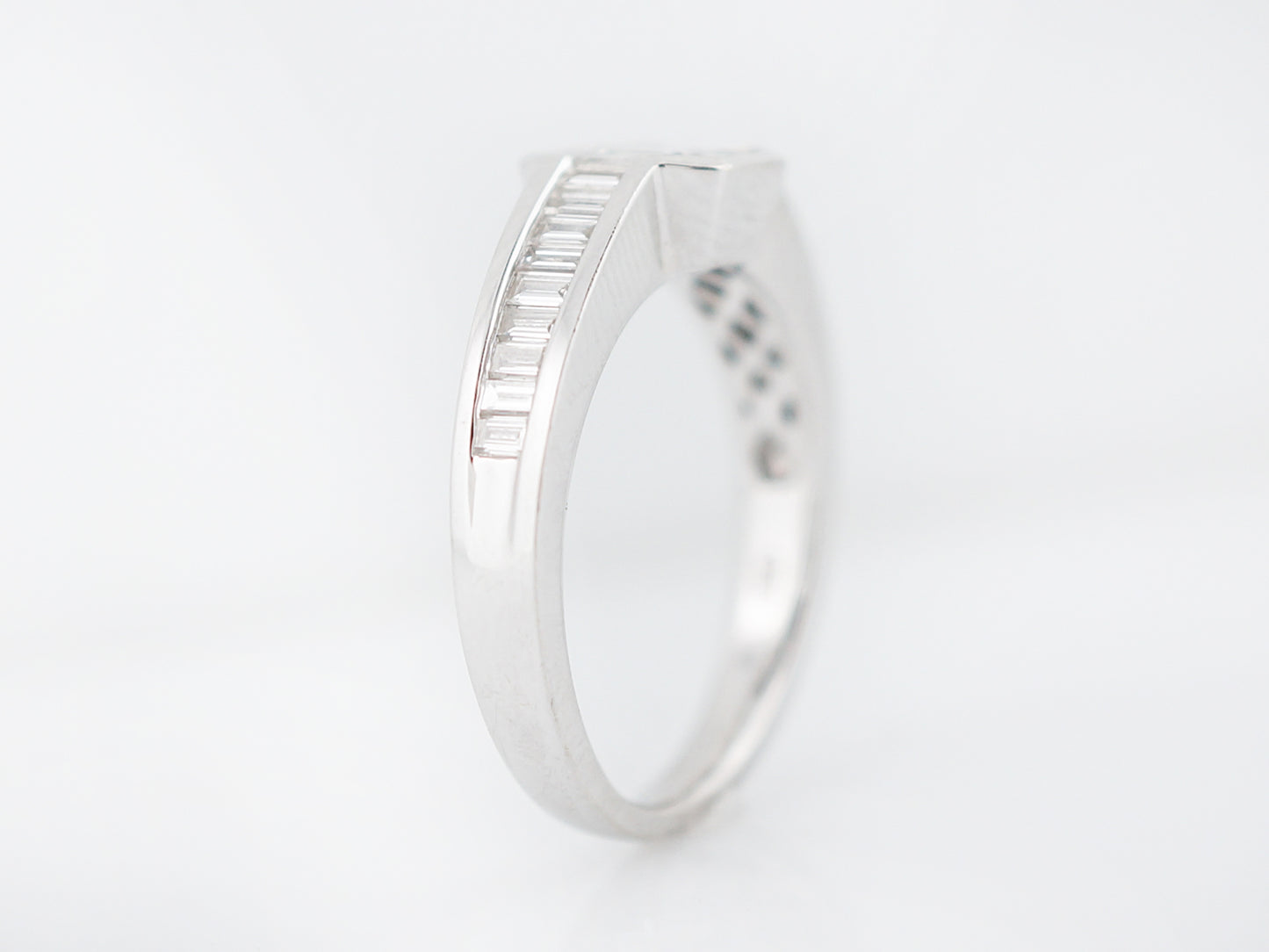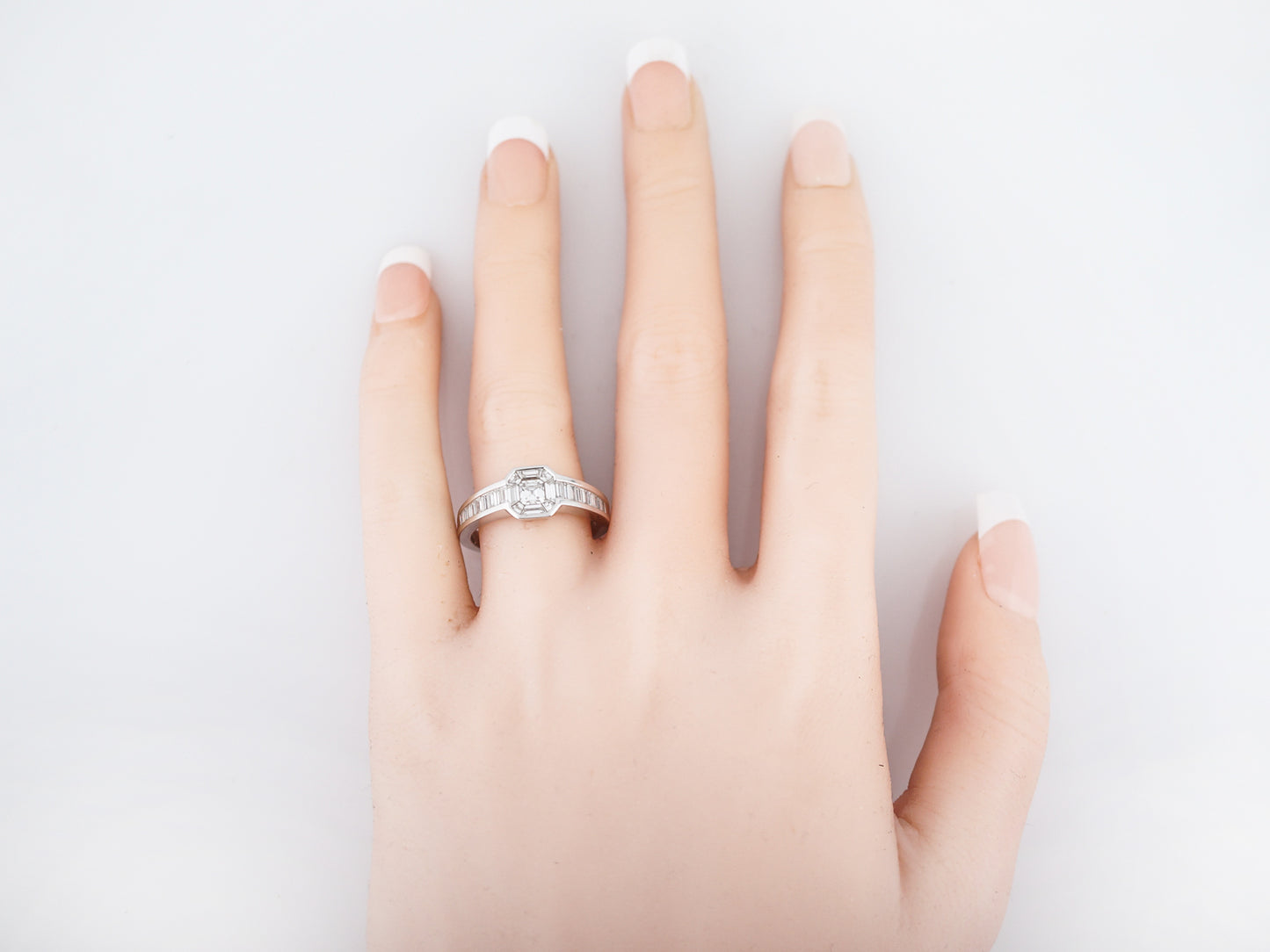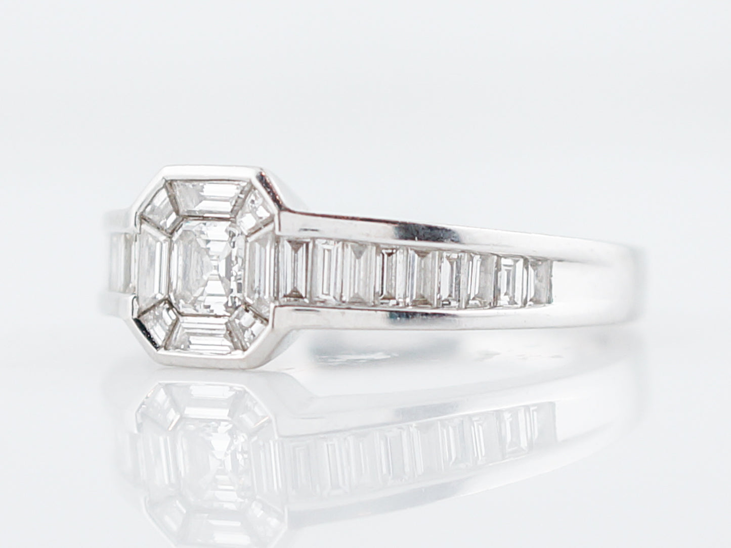 This engagement ring is chalk full of stunning step cut diamonds Step cut diamonds have straight line faceting giving them a unique sparkle that is different from a round brilliant cut diamond. The star of this ring is the 0.20 carat Asscher cut diamond in the center that is surrounded by custom cut baguette cut diamonds. The sides have straight cut baguette cut diamonds that are channel set down the shank. Cast in 18 karat white gold, this ring has a very modern and geometric look.