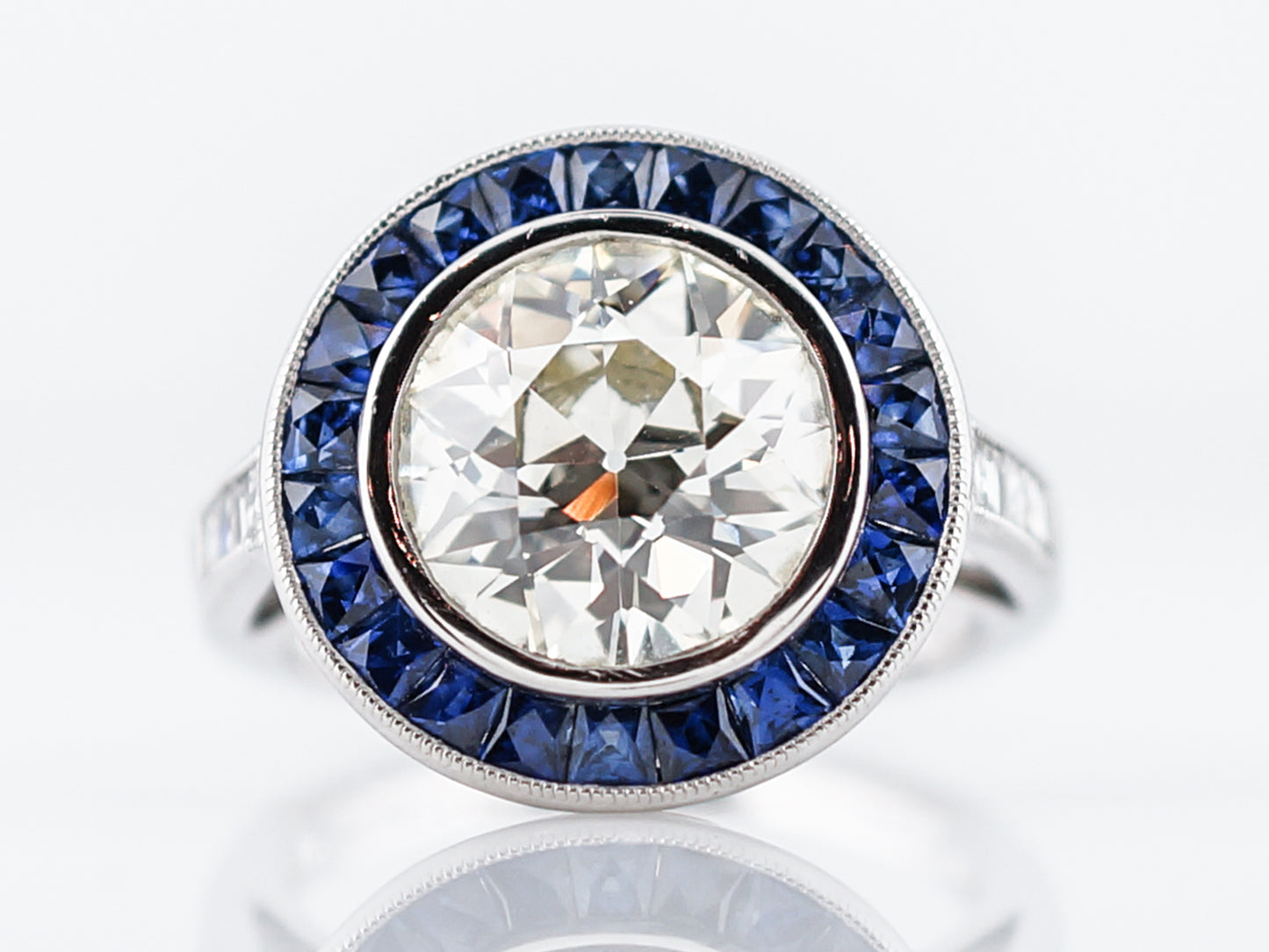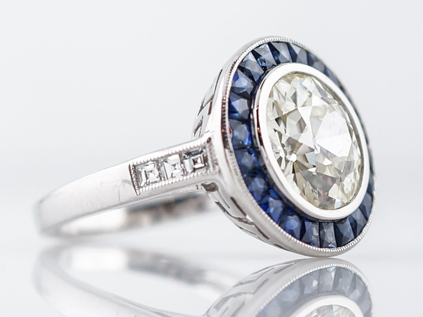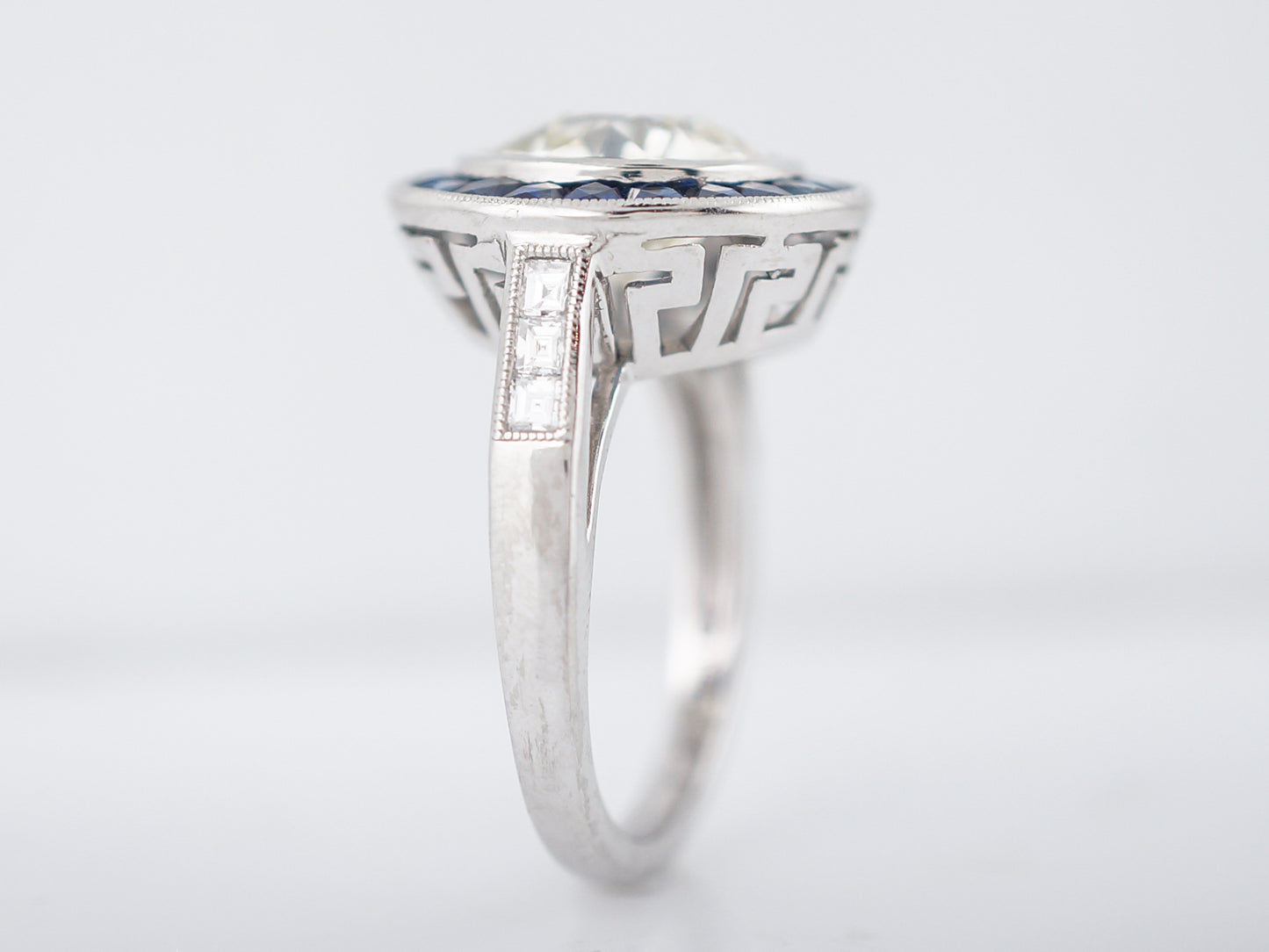 Words wont do justice to describe the beauty of this modern engagement ring but well try! The focal point of this ring is the 3.54 carat, Old European Cut diamond in the center which is bezel set and surrounded by a halo of square cut, blue sapphires weighing 1.27cttw. These sapphires are encompassed by another bezel setting and milgrain detailing around the diameter of the top of the ring. One each side lie three (3) ascher cut diamonds which are channel set into the band and outlined in milgrain detailing. The real showstopper of this pieces is the Greek key pattern cut into the profile view of the crown. Cast all in platinum, the wow factor of this ring is off the charts.