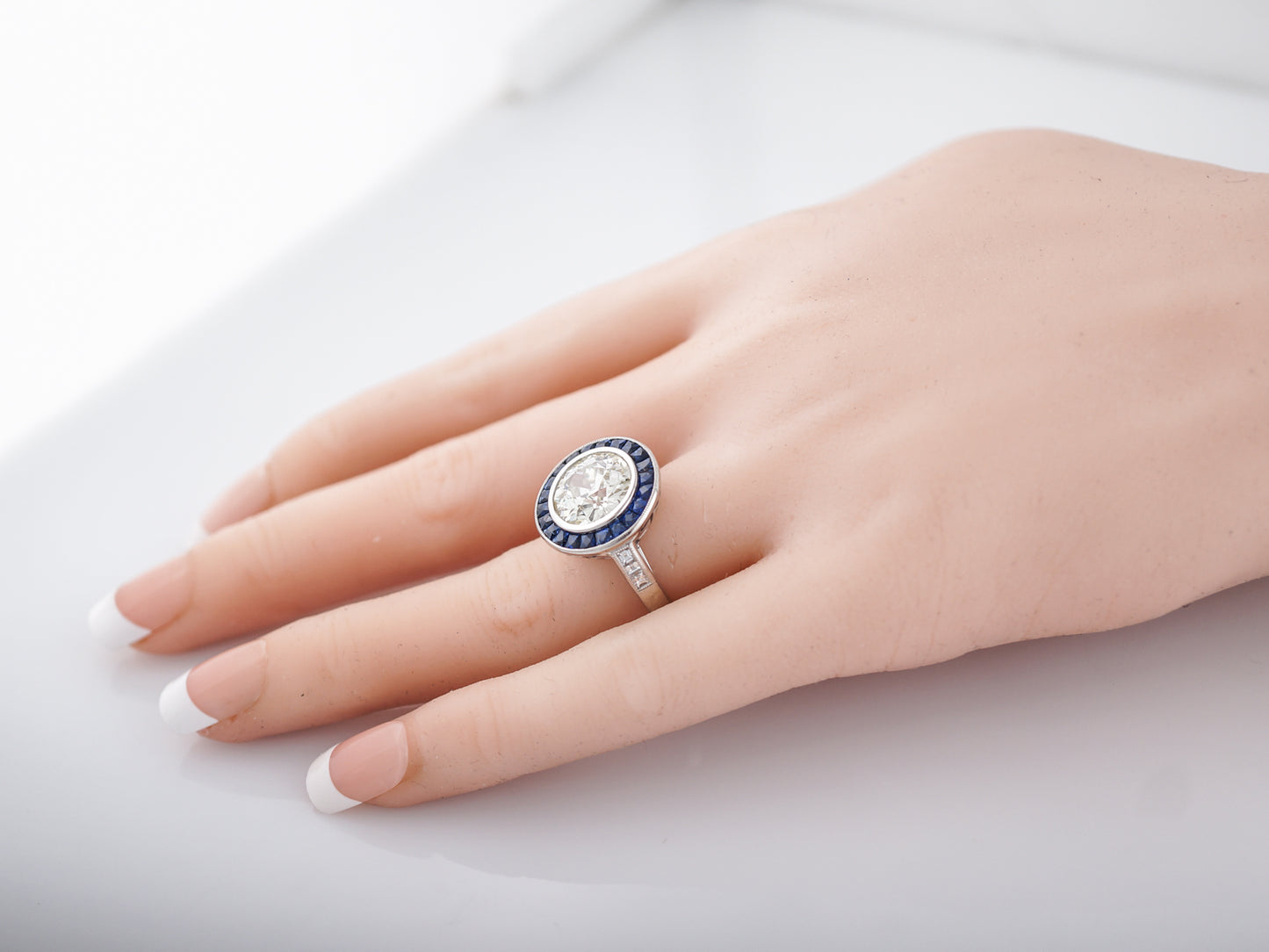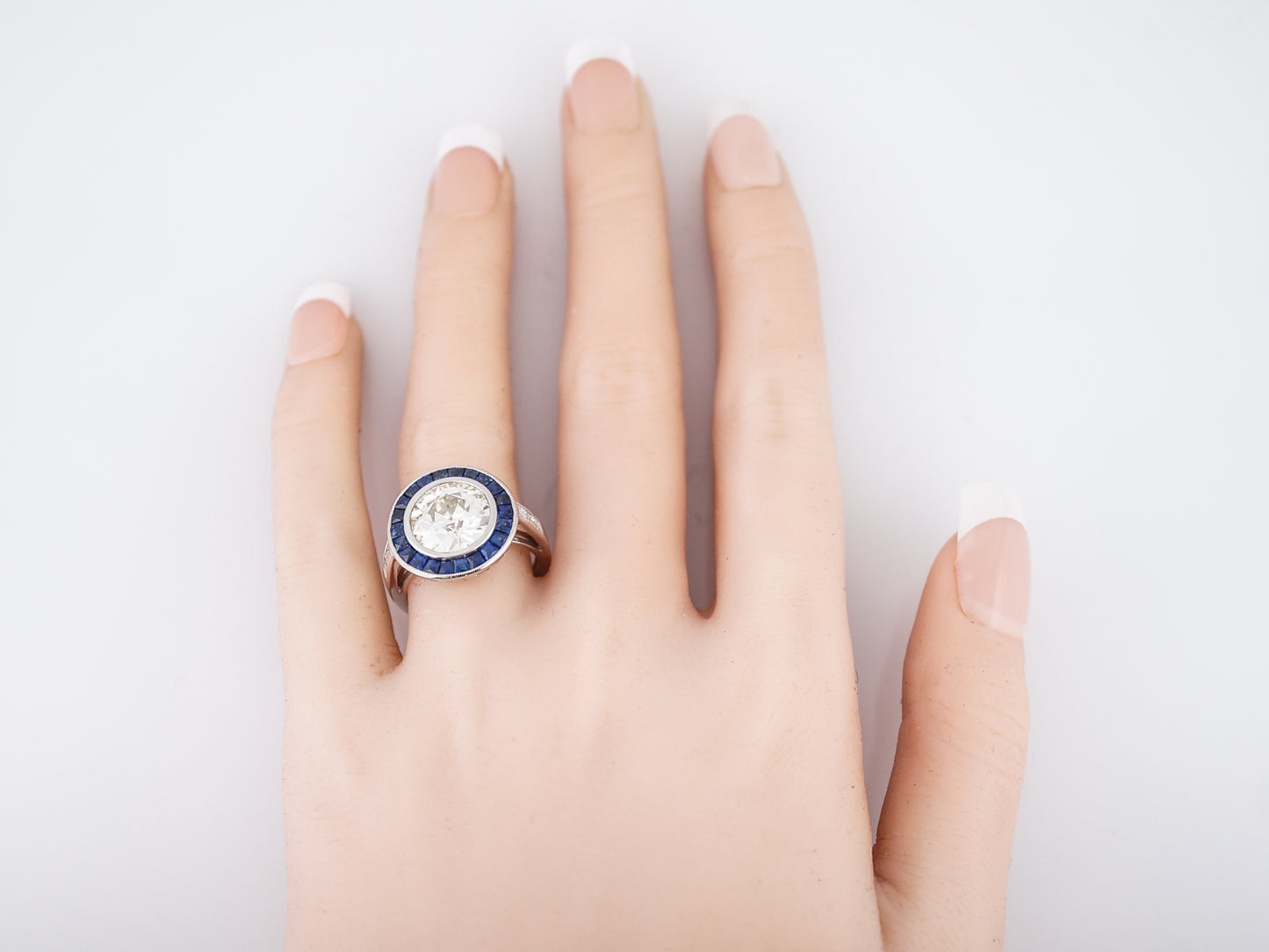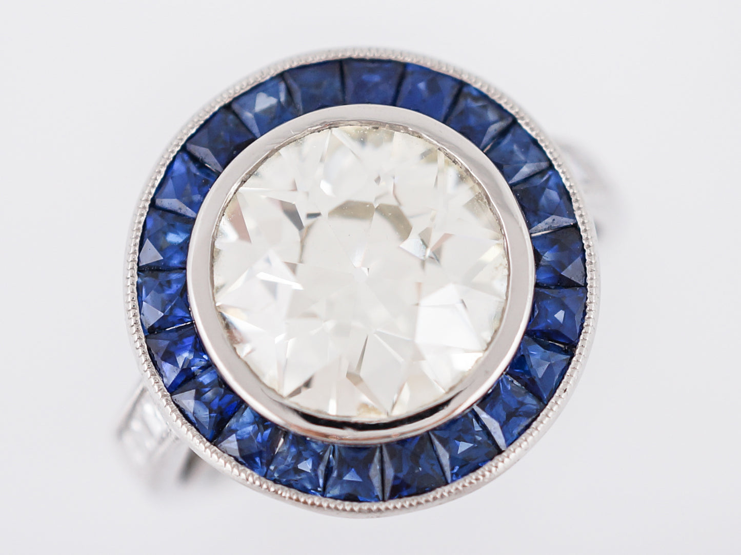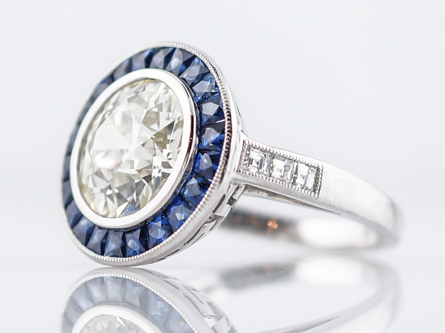 Words wont do justice to describe the beauty of this modern engagement ring but well try! The focal point of this ring is the 3.54 carat, Old European Cut diamond in the center which is bezel set and surrounded by a halo of square cut, blue sapphires weighing 1.27cttw. These sapphires are encompassed by another bezel setting and milgrain detailing around the diameter of the top of the ring. One each side lie three (3) ascher cut diamonds which are channel set into the band and outlined in milgrain detailing. The real showstopper of this pieces is the Greek key pattern cut into the profile view of the crown. Cast all in platinum, the wow factor of this ring is off the charts.