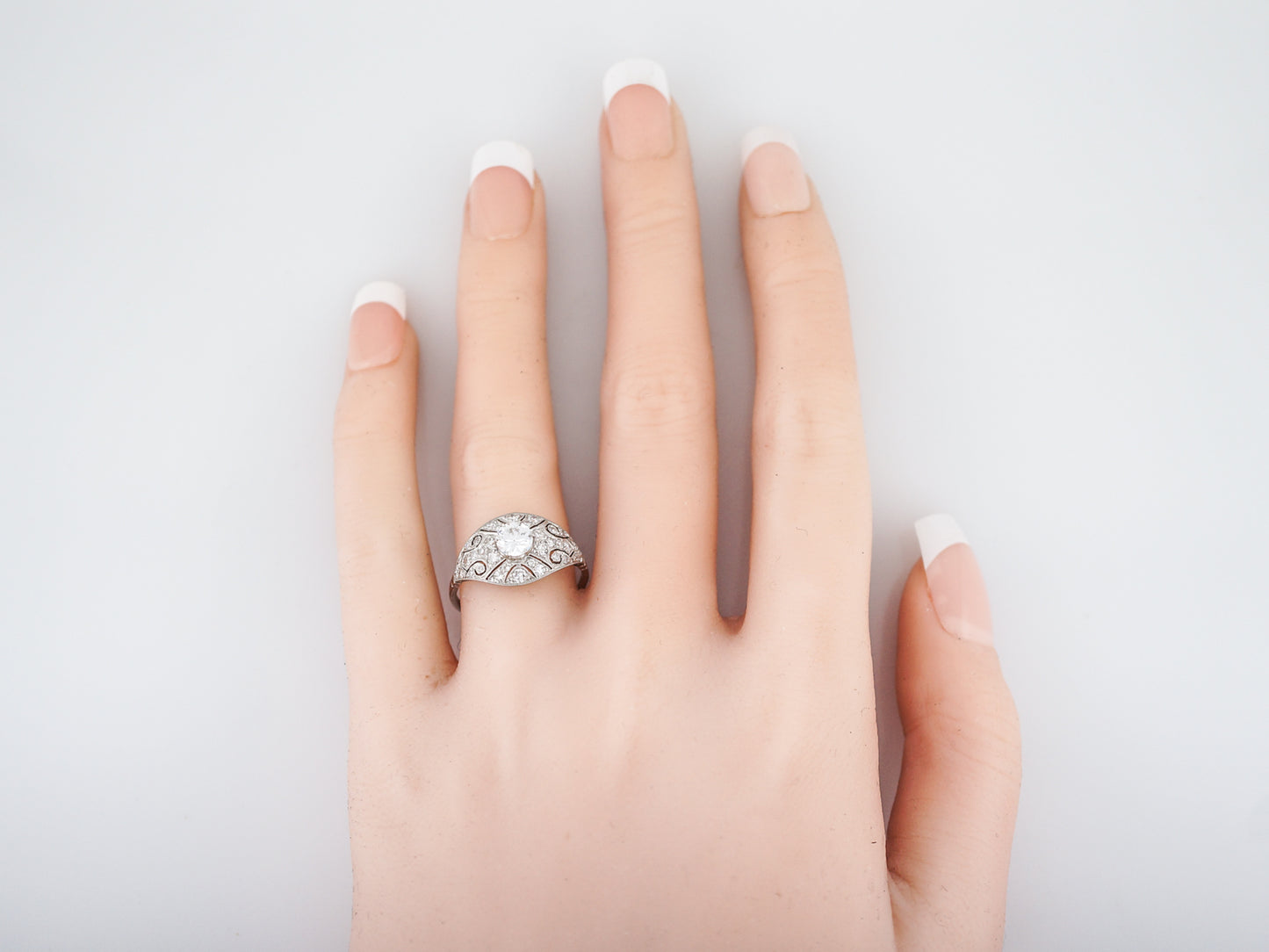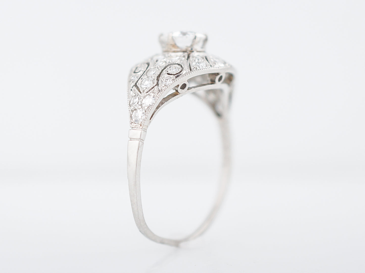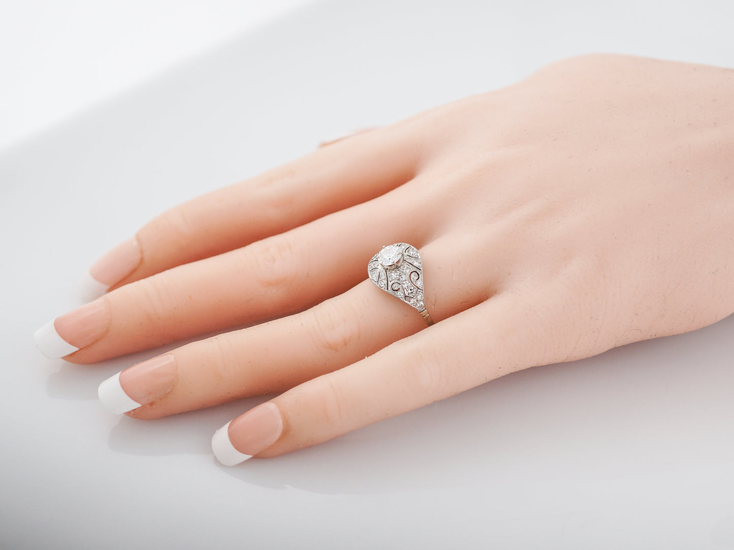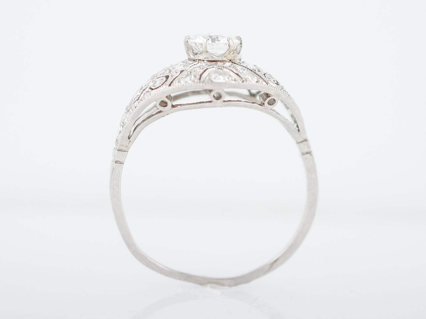 This Modern Era engagement ring might just trick you into thinking that its from the Art Deco period. Cast in platinum, with scrolling filigree detail and milgrain edging this ring is truly vintage inspired. A sparkling .38 carat Old European cut diamond is prong set low in the center giving the ring a flat, comfortable feel.