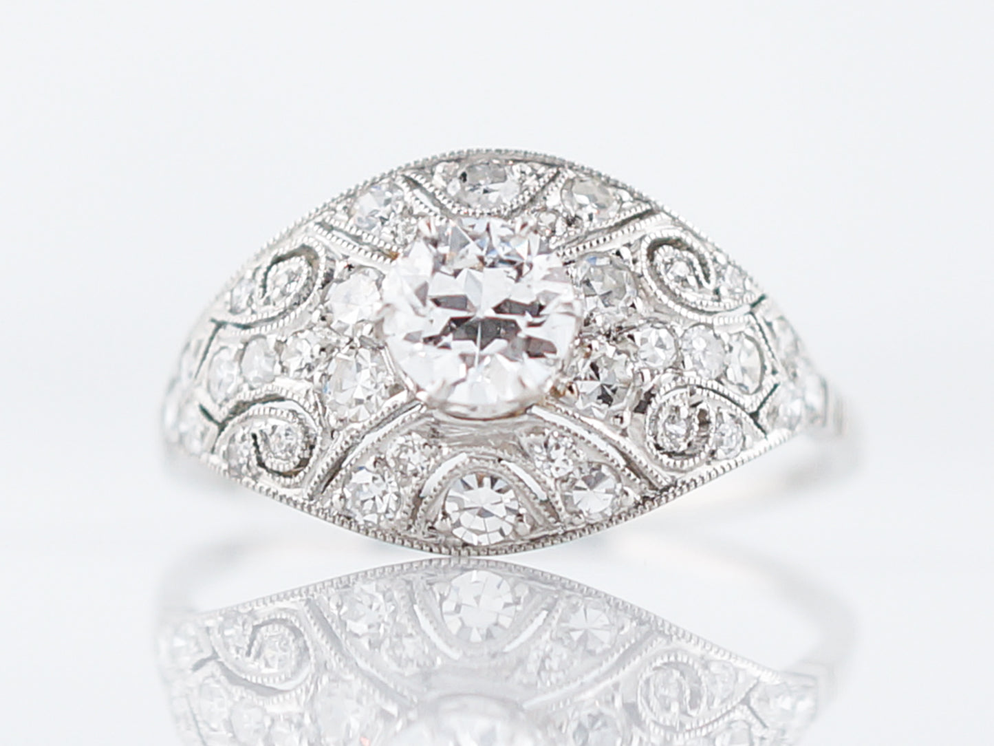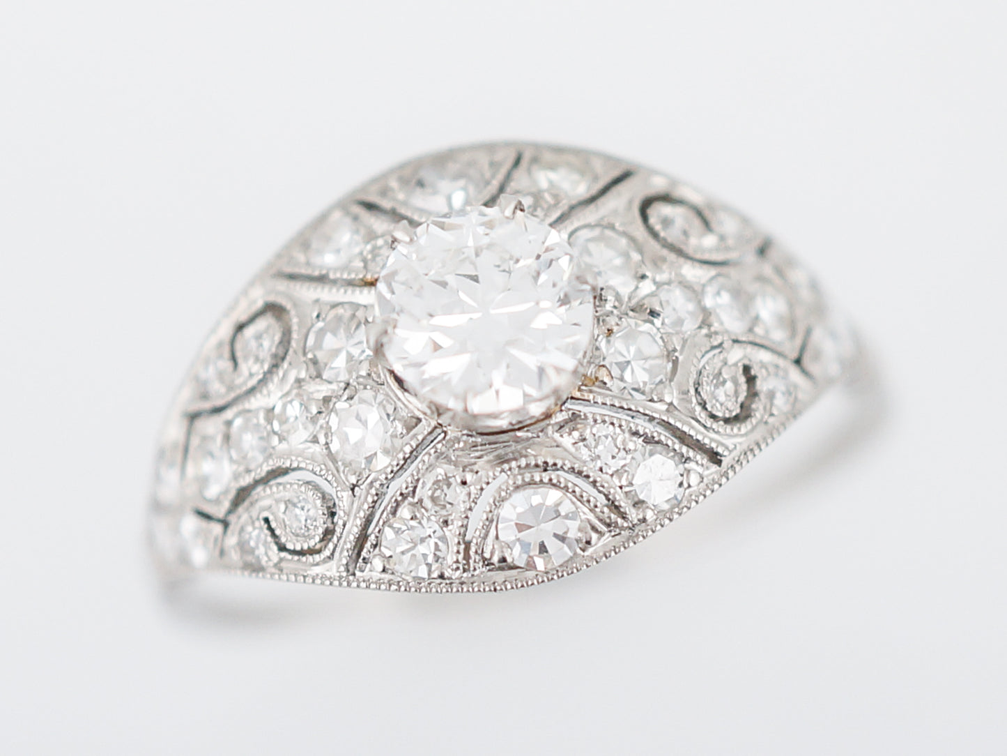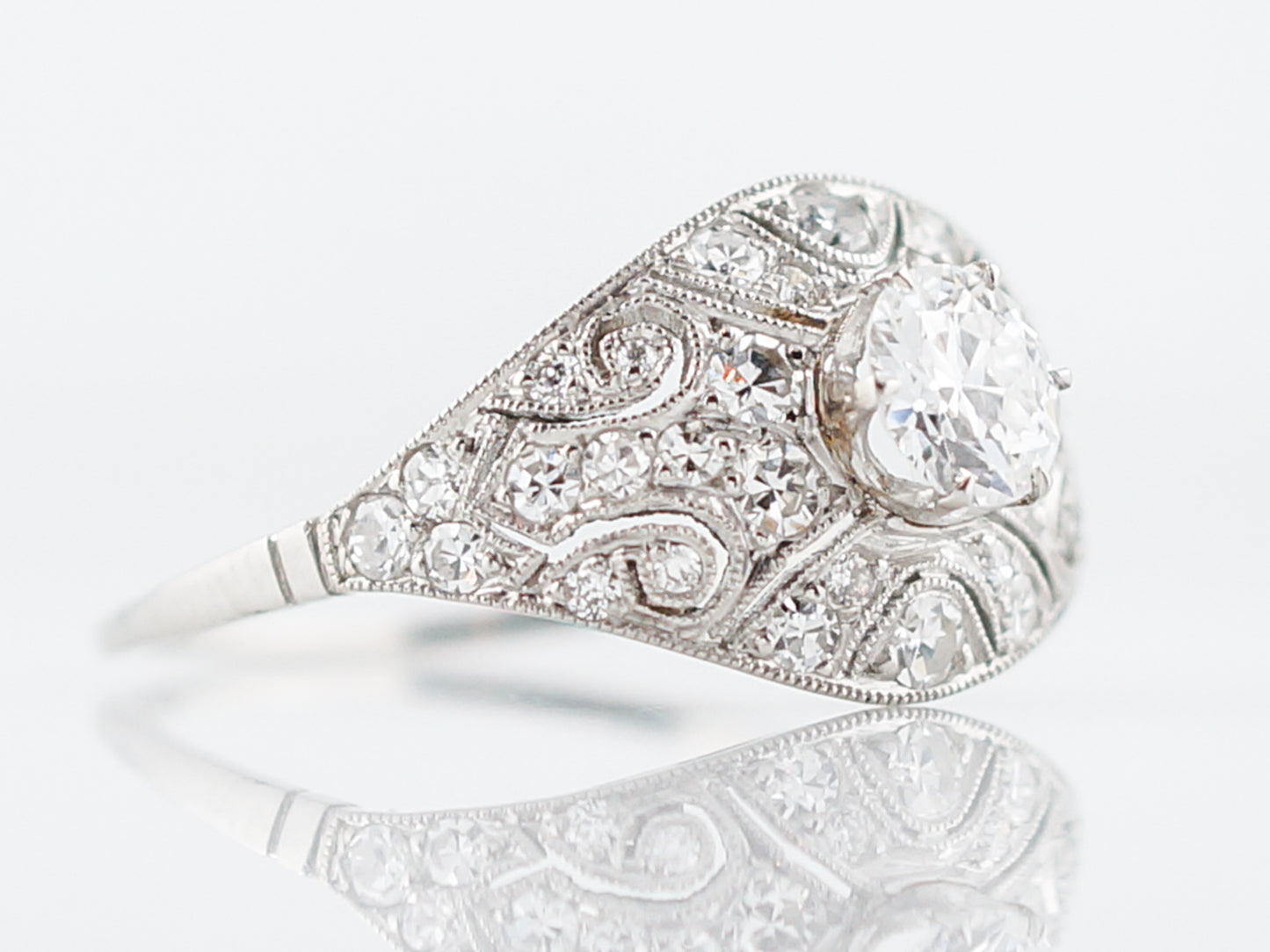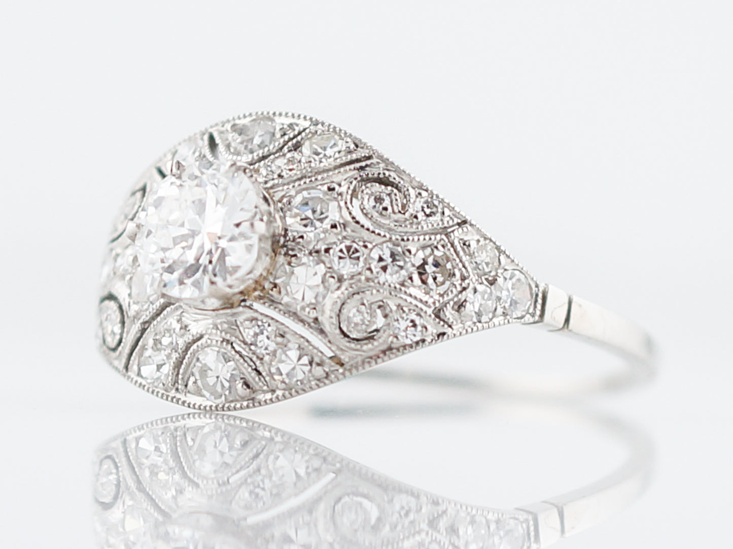 This Modern Era engagement ring might just trick you into thinking that its from the Art Deco period. Cast in platinum, with scrolling filigree detail and milgrain edging this ring is truly vintage inspired. A sparkling .38 carat Old European cut diamond is prong set low in the center giving the ring a flat, comfortable feel.
