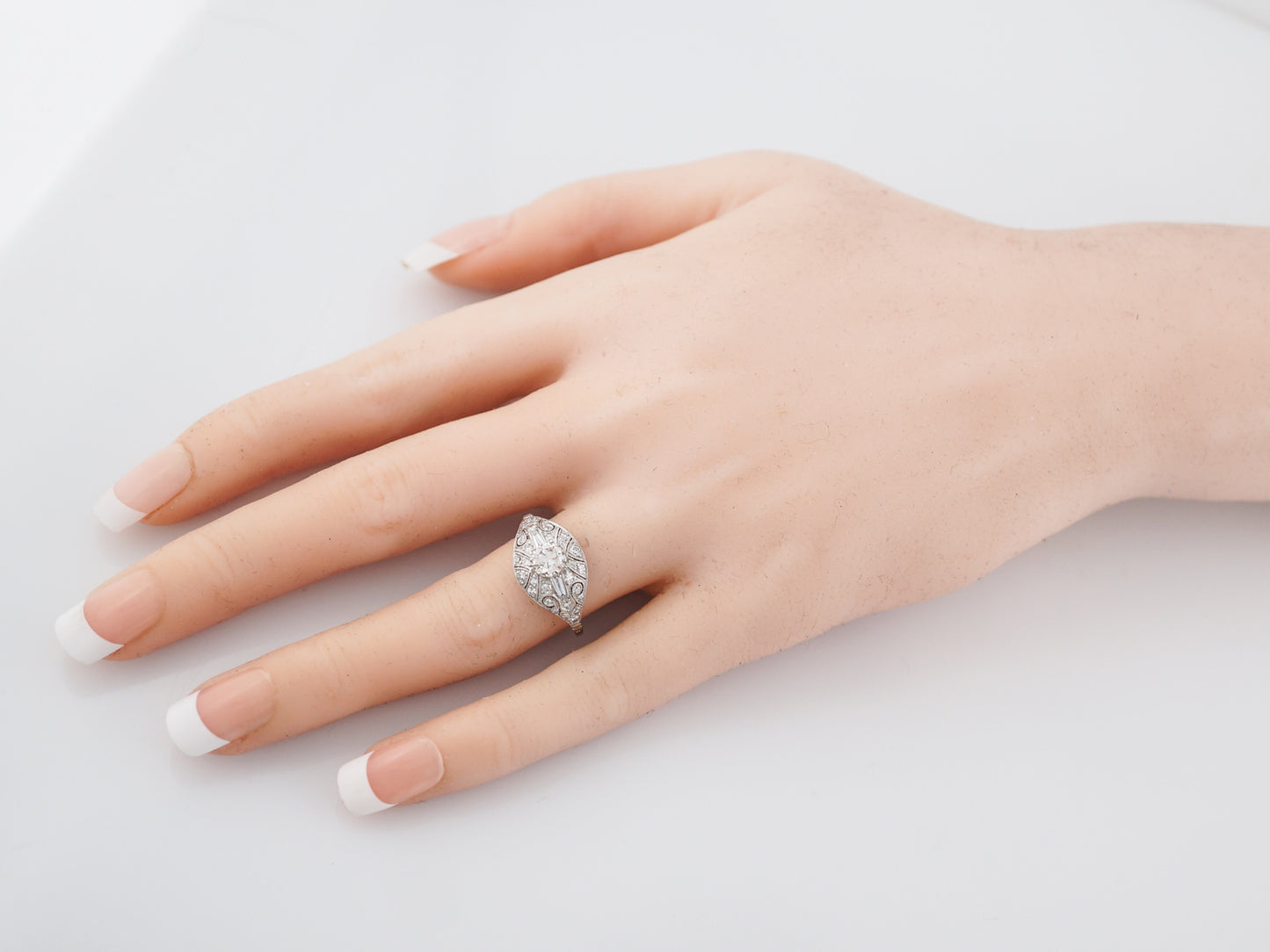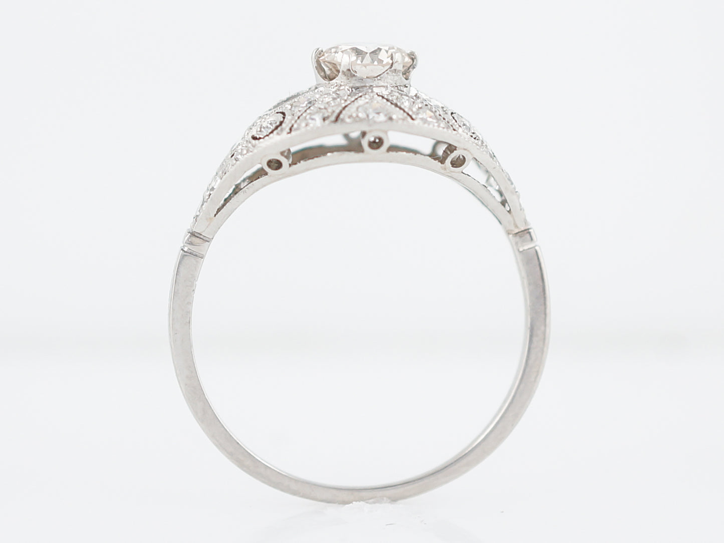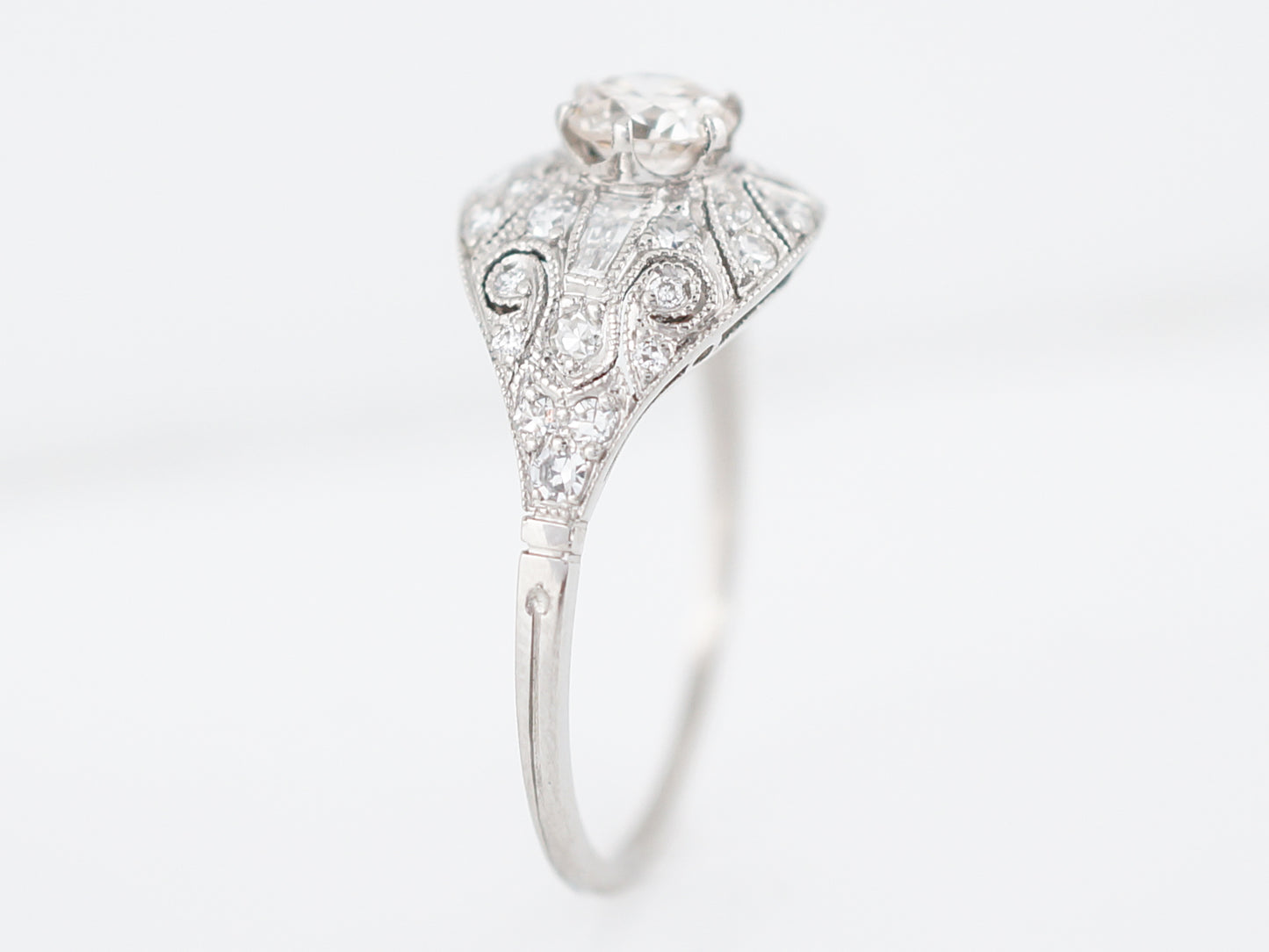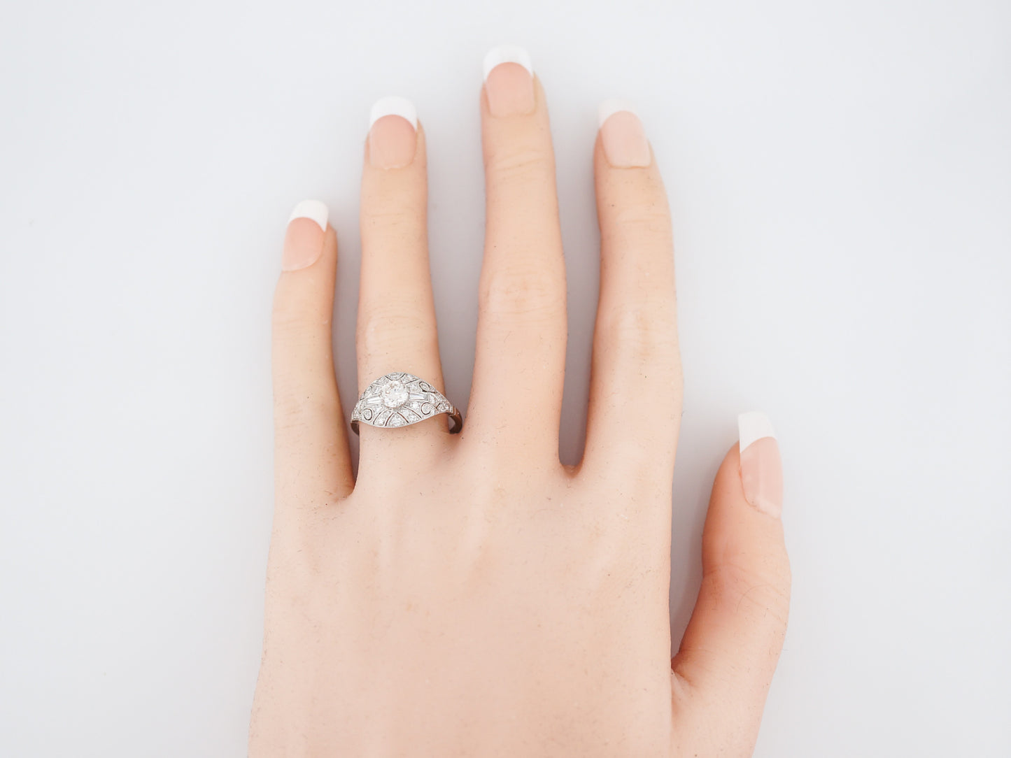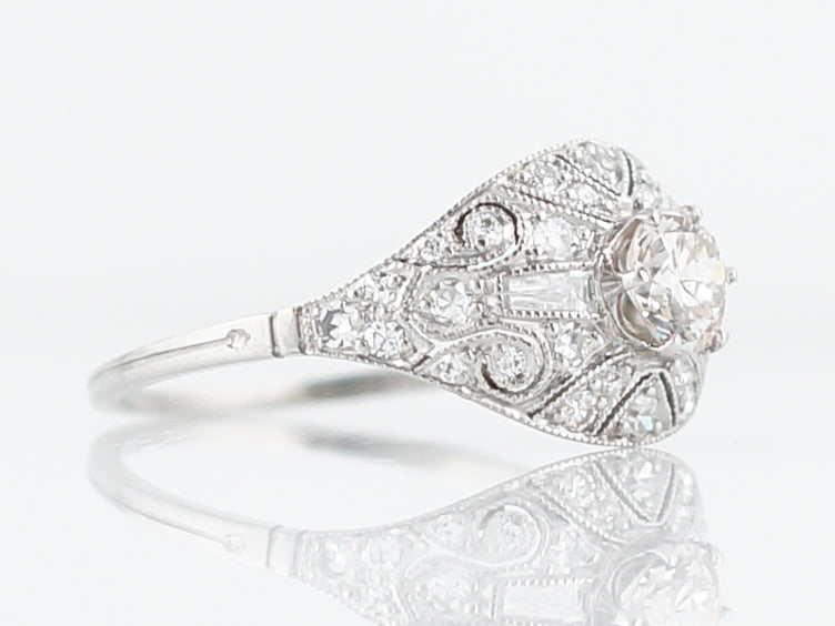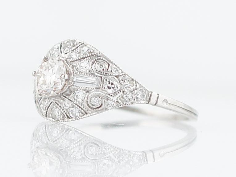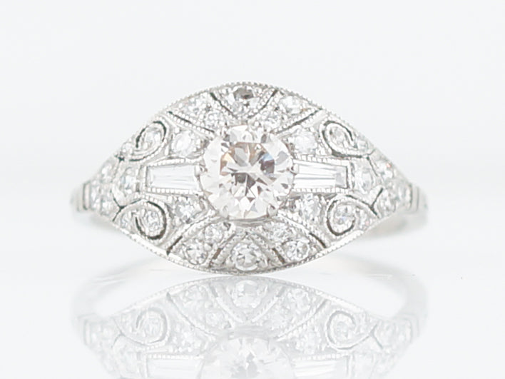 Reminiscent of the Art Deco Era, this Modern engagement ring has a vintage air about it. The center stone is a .47 carat round brilliant diamond which is flanked by two tapered baguettes. The center stones are surrounded by .33 carats of diamonds which are set into flowing milgrain detailing and open space really playing up the homage to vintage design. Cast in Platinum, this ring has a slight dome but sits low to the finger overall.