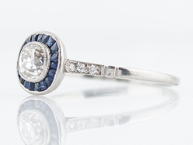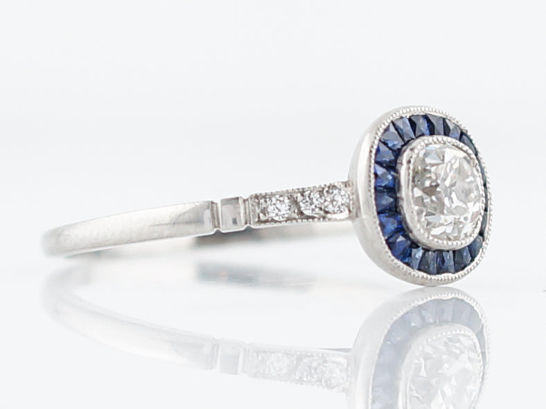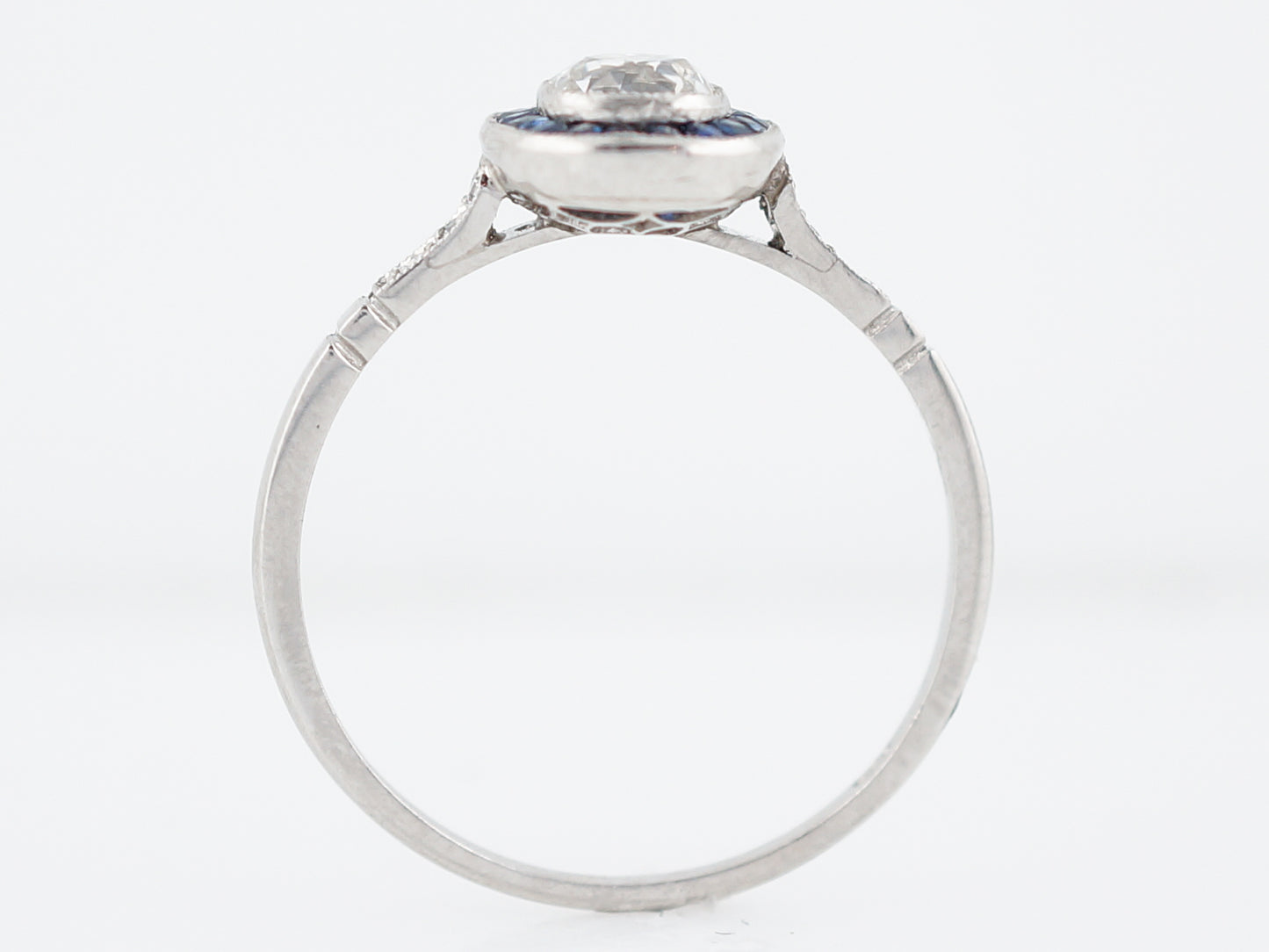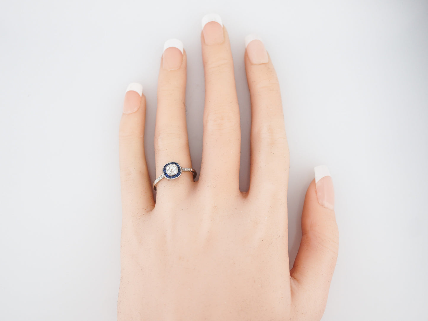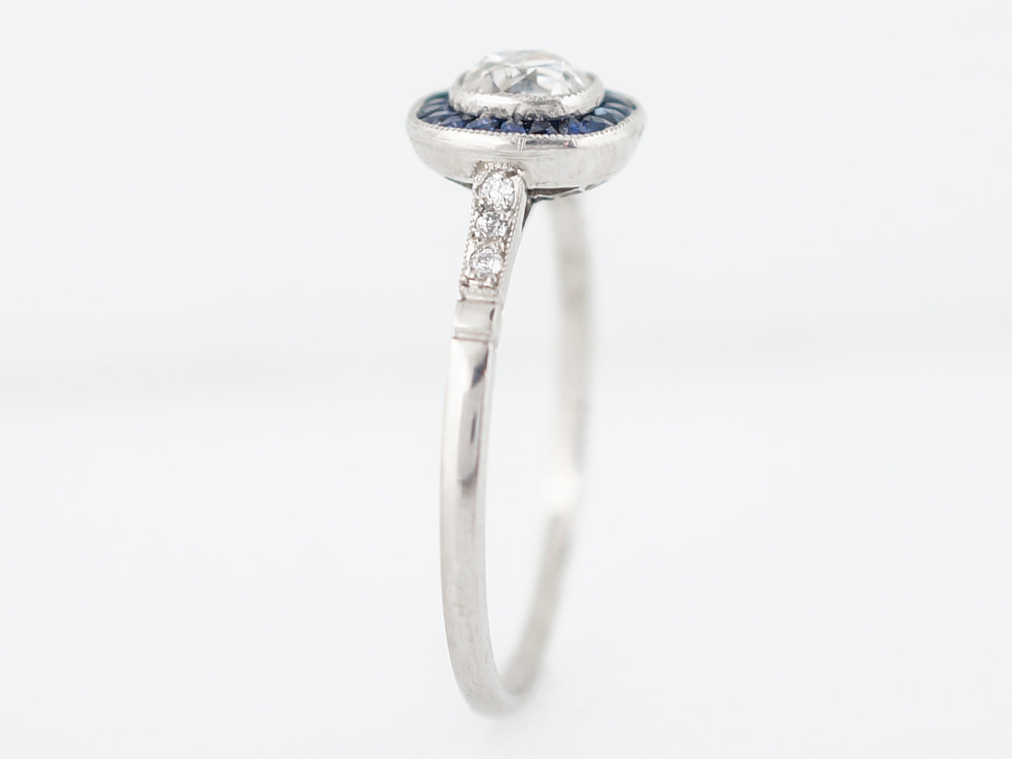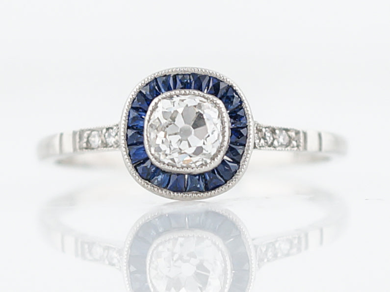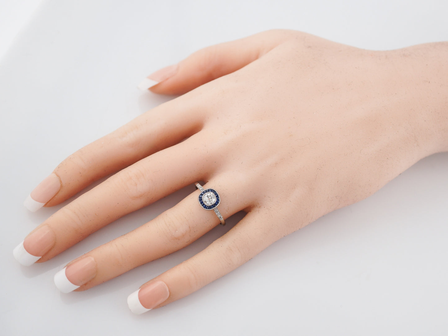 This ring is a beautiful fusion of modern and vintage. While the setting of the ring is modern the center diamond is a .50 carat Old Mine cushion cut diamond set in a bezel. The center diamond is surrounded by square cut blue sapphires and the thin band is set with six (6) round brilliant cut diamonds, three (3) on each side. Made in platinum, this ring has a bright white finish and delicate milgrain detailing around the stones.