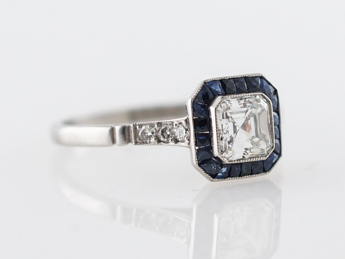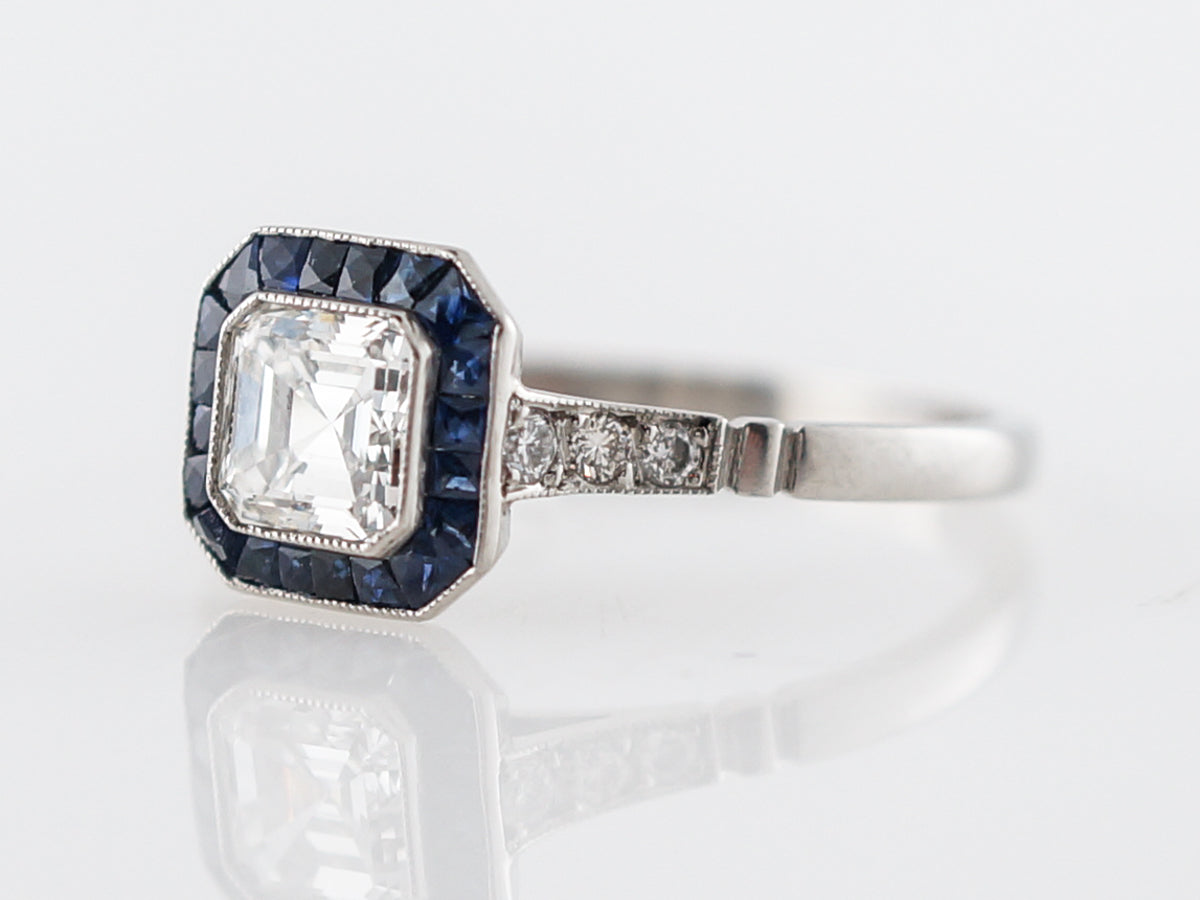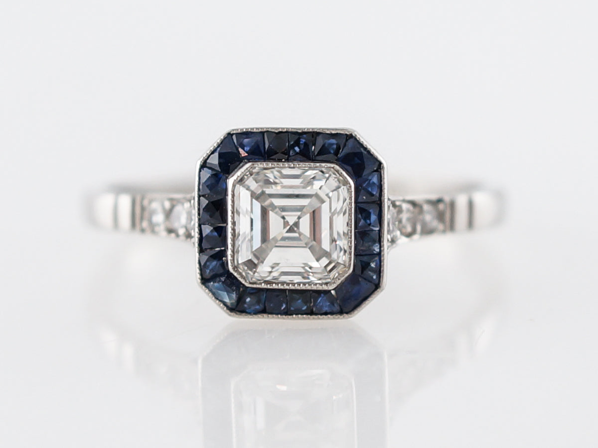This modern engagement ring features a .66 asscher cut diamond. The center diamond is accented by a halo of French cut sapphires that provide a gorgeous frame for the stunning center stone. Additional accent diamonds adorn the shoulders of the ring while the undercarriage is beautiful open filigree work, allowing light to flow through and out the center diamond. Finished in platinum, this geometric ring is a true stunner!