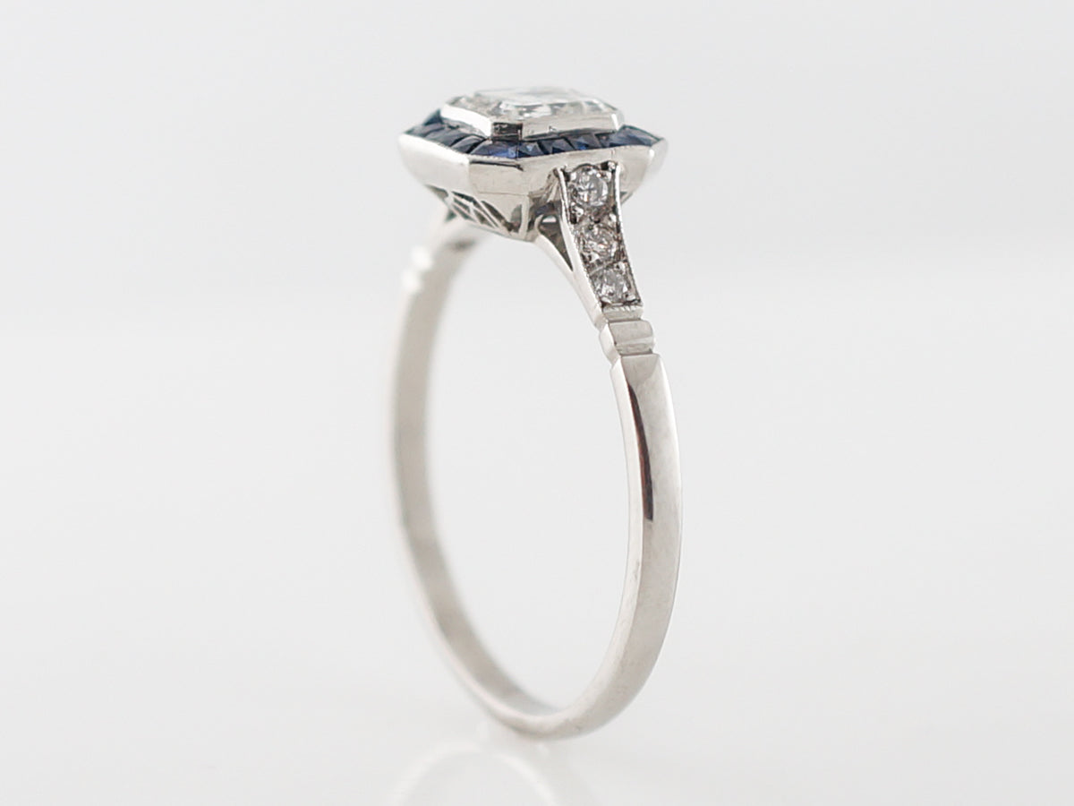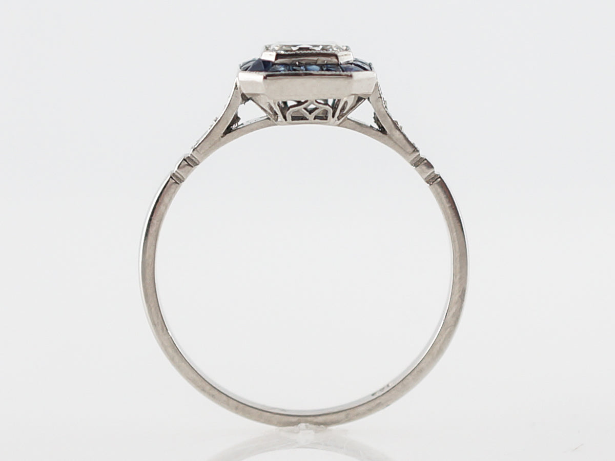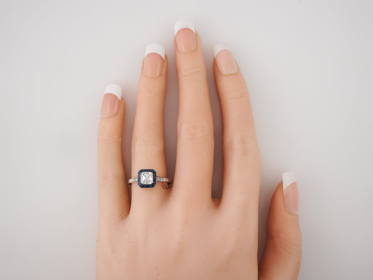 This modern engagement ring features a .66 asscher cut diamond. The center diamond is accented by a halo of French cut sapphires that provide a gorgeous frame for the stunning center stone. Additional accent diamonds adorn the shoulders of the ring while the undercarriage is beautiful open filigree work, allowing light to flow through and out the center diamond. Finished in platinum, this geometric ring is a true stunner!