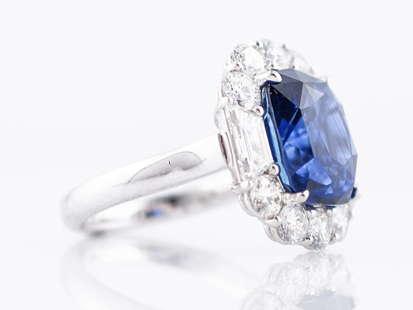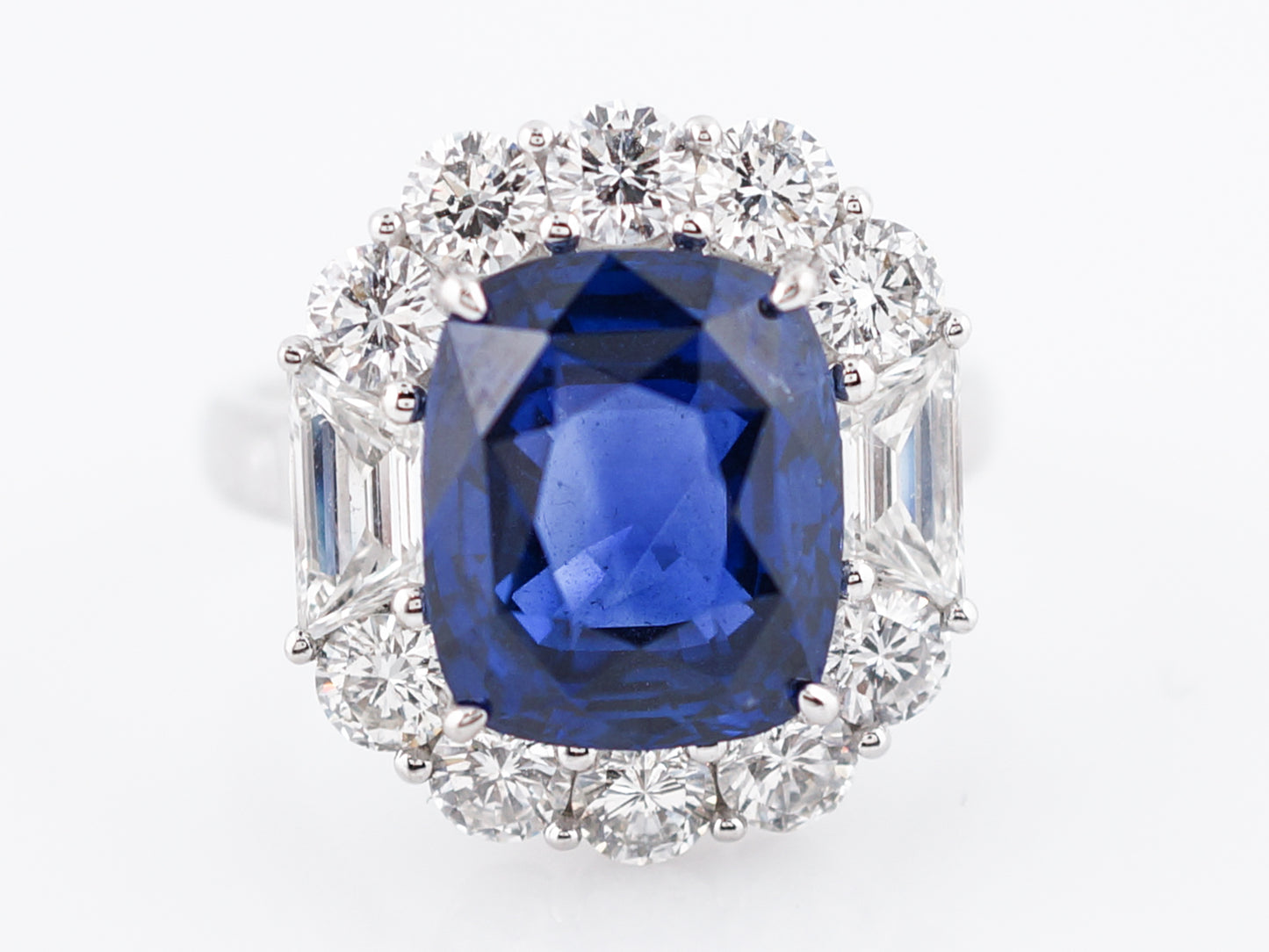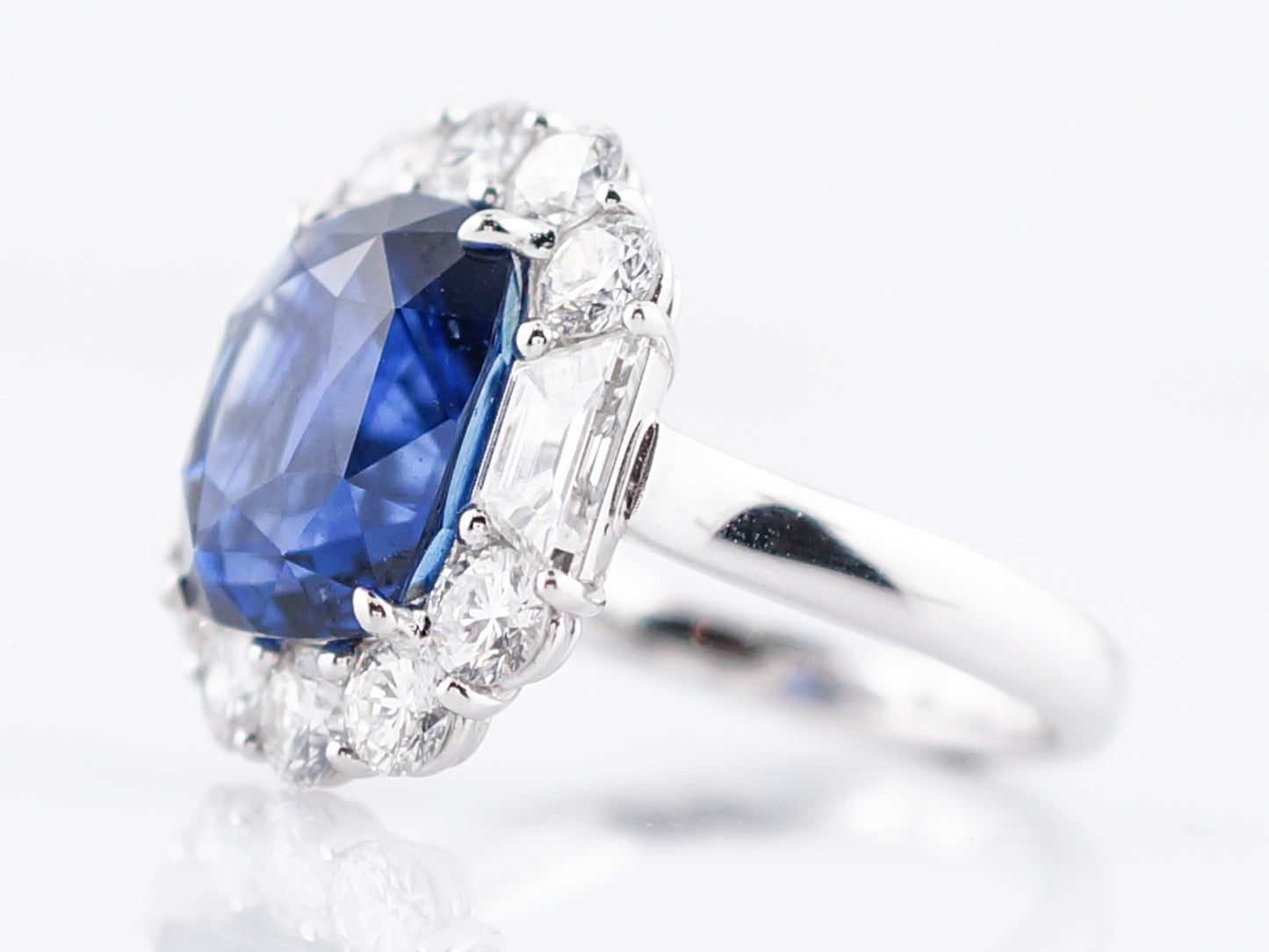 This Modern Era engagement ring might just give Princess Dianas engagement ring a run for its money. Set in platinum, the center stone is a stunning 7.62 carat, cushion cut, blue sapphire set in four prongs. The sapphire is surrounded by 2.15 carats total weight of diamonds, but what makes this ring unique is that while there are ten (10) round brilliant diamonds that crest the top and bottom of the sapphire, two (2) trapezoid shaped diamonds which fit perfectly into the halo.