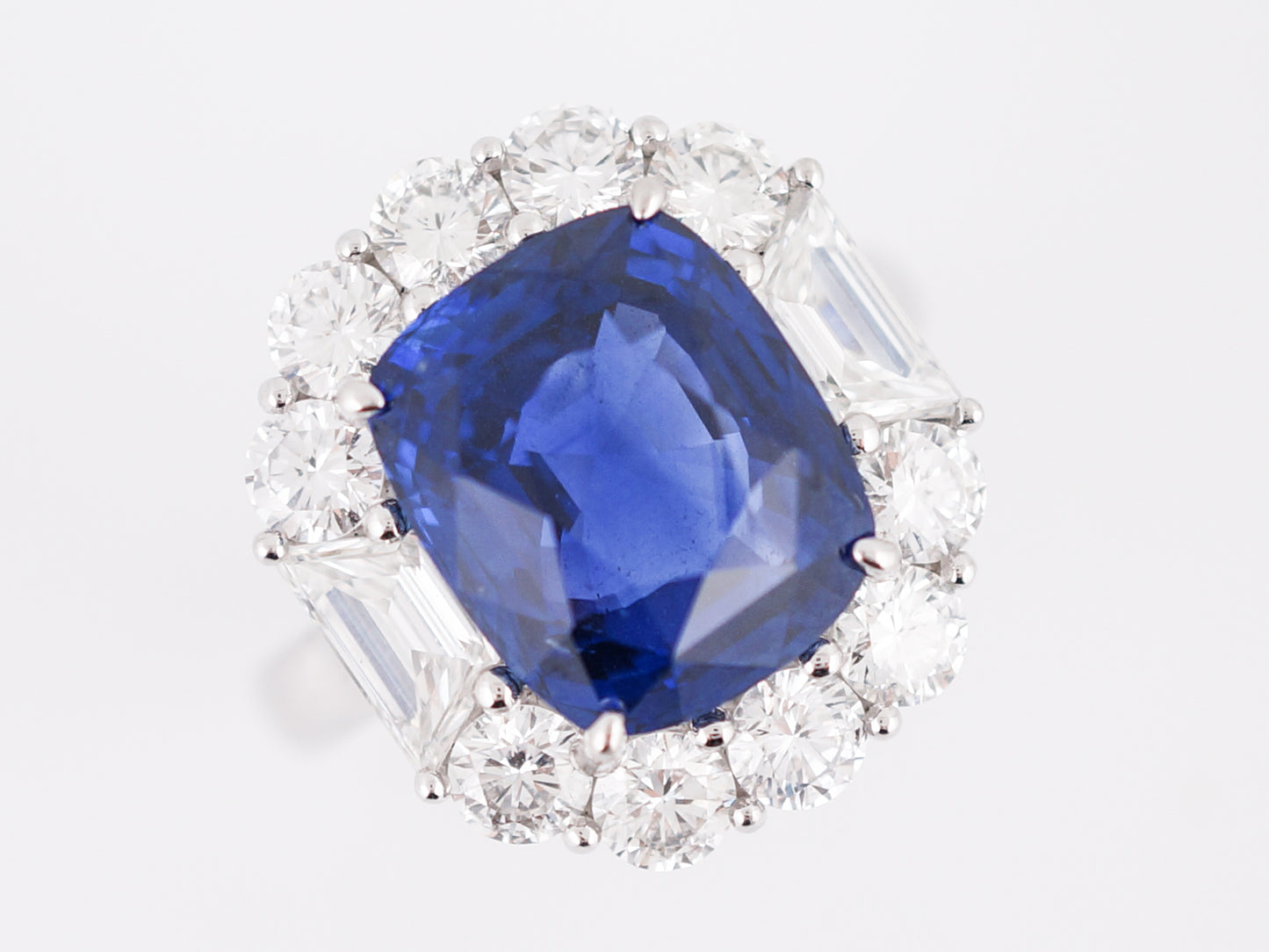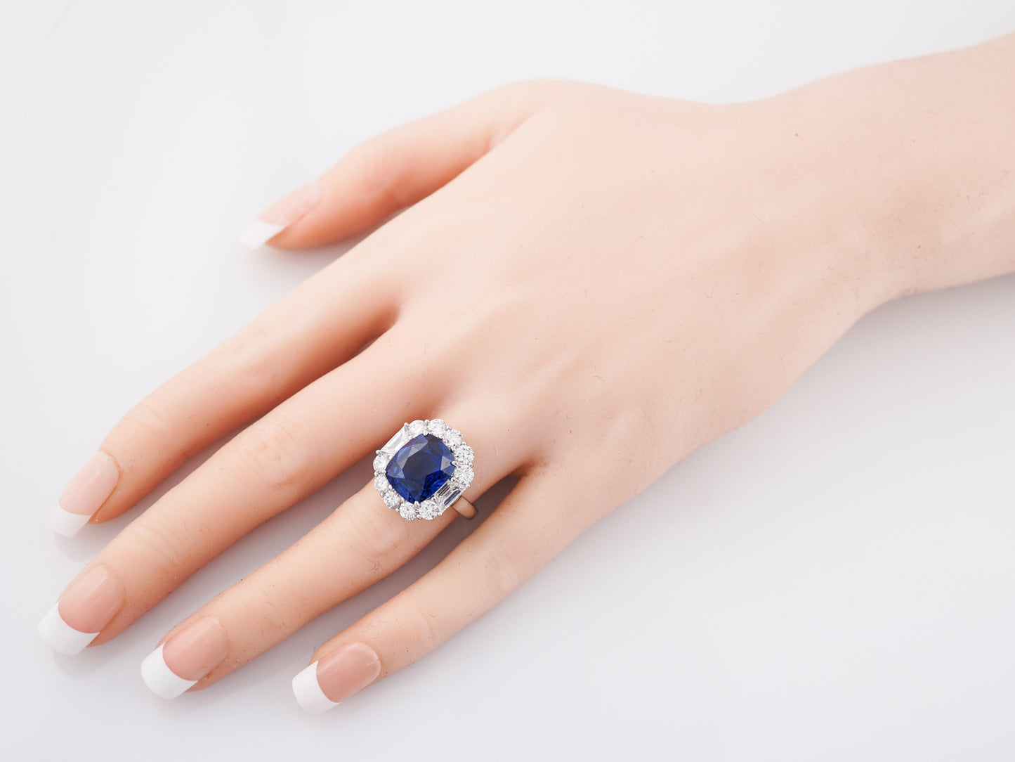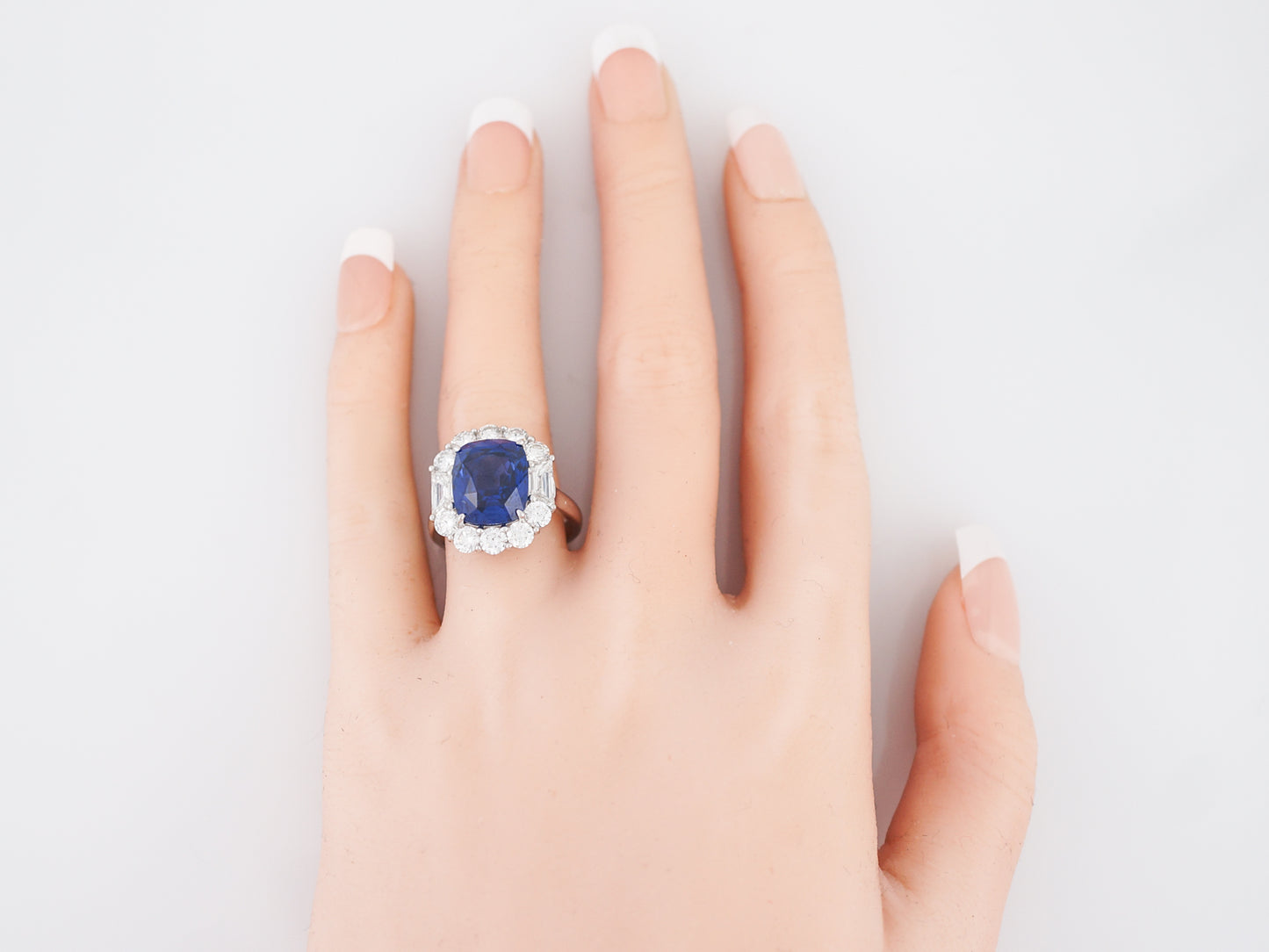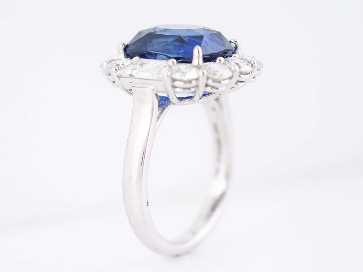 This Modern Era engagement ring might just give Princess Dianas engagement ring a run for its money. Set in platinum, the center stone is a stunning 7.62 carat, cushion cut, blue sapphire set in four prongs. The sapphire is surrounded by 2.15 carats total weight of diamonds, but what makes this ring unique is that while there are ten (10) round brilliant diamonds that crest the top and bottom of the sapphire, two (2) trapezoid shaped diamonds which fit perfectly into the halo.
