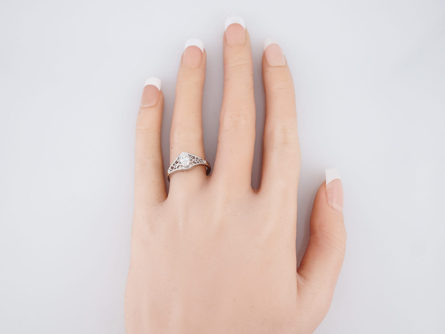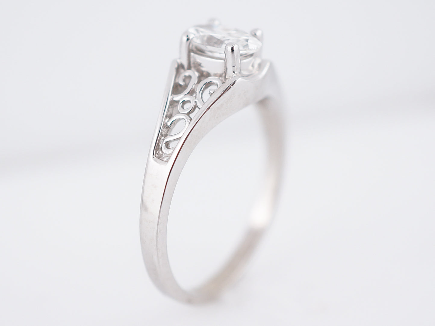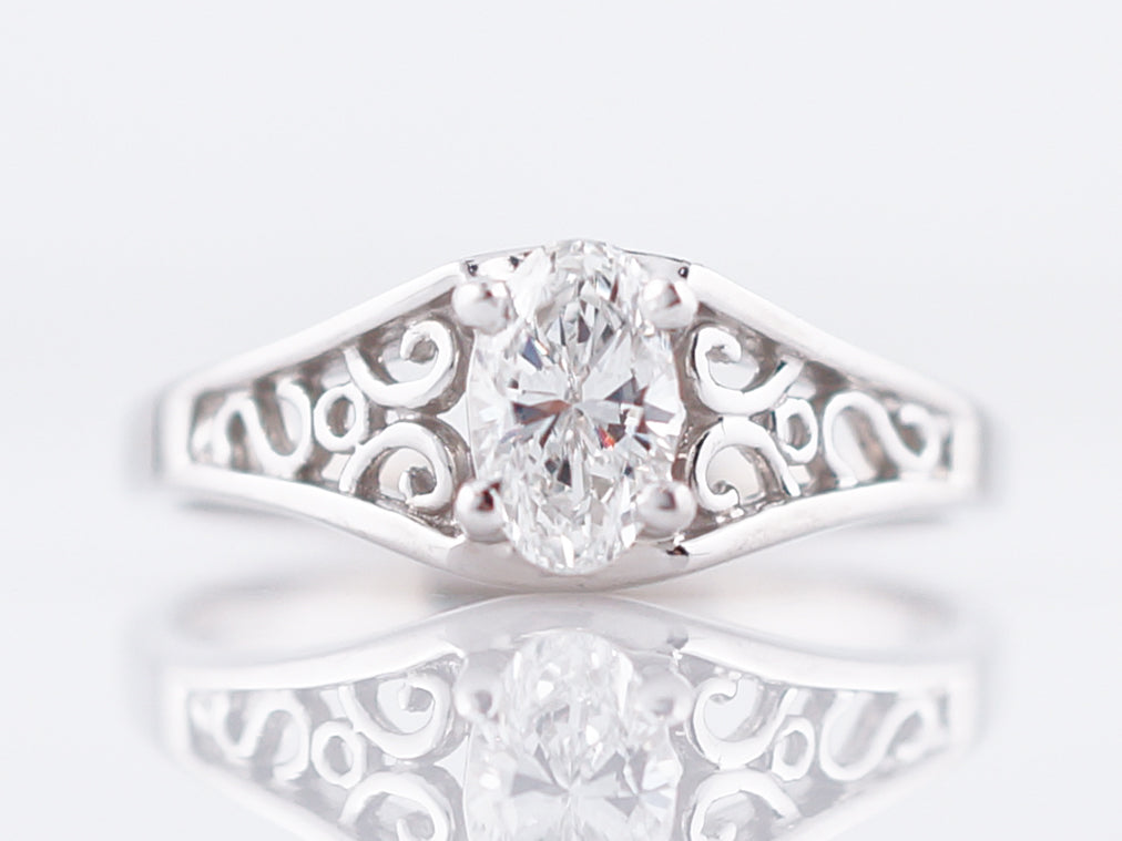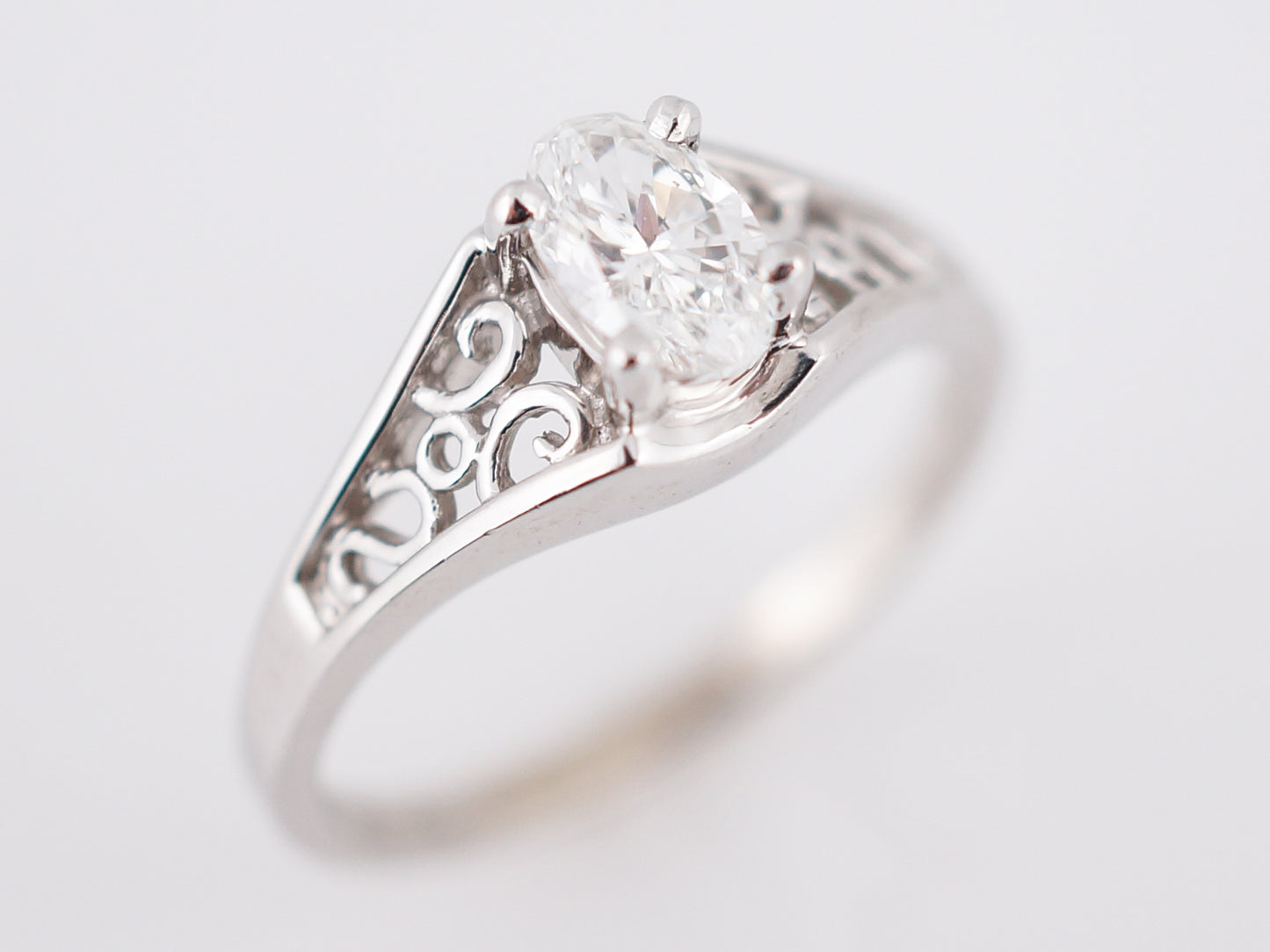 The swirl design on this ring is a modern take on art deco filigree. The center stone is a .71 carat oval cut diamond that sparkles from every angle and adds a modern touch. The diamond is prong set, allowing for maximum brilliance while the swirling filigree allows light to penetrate from all angles. The tapered setting provides a unique geometric shape and will allow for a wedding band to snuggle in nicely for stacking. This engagement ring combines both antique and modern styles and is truly delightful.