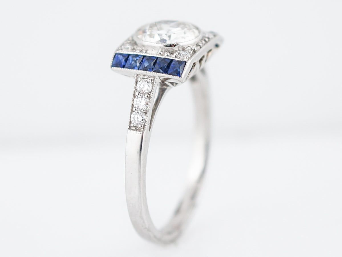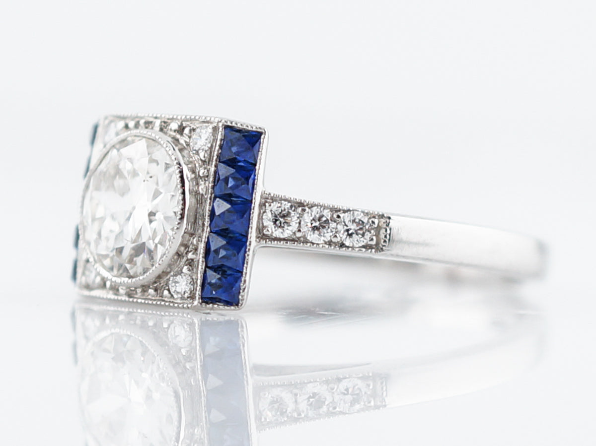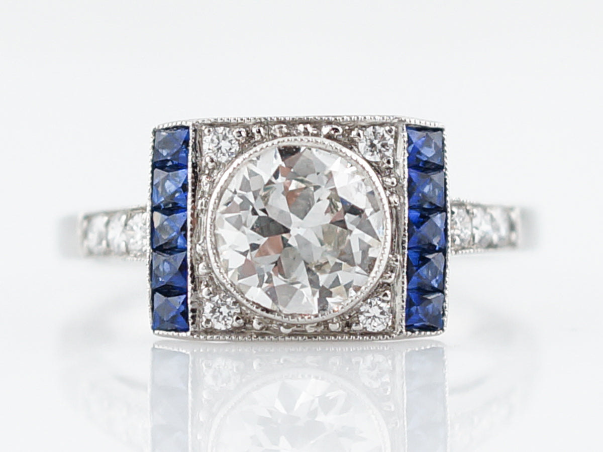 This extraordinary modern custom art deco style ring features an old mine cut .99 carat center diamond. The center diamond is bezel set and is surrounded by four (4) accent single cut diamonds. Ten (10) square cut sapphires are channel set on each side of the center stone, lending a color and boldness to the design. An additional six (6) diamonds are set into the shoulder of the ring for added luster and are framed by delicate milgrain detailing. A stunning blend of modern design with antique materials.