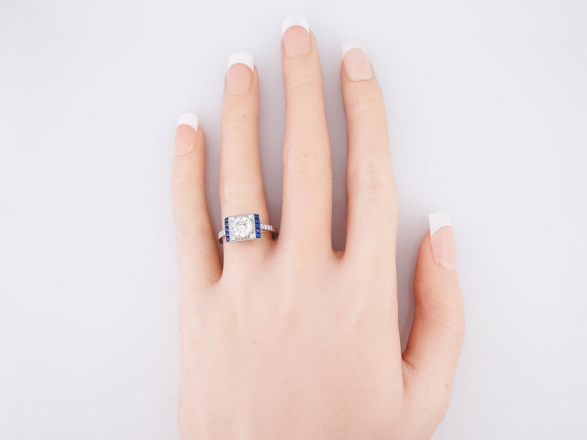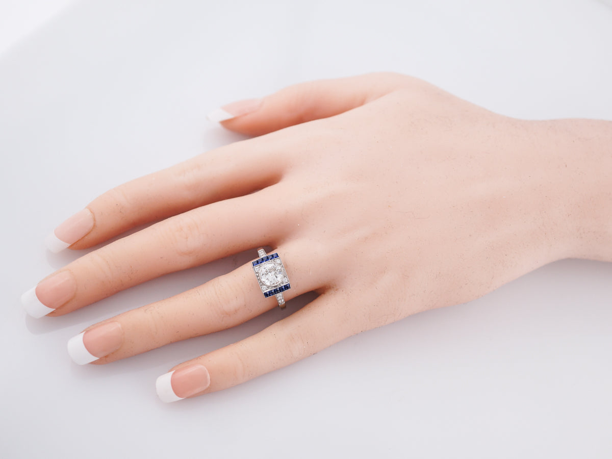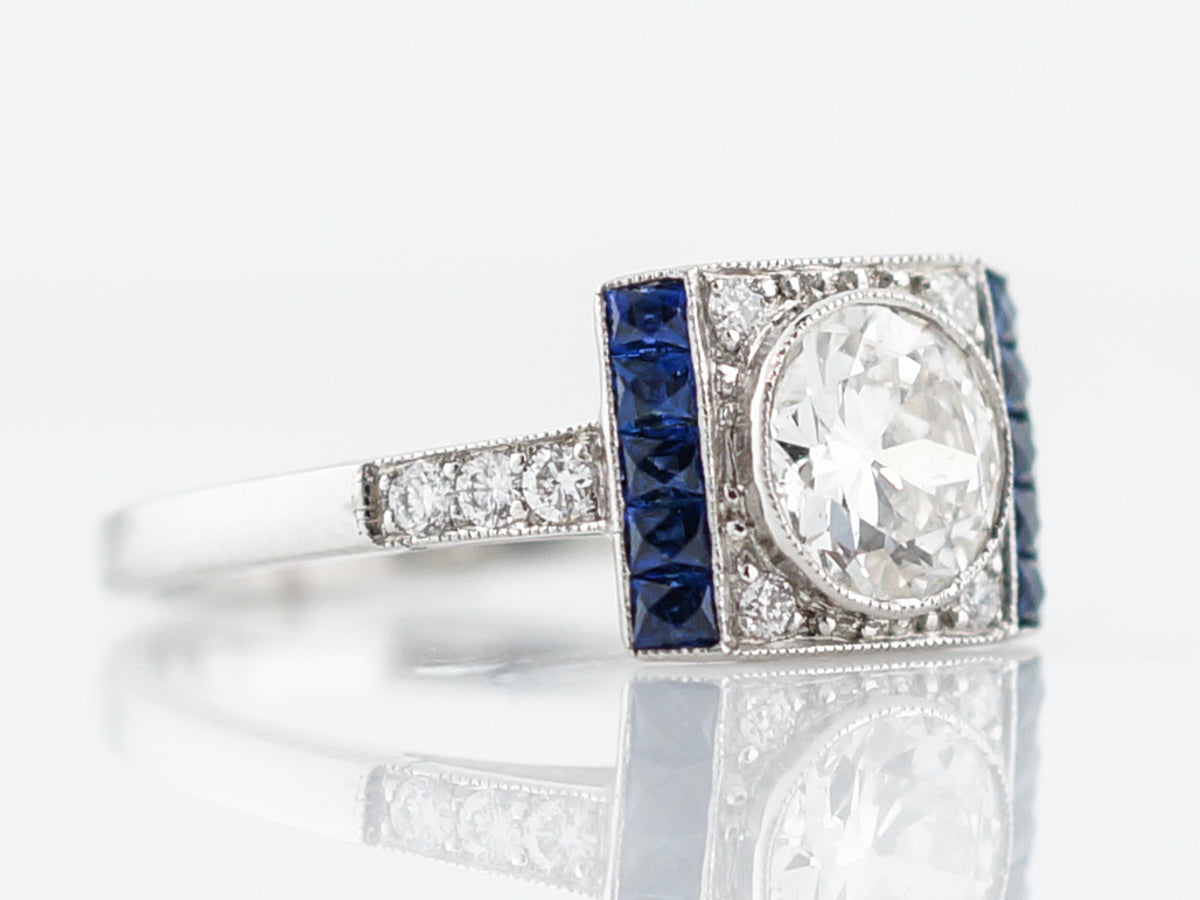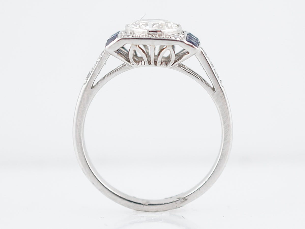 This extraordinary modern custom art deco style ring features an old mine cut .99 carat center diamond. The center diamond is bezel set and is surrounded by four (4) accent single cut diamonds. Ten (10) square cut sapphires are channel set on each side of the center stone, lending a color and boldness to the design. An additional six (6) diamonds are set into the shoulder of the ring for added luster and are framed by delicate milgrain detailing. A stunning blend of modern design with antique materials.