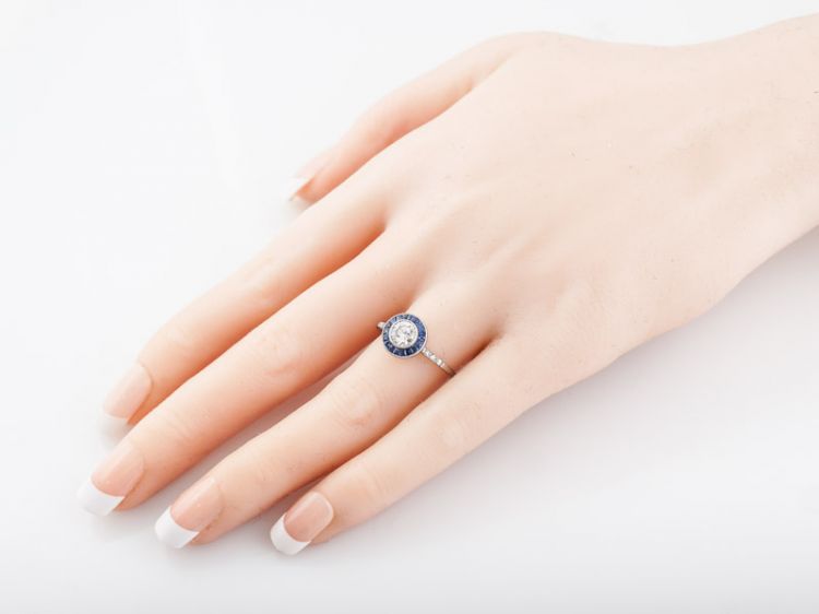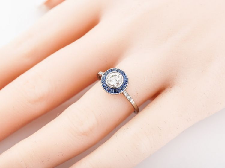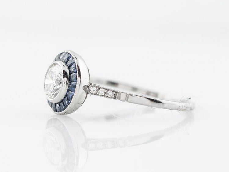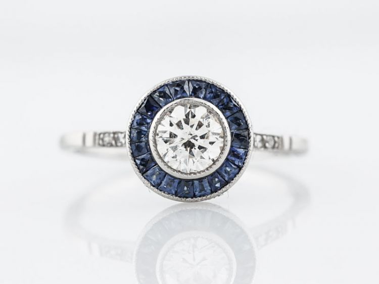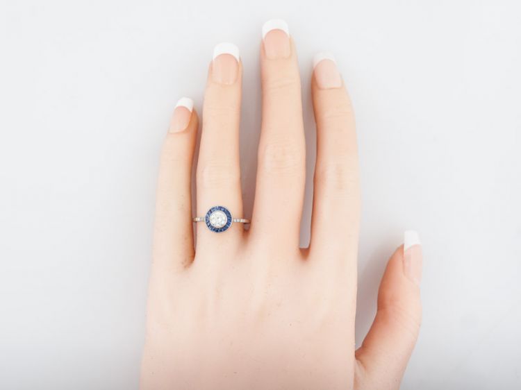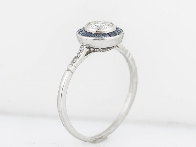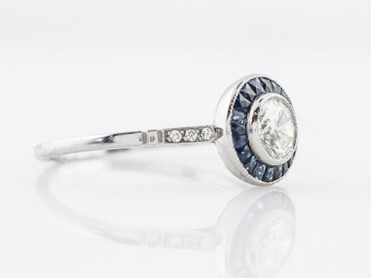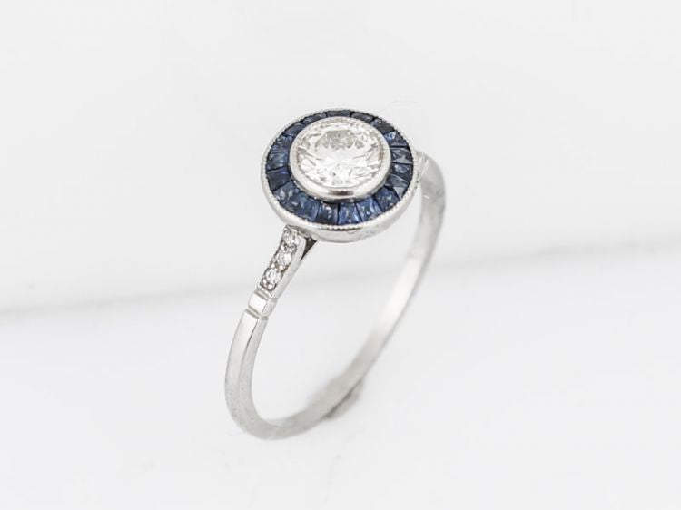 This modern diamond and sapphire engagement ring is a lovely example of bringing back Art Deco designs. The center .51 carat round brilliant is bezel set in platinum. The center diamond is accented by a sapphire halo completed in .35 carats of French cut sapphires. The sapphires add a lovely cast of blue on to the center diamond. The shoulders of the ring feature round diamonds flanking the sapphire halo.