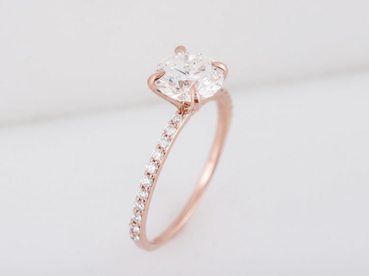 A custom designed diamond and 14K rose gold engagement ring. The ring consists of a GIA certified round brilliant cut diamond weighing 1.51 carats that is set with four (4) prongs. The shank of the ring consists of twenty-two(22) shared prong set round brilliant cut diamonds in a single row, adding a modern touch of sparkle. The D color center stone is extremely white and vibrant and makes for a show stopping engagement ring!