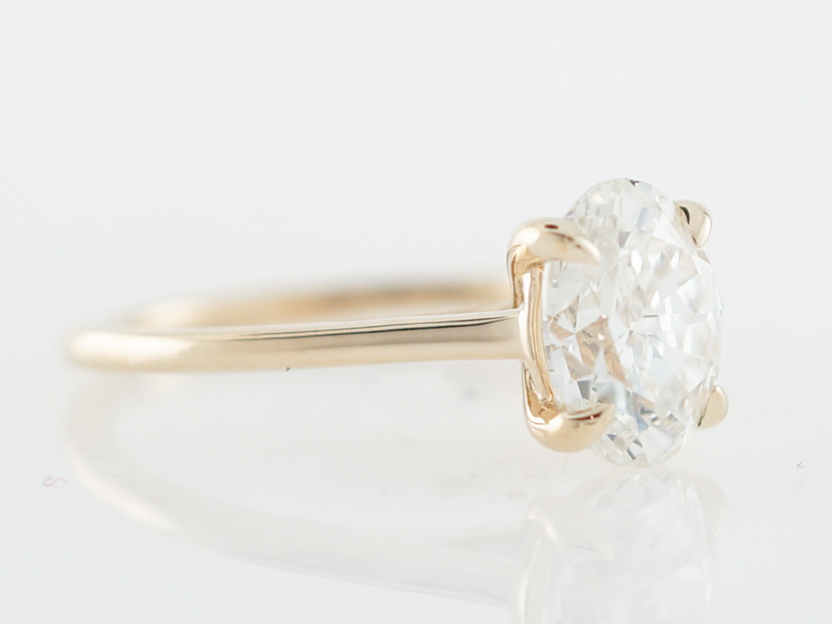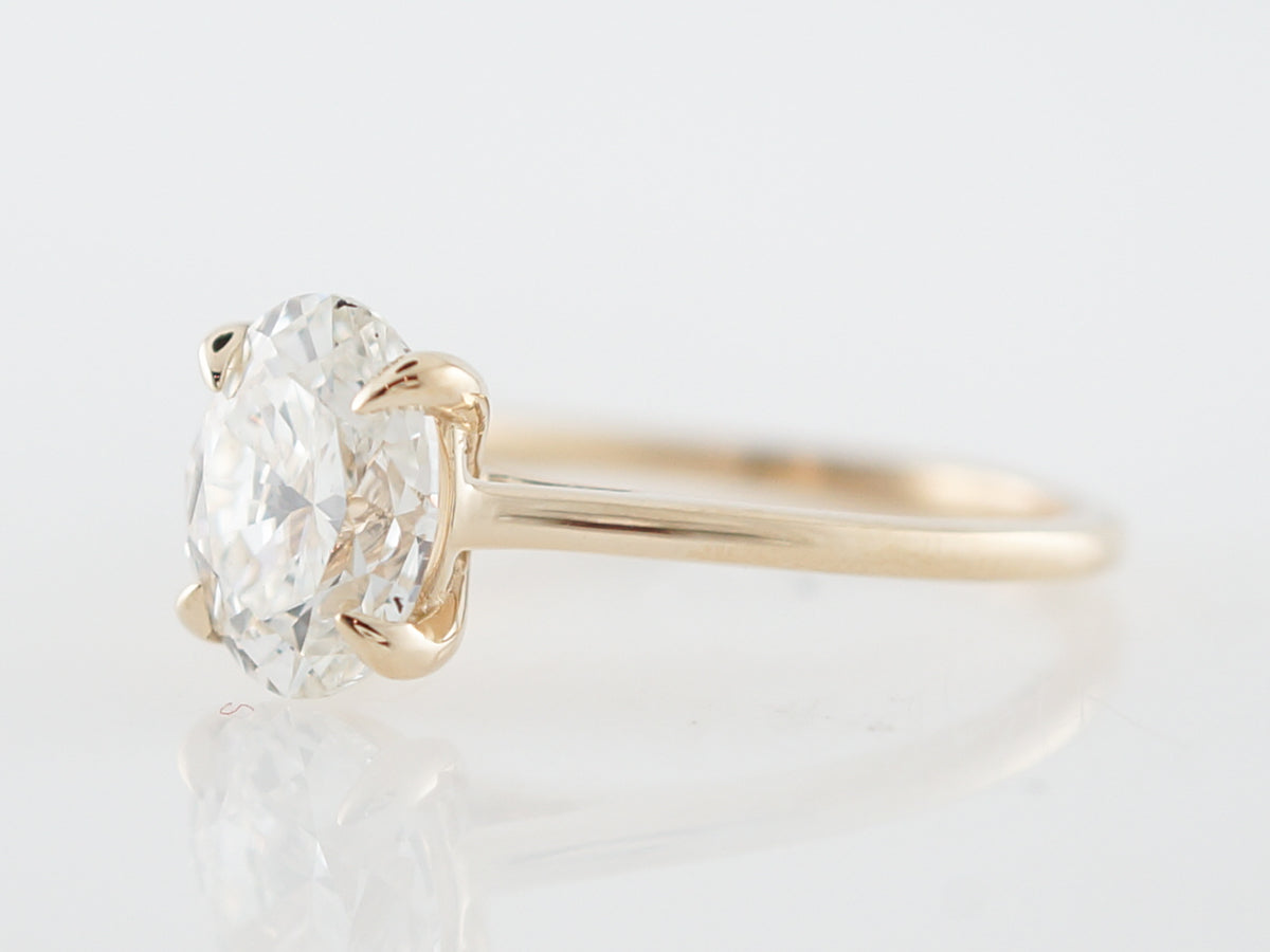 Classic, elegant, and simple. This gorgeous modern engagement ring is the ultimate solitaire, with a 2.02 carat GIA certified oval cut diamond. The diamond is held in place by four prongs and the stone is in full view, allowing for maximum light refraction. The yellow gold band is thin and easy to wear, making this ring a perfect option!