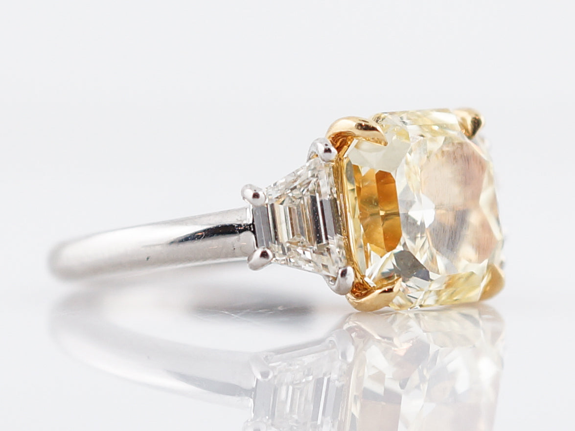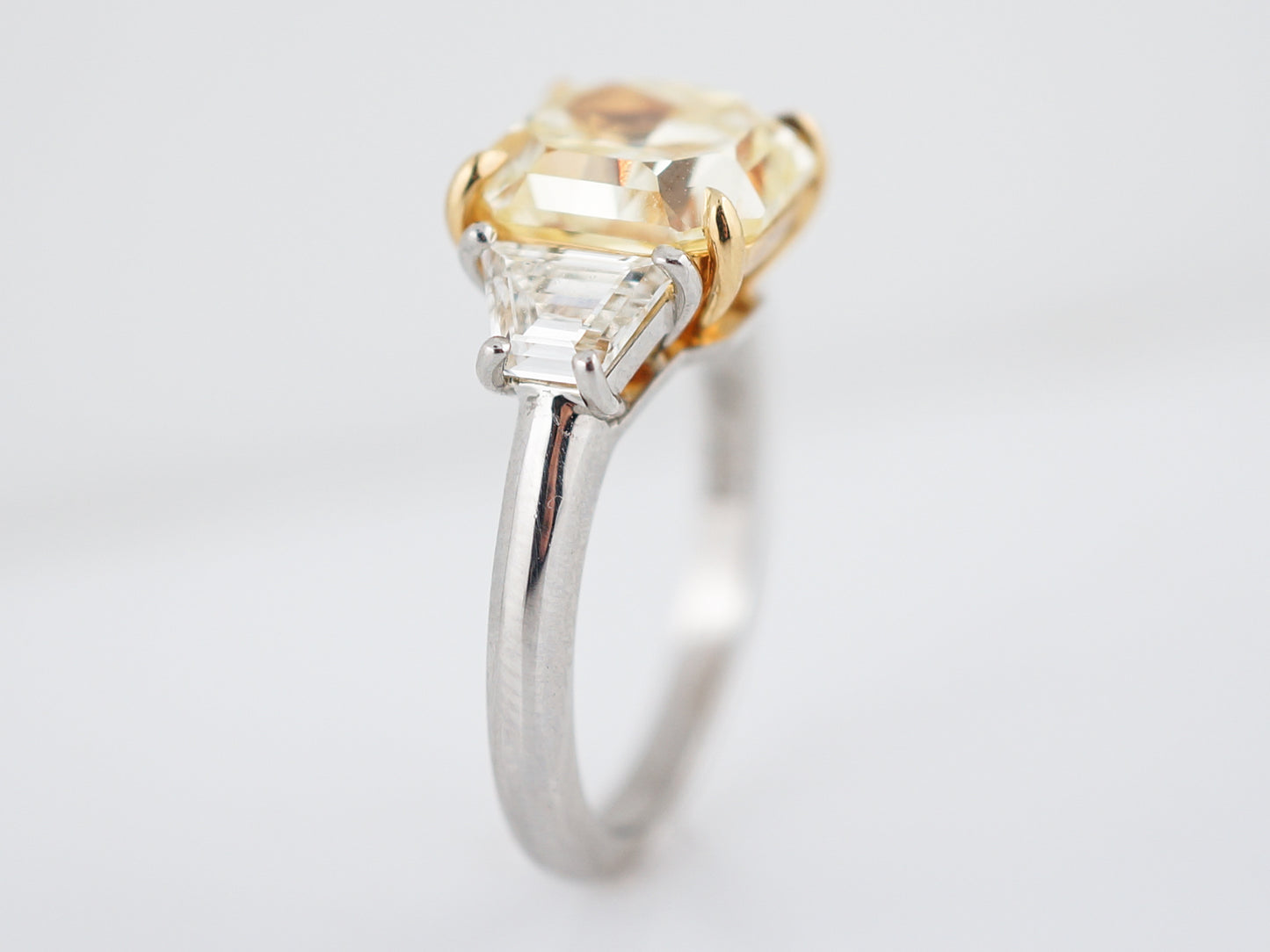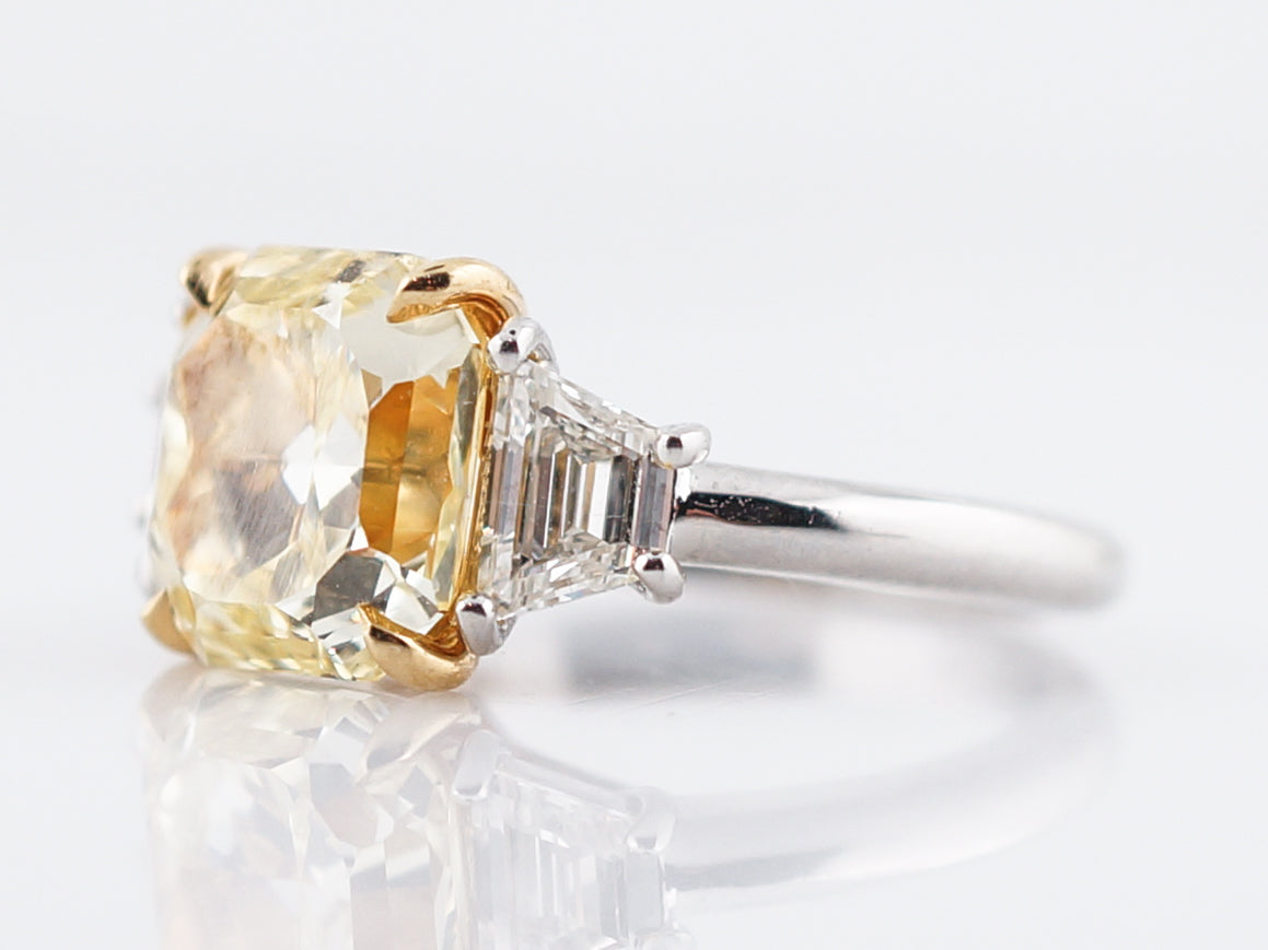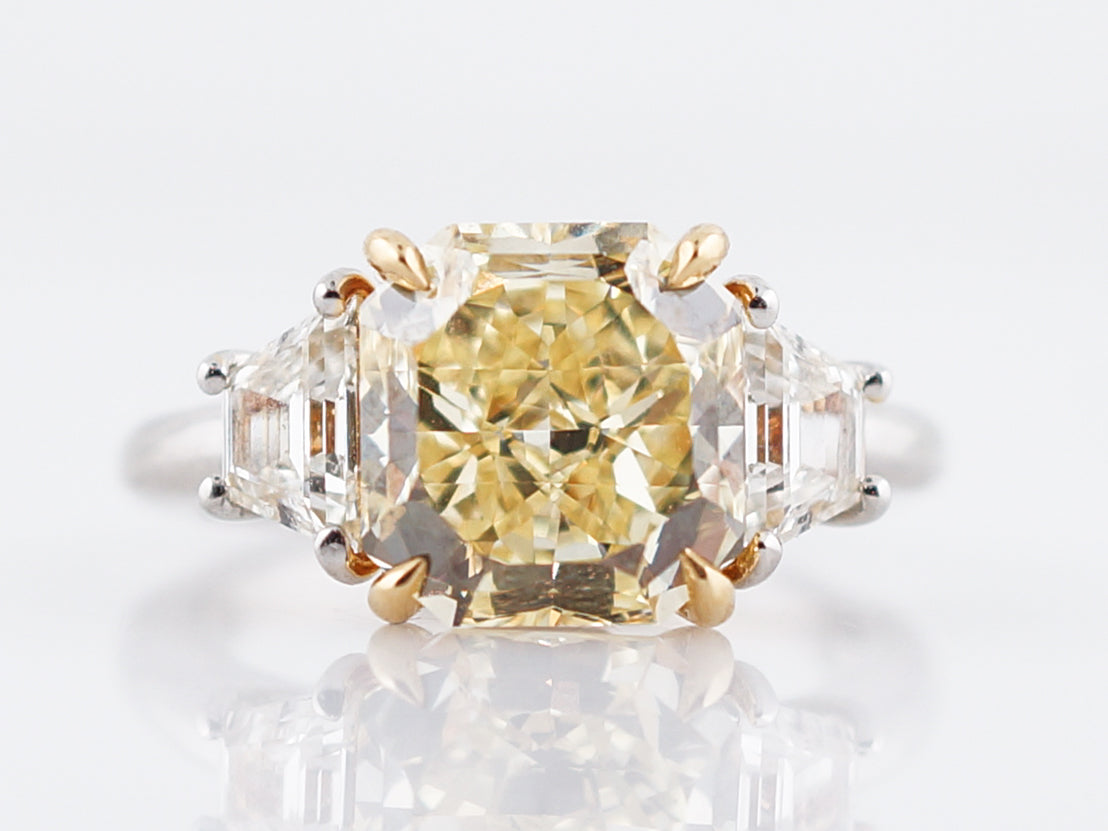 This modern custom engagement ring is beyond stunning. The center diamond is a GIA certified 4.13 carat yellow modified square step cut and is absolutely striking. The center diamond is held in place by four yellow gold prongs and is accented by two (2) step cut trapezoid diamonds which gives the ring a unique a wonderful geometric shape. The mounting is done in platinum and rounds out this magnificent statement piece.