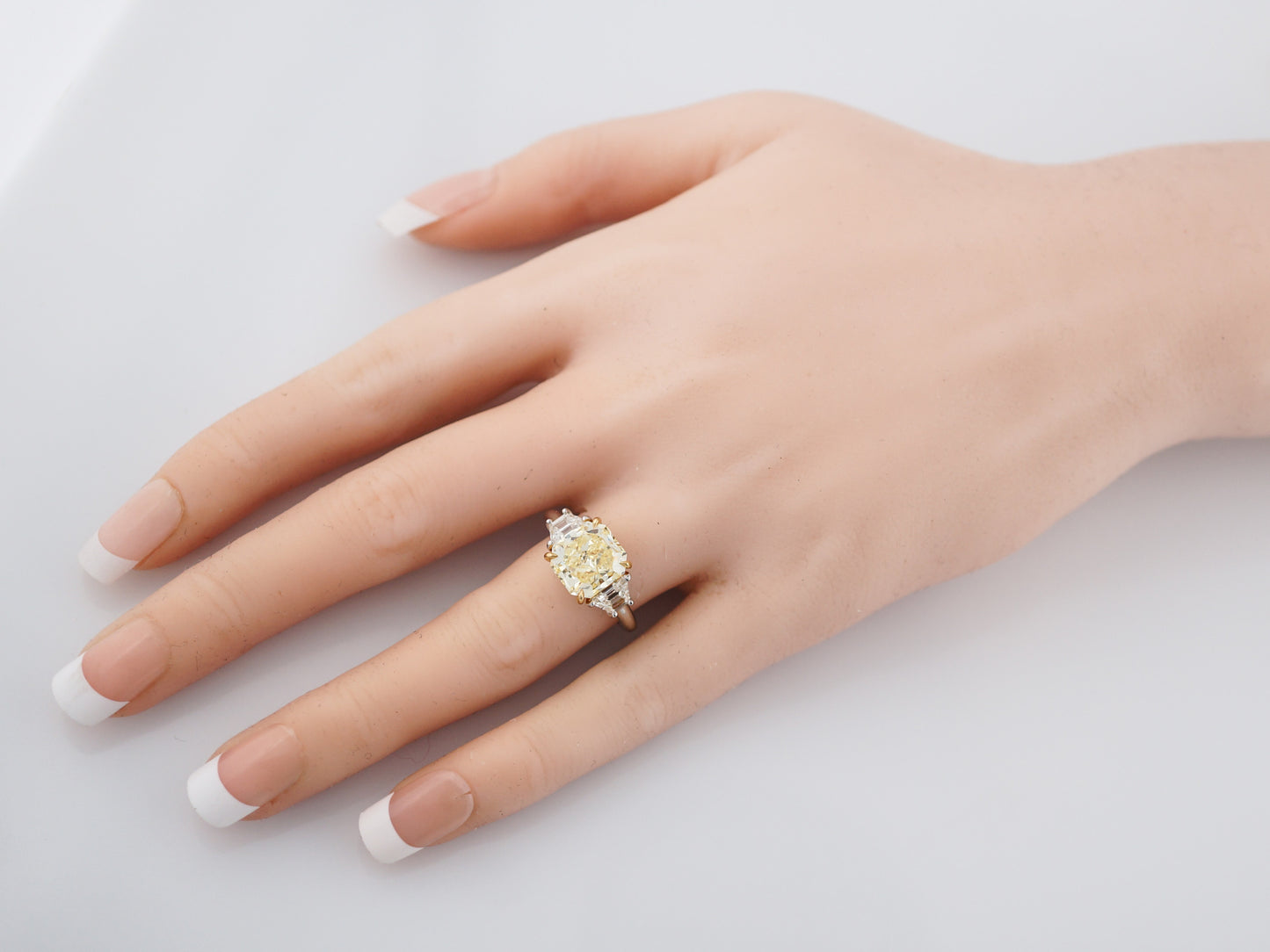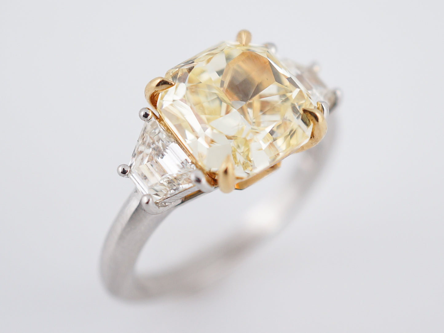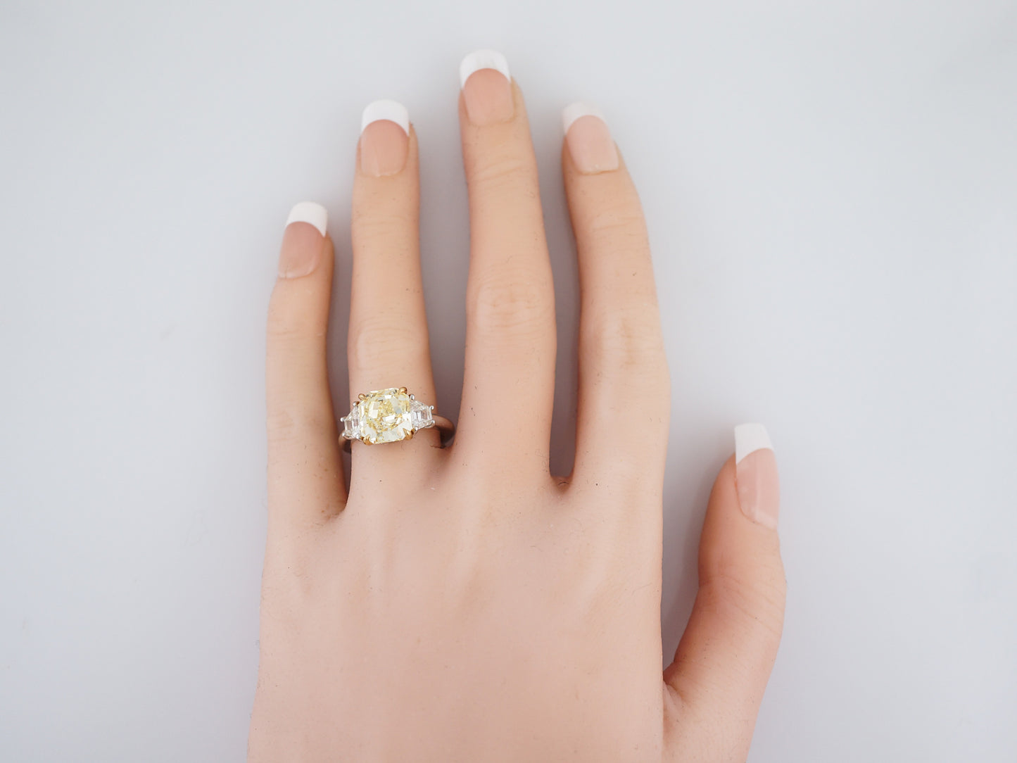 This modern custom engagement ring is beyond stunning. The center diamond is a GIA certified 4.13 carat yellow modified square step cut and is absolutely striking. The center diamond is held in place by four yellow gold prongs and is accented by two (2) step cut trapezoid diamonds which gives the ring a unique a wonderful geometric shape. The mounting is done in platinum and rounds out this magnificent statement piece.