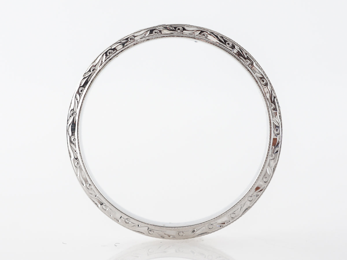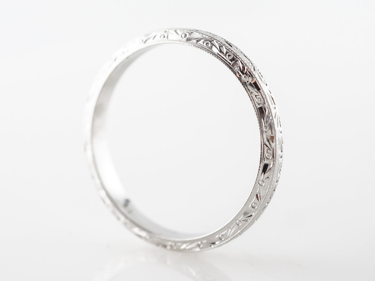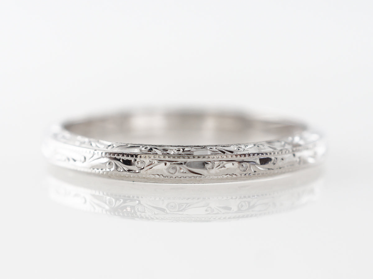 Engraved Antique Art Deco Wedding Band in White Gold. This vintage Art Deco orange blossom wedding band is made in 18 karat white gold. It has an orange blossom pattern that that runs the length of the band and is bordered by milgrain detail. The orange blossom has long been associated with the bride, and has traditionally been incorporated in bridal sets. This band would pair well with an engagement ring or make a great addition to a stack of bands.