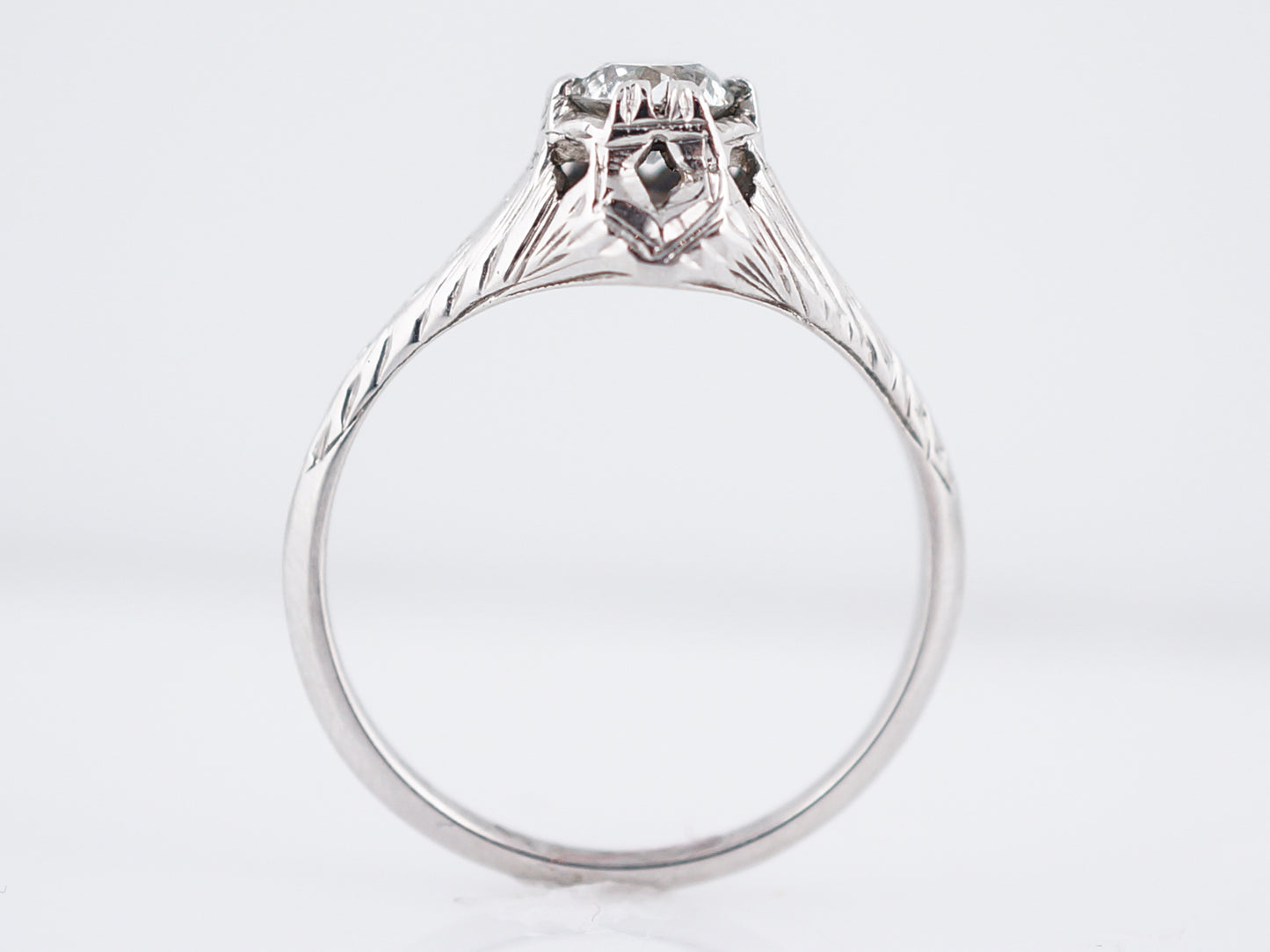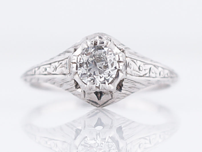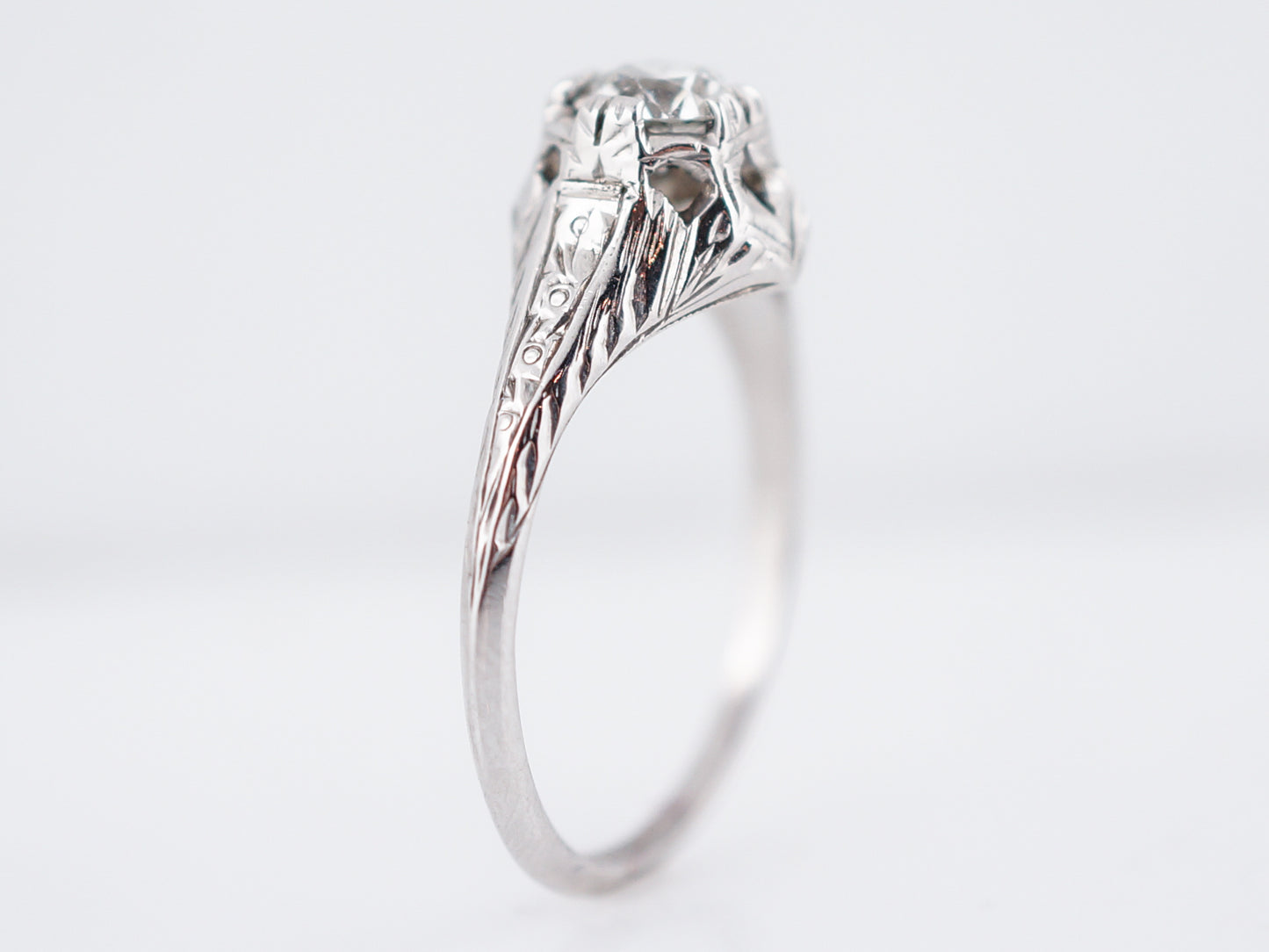 A classic beauty with a one of a kind style! This sparkling Art Deco diamond solitaire features a .42 carat old European cut diamond in 18 karat white gold. The center diamond rests in a four (4) split-prong filigree head. The mounting features a scrolling repousse design and offers an interesting texture. This elegant solitaire has multiple desirable elements of antique designs. Hallmarked 18K indicating that it is 18 karat white gold. An engraved diamond ring to admire throughout the years.