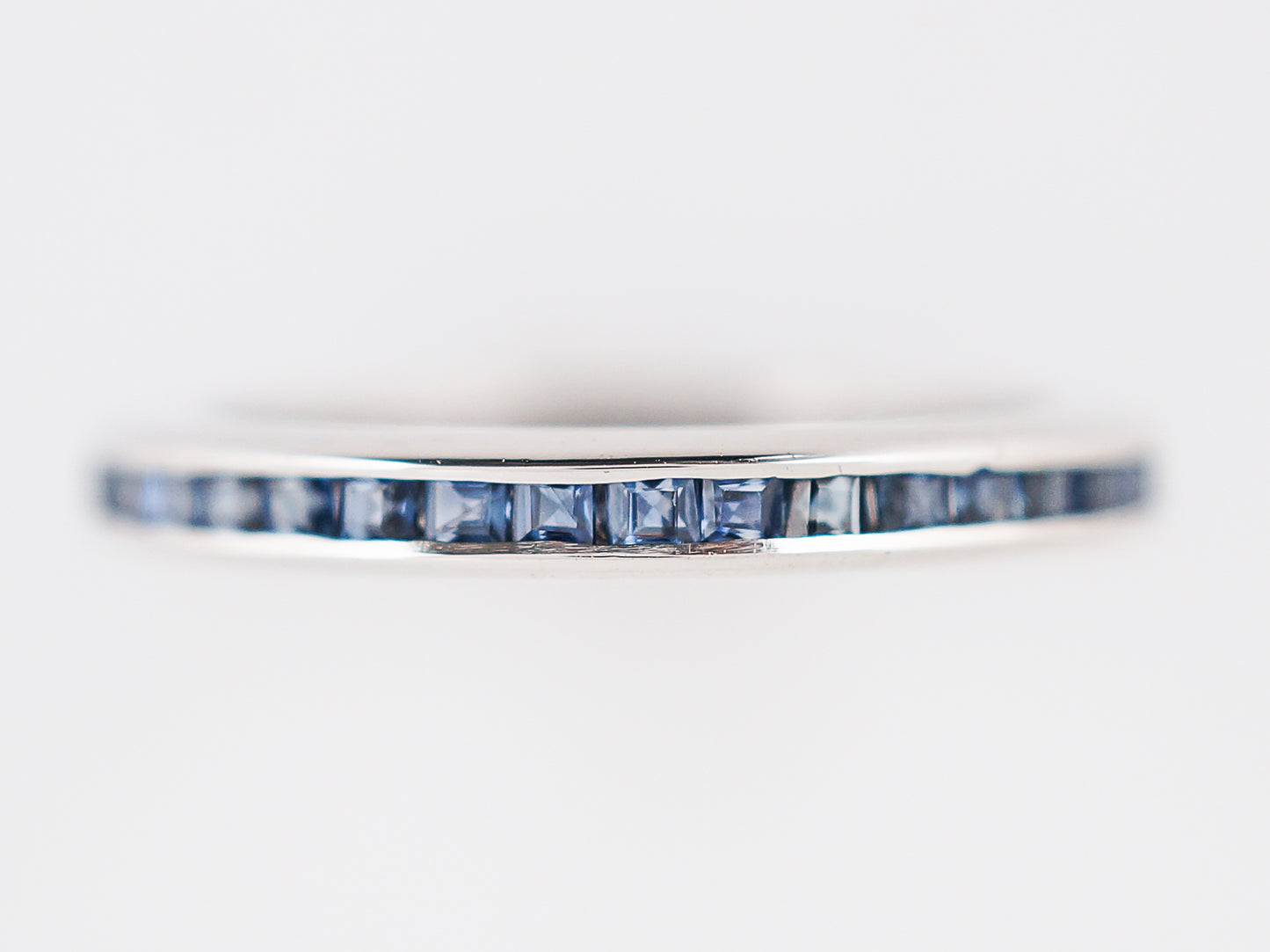 This blue sapphire band is unique in that it is made with square shaped stones giving it a cool, geometric look. The gemstones are channel set into the 14k white gold ring. This Modern eternity band would make a great wedding band and would also add a fun pop of color to a ring stack.