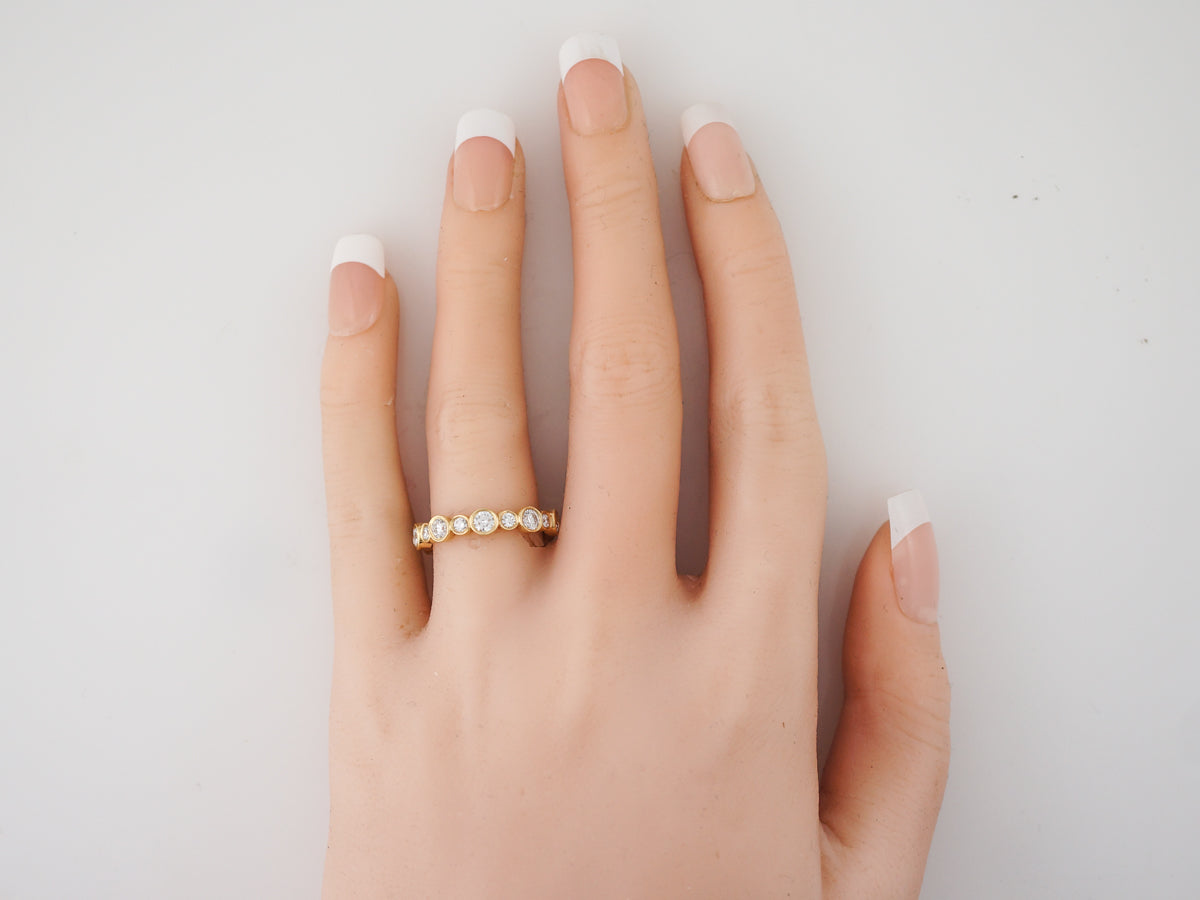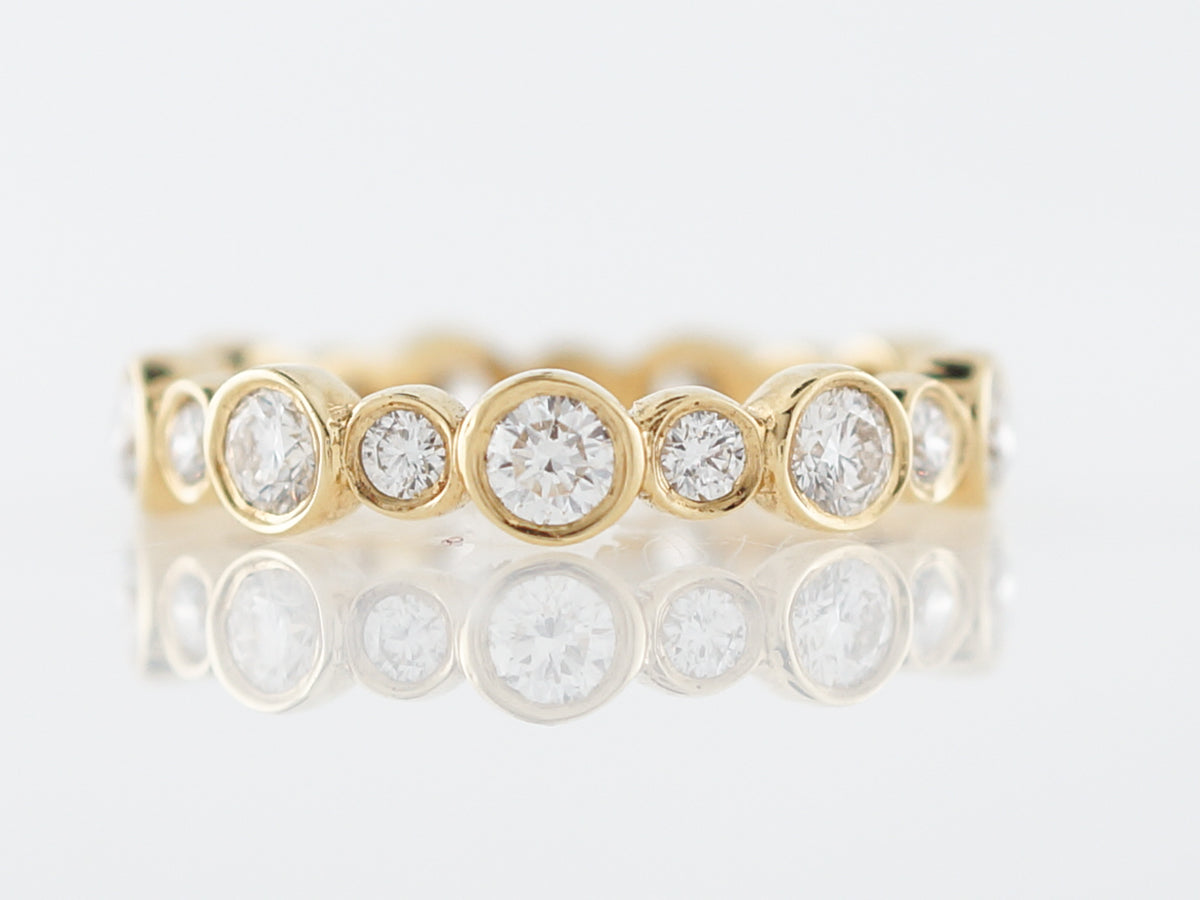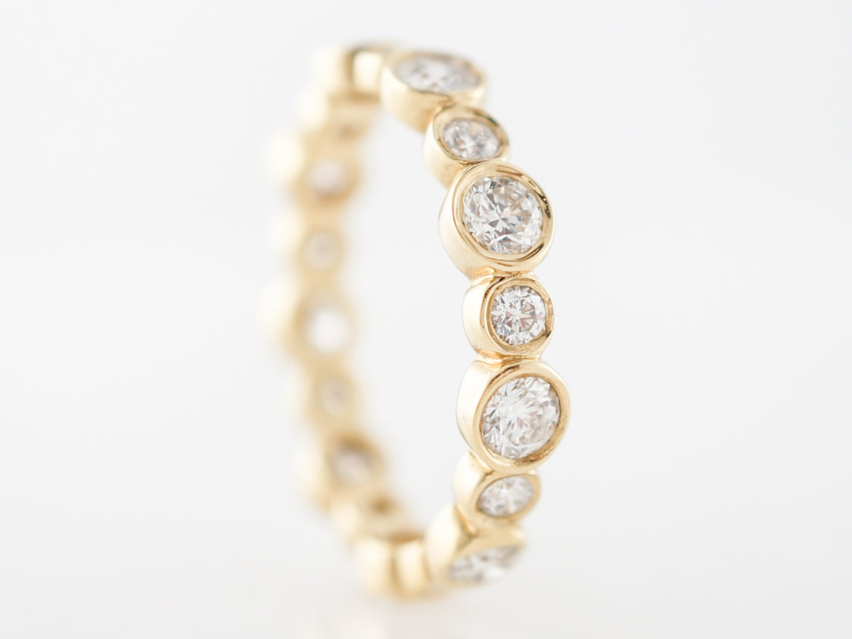 This modern eternity wedding band features 1.29 carats of round brilliant cut diamonds. The diamonds are bezel set and alternate in size, creating a unique look yet still maintaining excellent wearability. This ring would pair very well with an engagement ring or would wear well on its or or in a stack of bands.