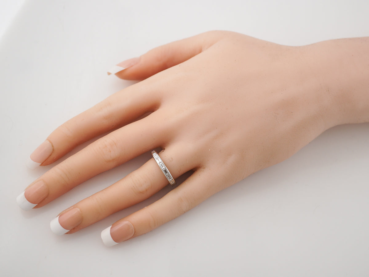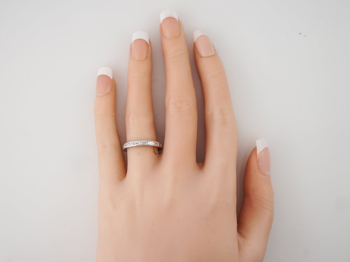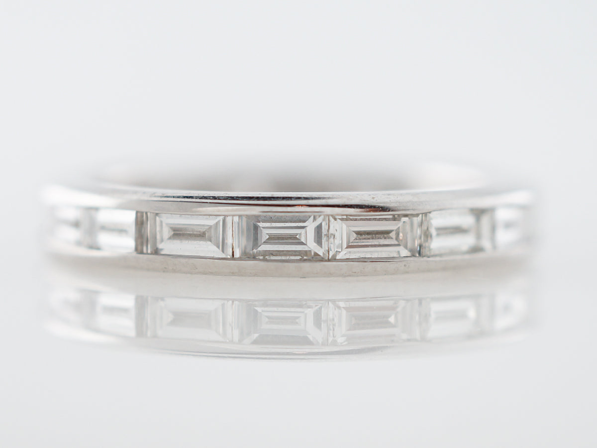 This modern wedding band has eighteen (18) horizontally set baguettes running the entire length of the band. Each diamond weighs .08 carat for a total of 1.51 carats. The diamonds are channel set into the platinum setting. This classic style eternity band would work with an engagement ring from any era. It would also add a cool geometric feel to a stack of bands.