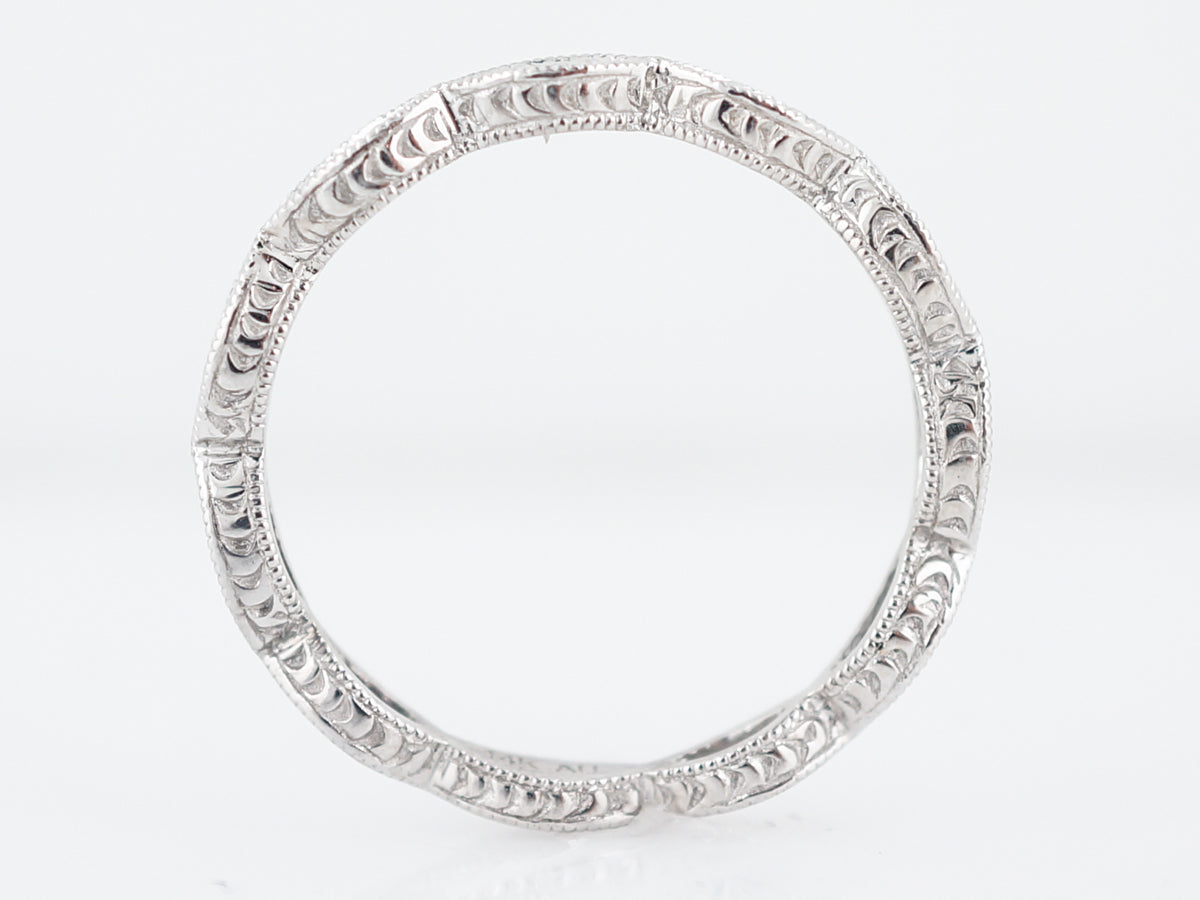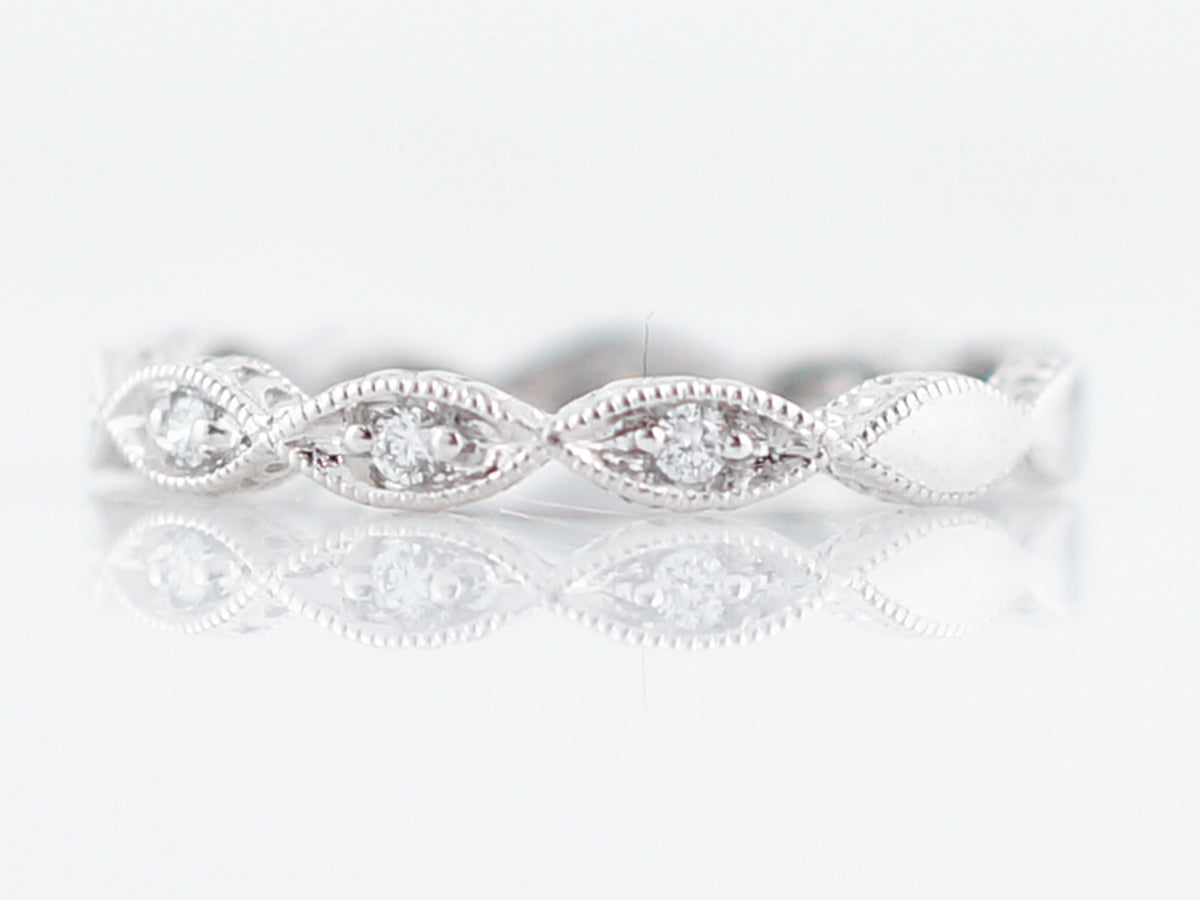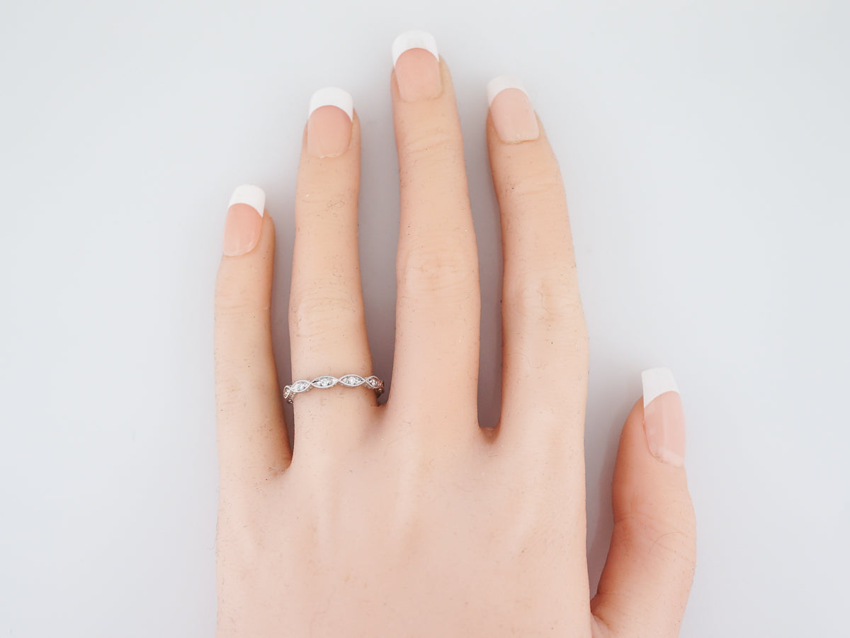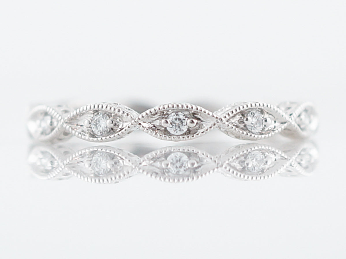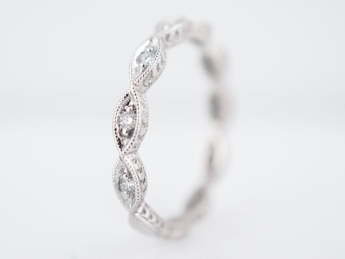 This modern 14K white gold eternity band with .12 carats of diamonds has a delicate feel with a hint of sparkle. The band itself has a repeating marquee shape design and a milgrain edging around its form. Inside of each marquis-like shape is a bead set diamond that brightens the overall design.