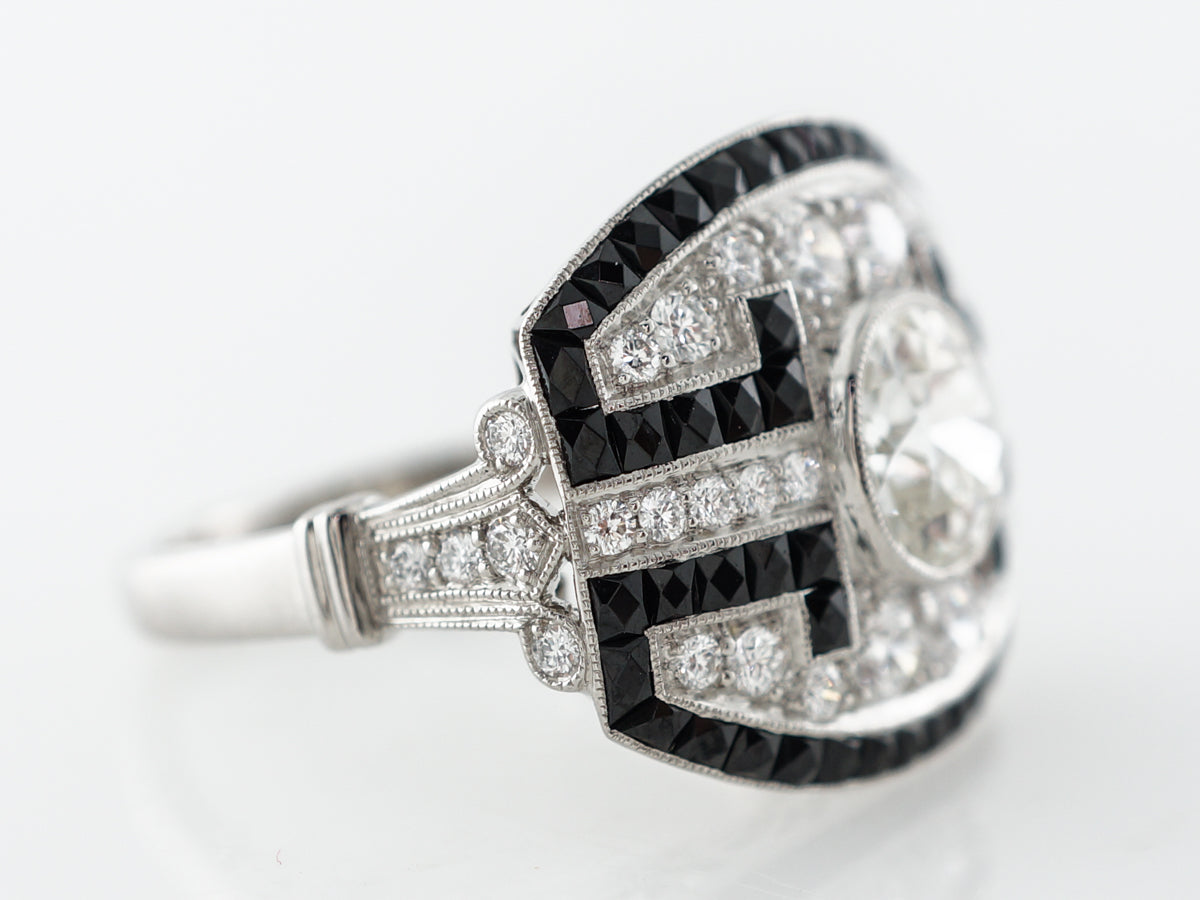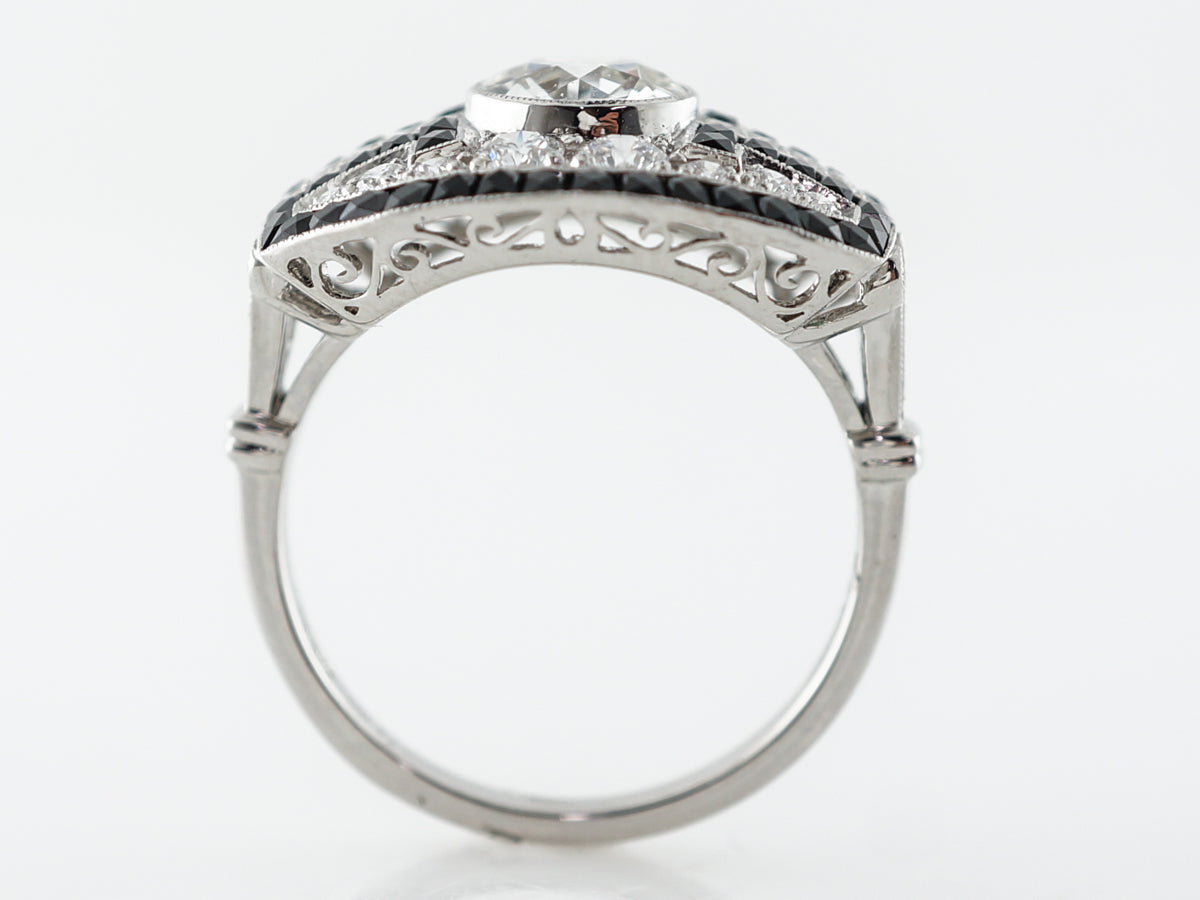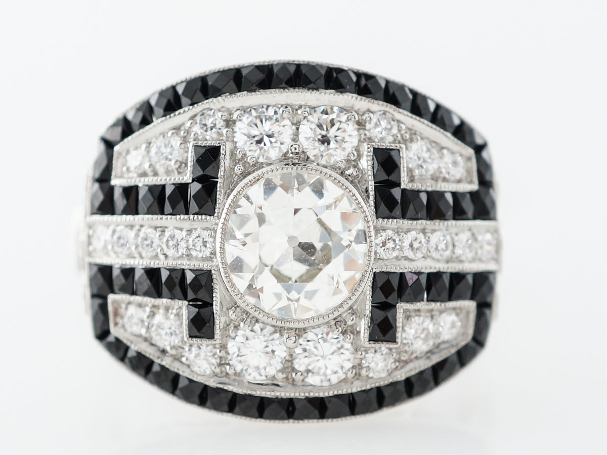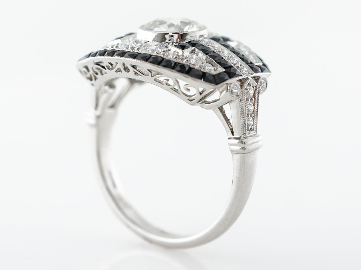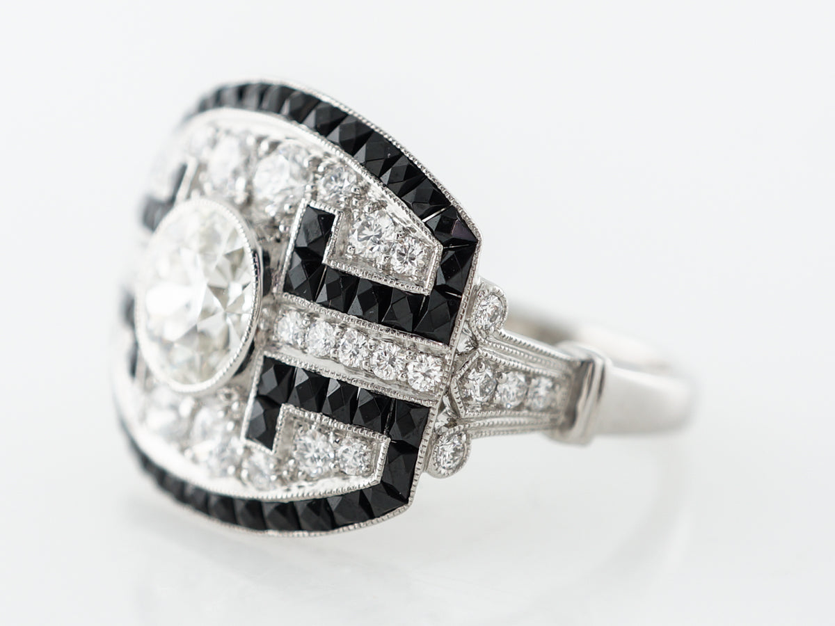 European Cut Diamond Onyx Accent Cocktail Ring. This modern cocktail ring features a .92 carat Old European cut diamond with .55 carats of accent diamonds and 1.15 carats of square cut onyx all set in platinum. The center diamond is bezel set and surrounded by an incredible array of accent stones. The channel set onyx follows two mirrored paths that contain many of the pave diamond accents. The shoulders of the ring also have amazingly detailed accent stone settings, with milgrain borders around an arrow shaped cluster. If you like the idea of a black and white cocktail ring, take a look at this stunner!