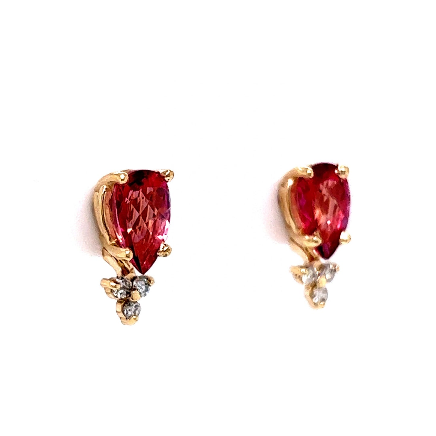 Romantic and elegant – these pink tourmaline stud earrings feature accent diamonds in 14 karat yellow gold. Two (2) .73 carat faceted pear cut tourmalines are set in prong baskets. The tourmalines feature a bright, rosy pink hue. A collection of six (6) white diamonds accent the tip of the pear cut tourmalines. Modern Striking. Finished in high polished 14 karat yellow gold. Lovely in every way.