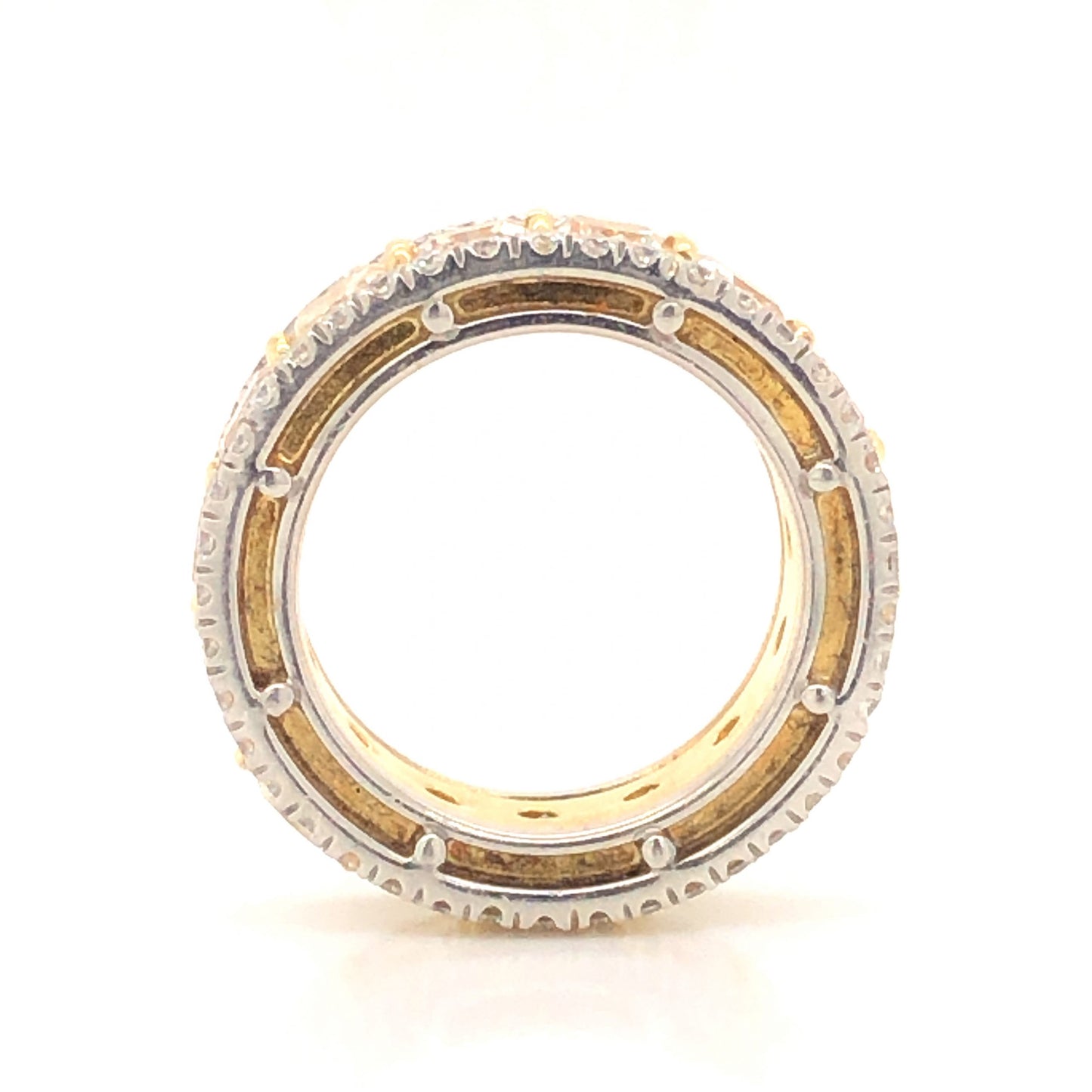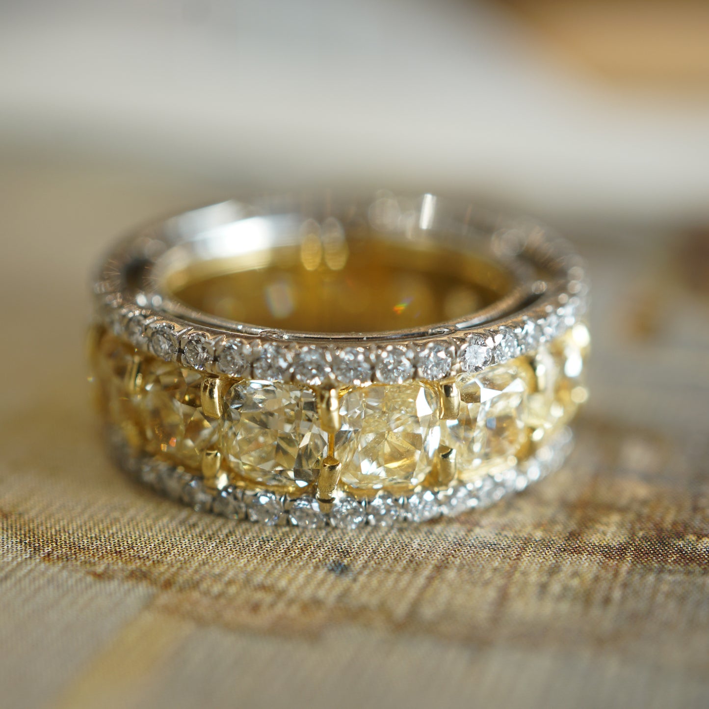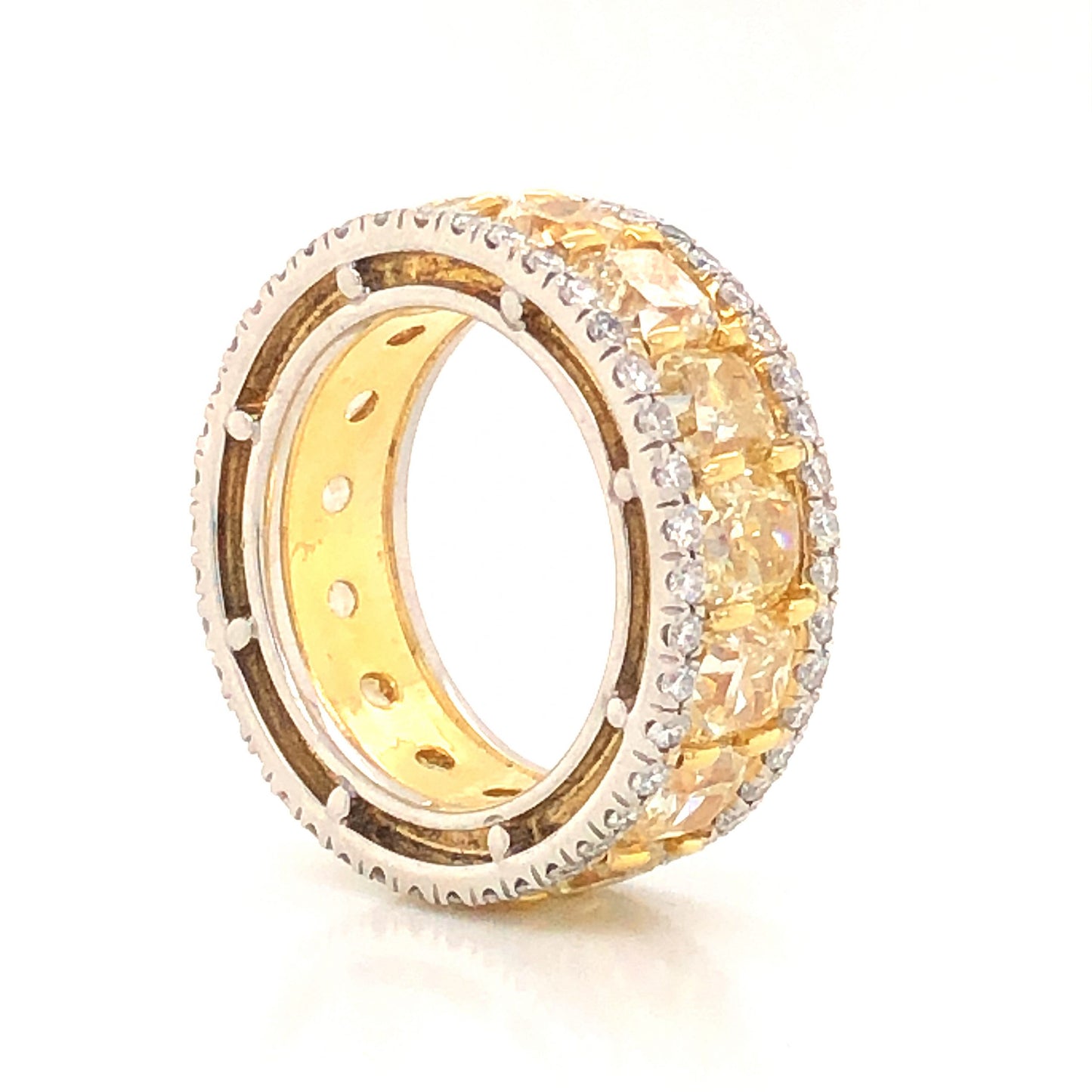 This dazzling cocktail ring features 10.70 carats of fancy yellow diamonds and white diamond accents in platinum and 18 karat yellow gold. Fifteen (15) .713 carat diamonds, with a light canary yellow hue, are set in protective yellow gold claw prongs. Eighty (80) .021 carat near colorless diamonds line the trim of the thick band. The diamonds are eye clean and highly brilliant, bringing a sunshine brightness and complementing two-tone color palate of the mixed metal composition.