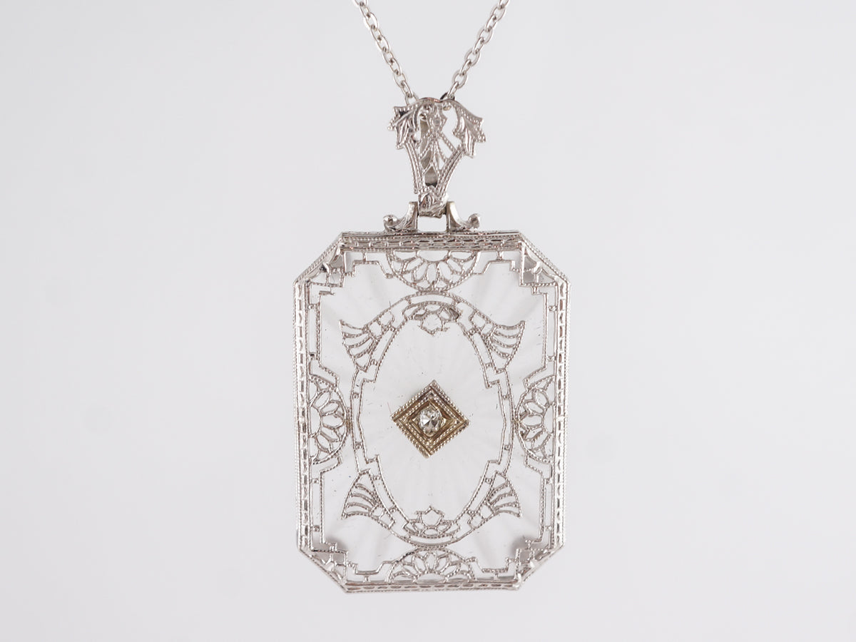 Filigree Art Deco Necklace w/ Single Cut Diamond. This magical pendant from the Art Deco period contains a slab of camphor glass with a .03 carat diamond set in the center and finished in 14 karat white gold. Camphor glass comes from a process of treating clear glass with hydrofluoric acid vapors to create a frosted appearance. Just inside the border of the pendant there is delightful filigree work that is reminiscent of an ornate window during the holidays.